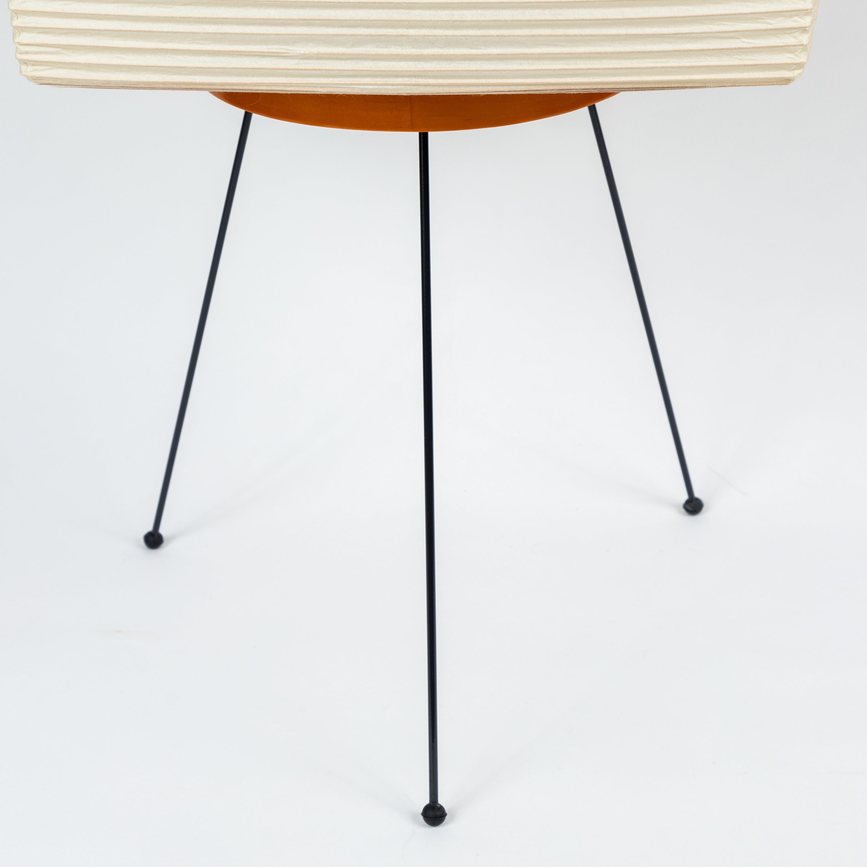 The shade is made from handmade washi paper, wood and bamboo ribs with authentic Noguchi Akari manufacturer's stamp. The lamp measures 24 inches from the feet to the top of the wire structure. The shade measures 13 inches at its widest point. The bulb casts a soft diffuse glow, providing a sculptural focal point in any space.
