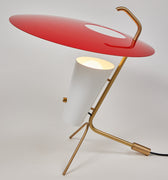 Originally designed by Pierre Guariche in 1953, this iconic lamp is newly produced in an authorized re-edition by Sammode Studio in France using many of the same small-scale manufacturing techniques and scrupulous attention to detail, materials and craftsmanship. Executed in brass and enameled metal.