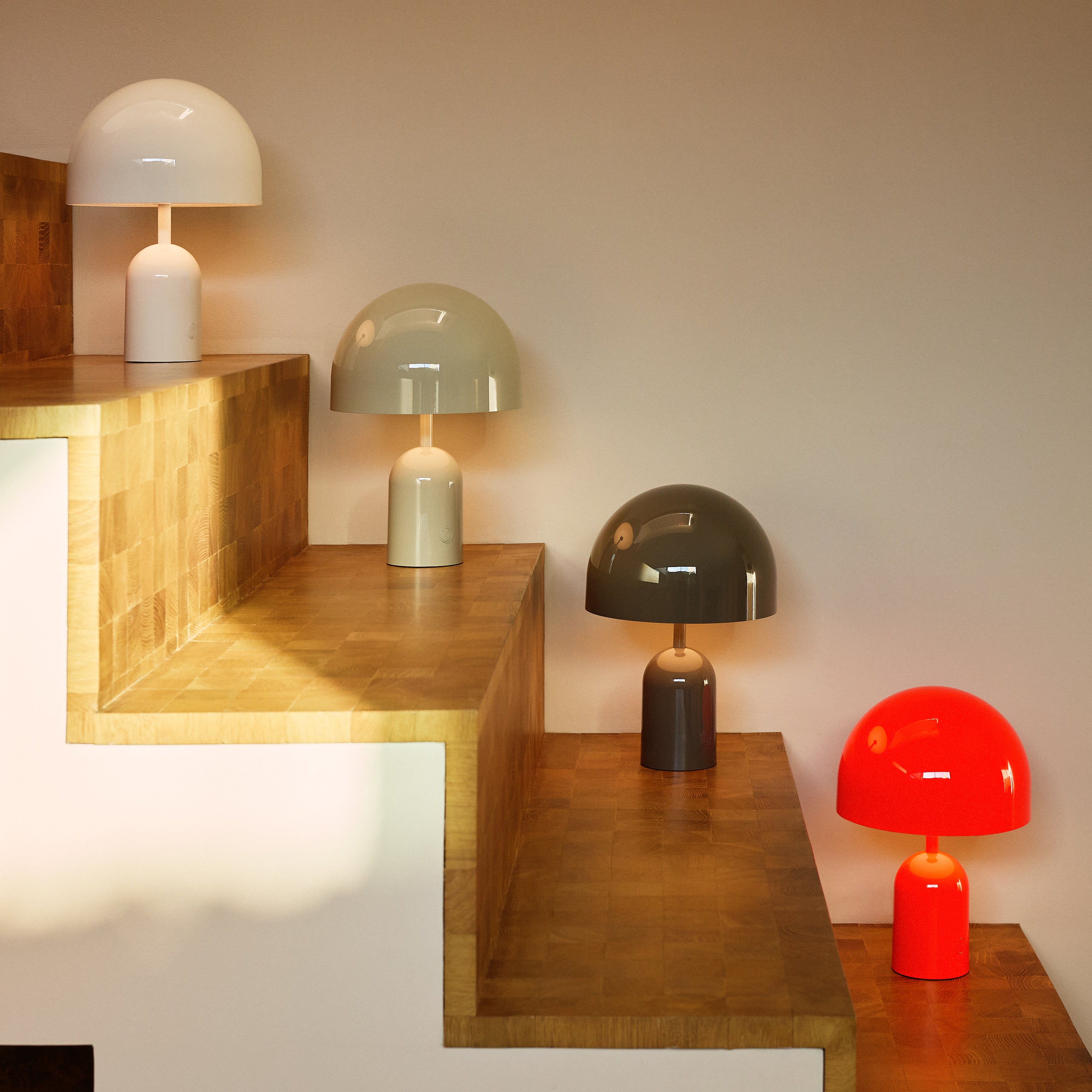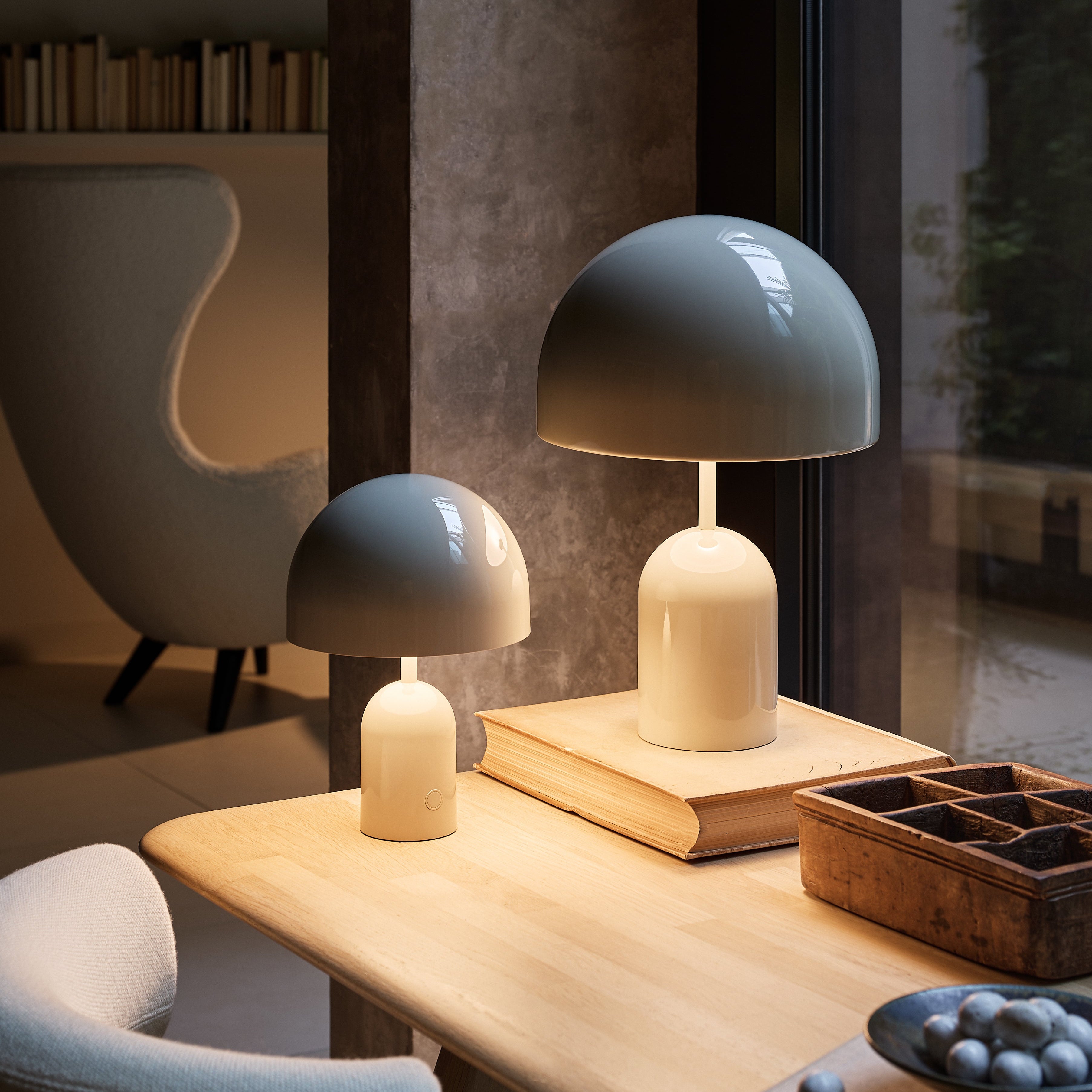 Taking its name from a classic dome shape, the Bell portable rechargeable table lamp is an exercise in reductionism. Designed in 2021, the Bell's geometric silhouette complements a wide range of spaces indoors and out. Executed in ABS with a high gloss finish, the interior light source from the integrated LED is dimmable and rechargeable. The Bell series includes a larger plug-in model, and can be mixed and matched to create playful arrangements of light.