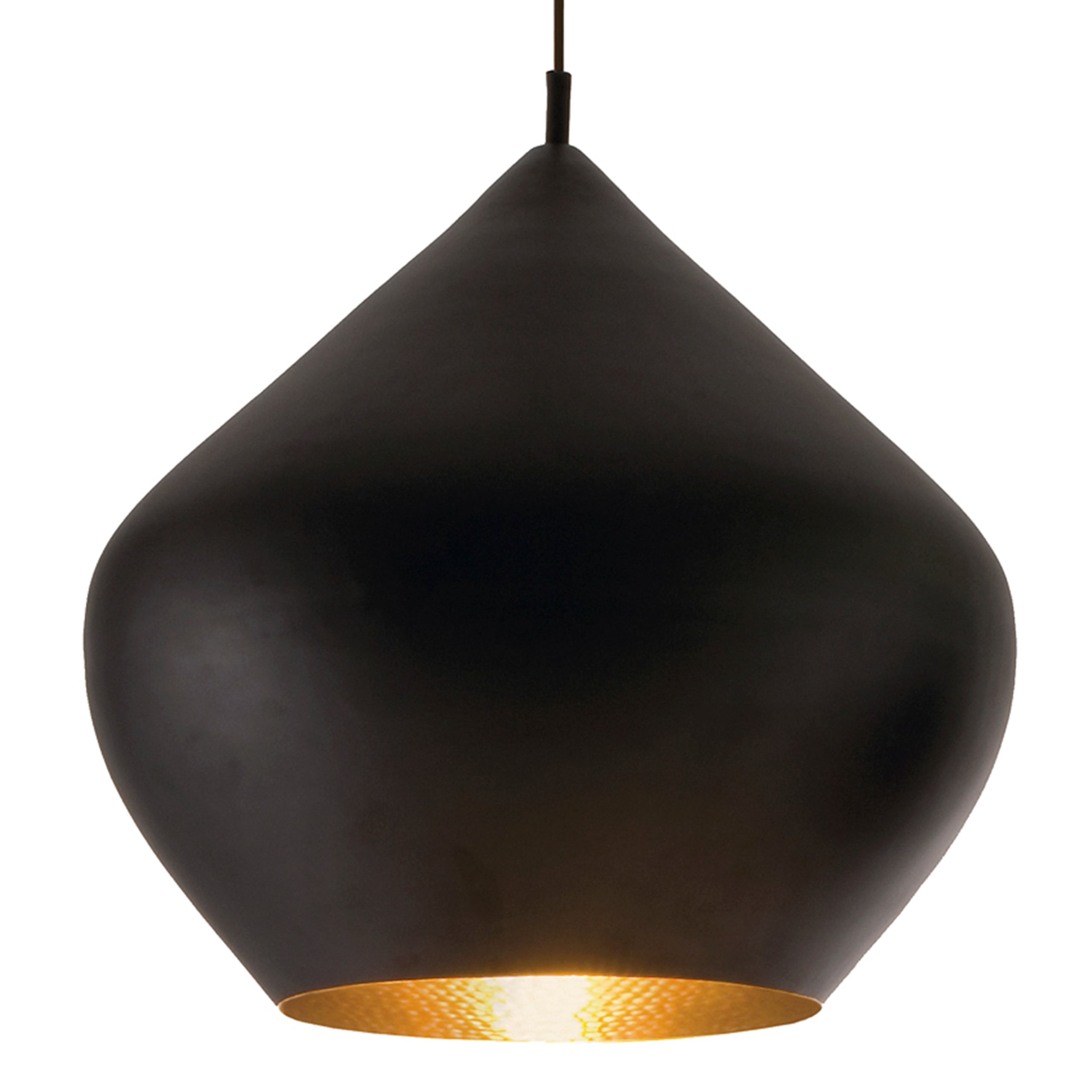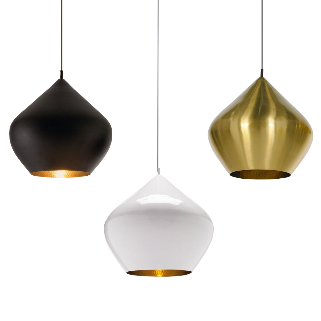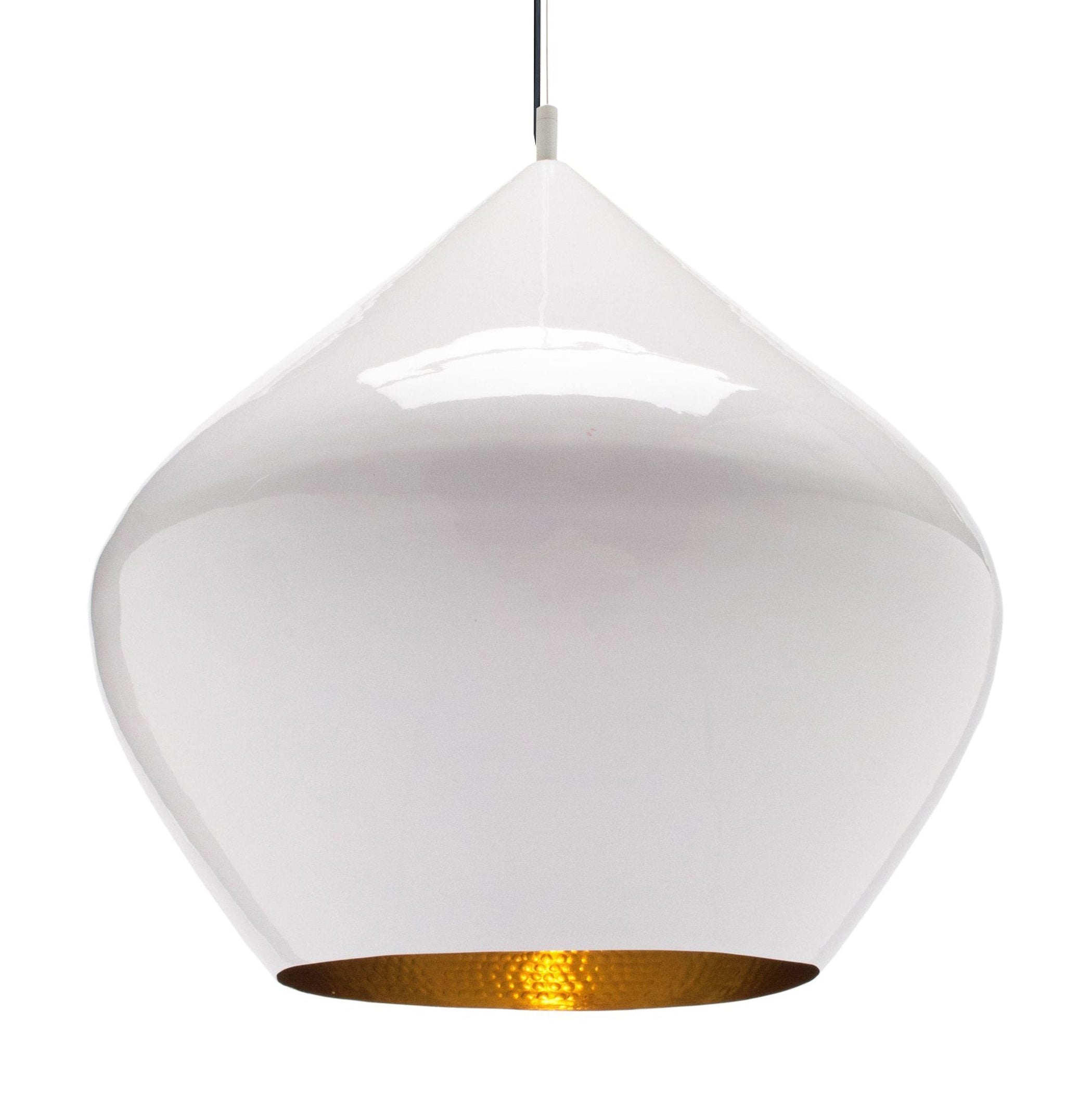 Price per item. Available in unlimited quantities in three finishes: Matte Black, Glossy White, or Brass. The pendant has a hammered brass interior on all three colors.