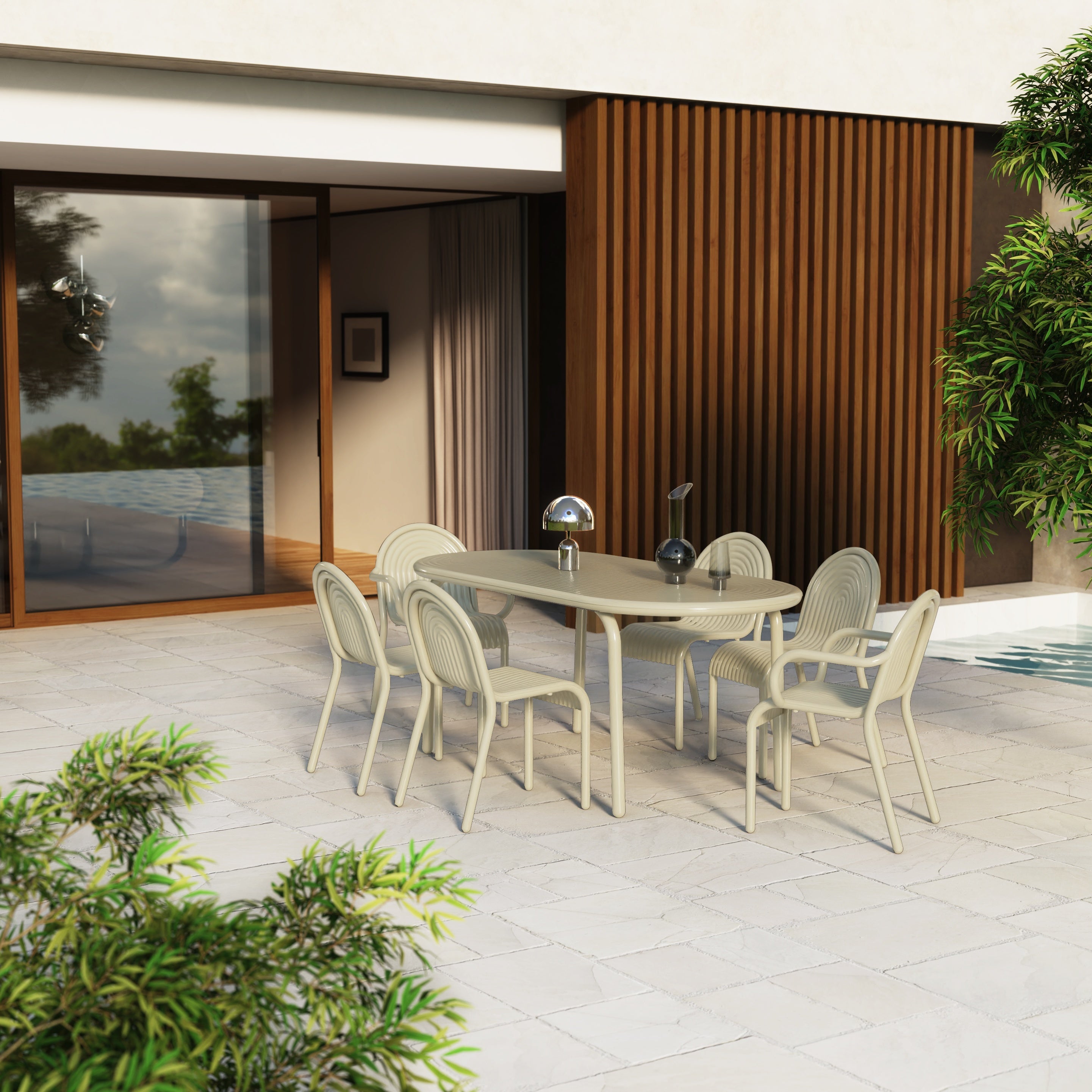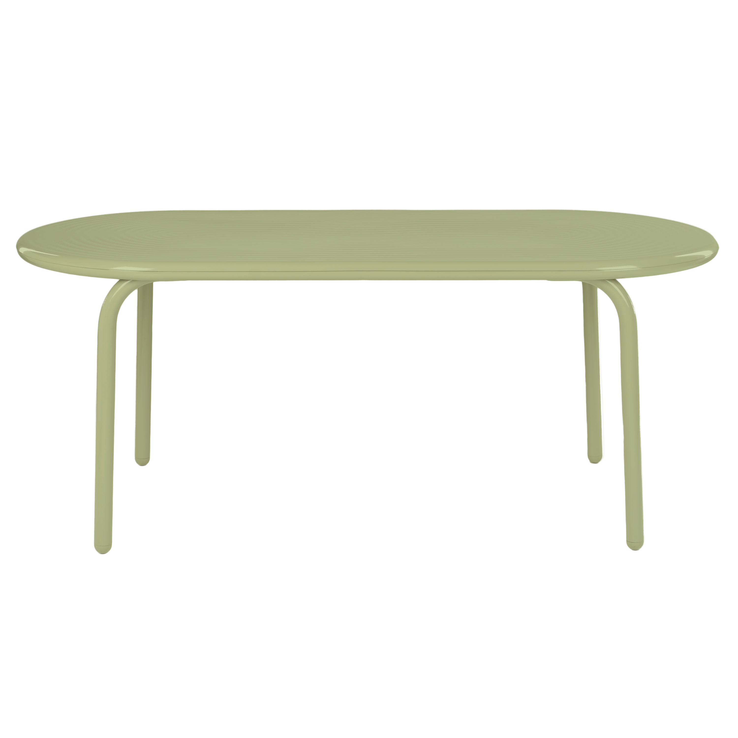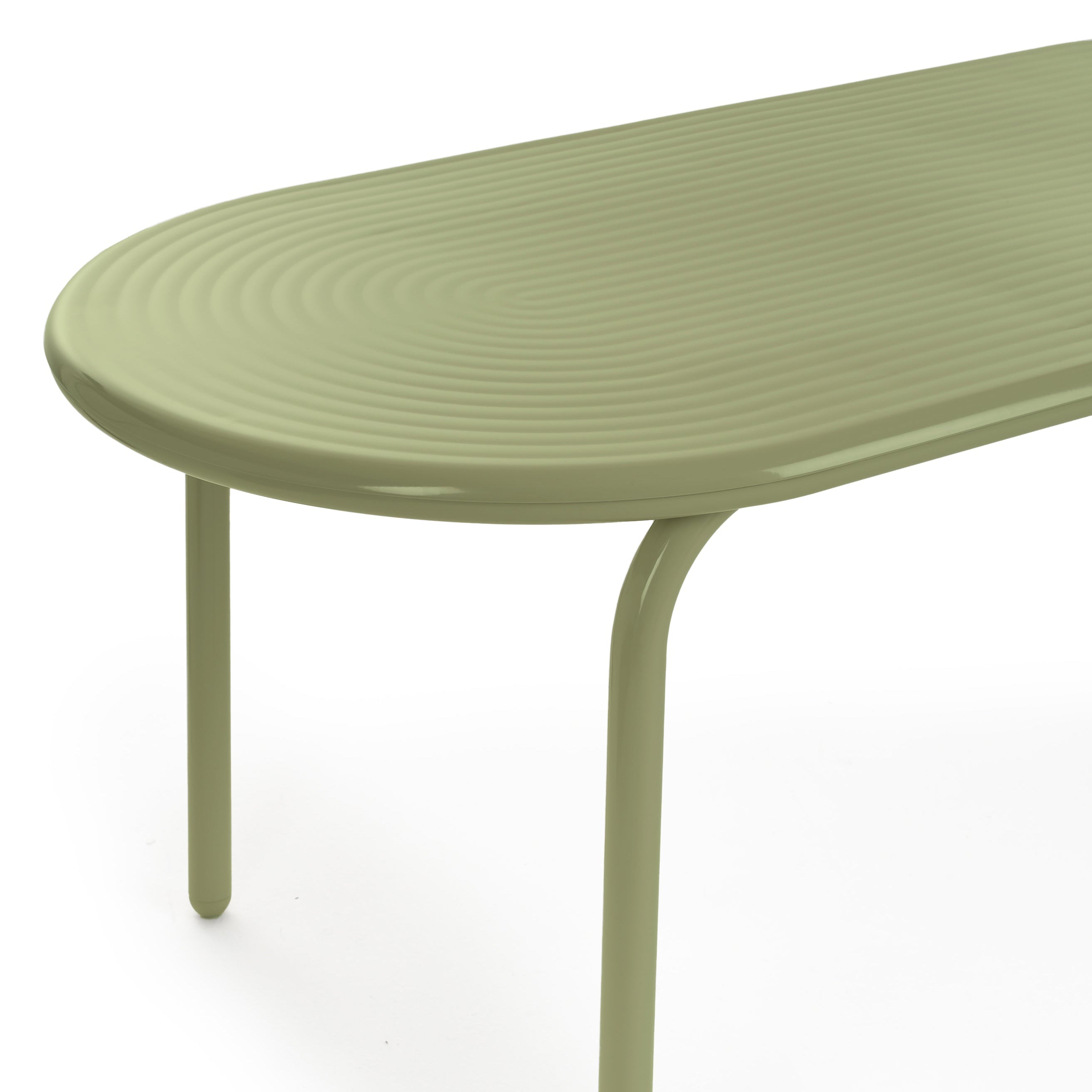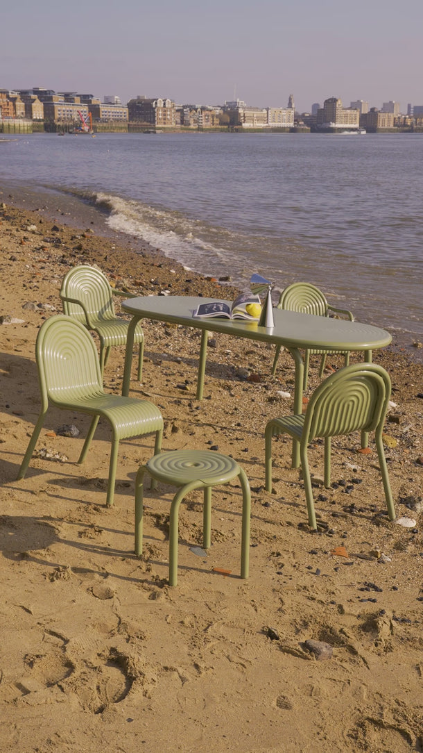 New in 2025, the Groove series is Tom Dixon's first outdoor furniture line. Executed in high-performance, durable aluminum, the entire Groove series is corrosion-resistant and built to withstand the elements. The oblong dining table is available in two powder-coated painted finishes. Inspired by Art Deco geometry, the Groove's curves make it as striking as it is practical. The top of the table is smooth, but the grooves remain visible for a distinctive effect.