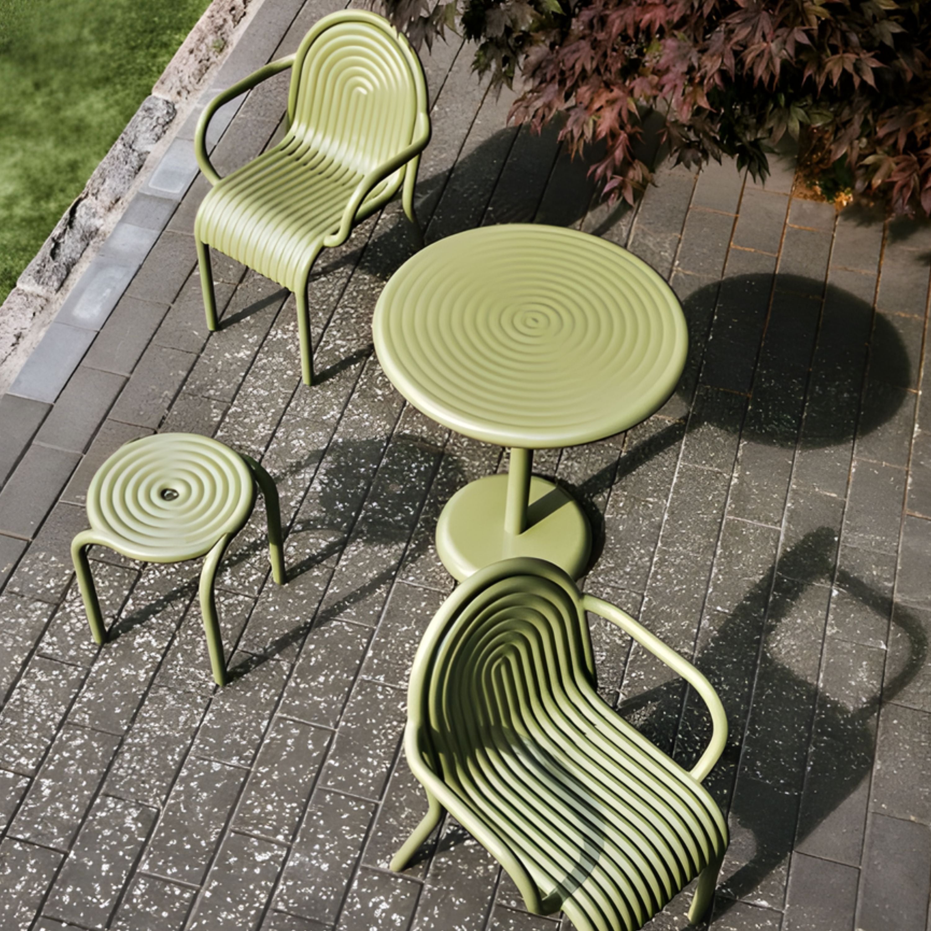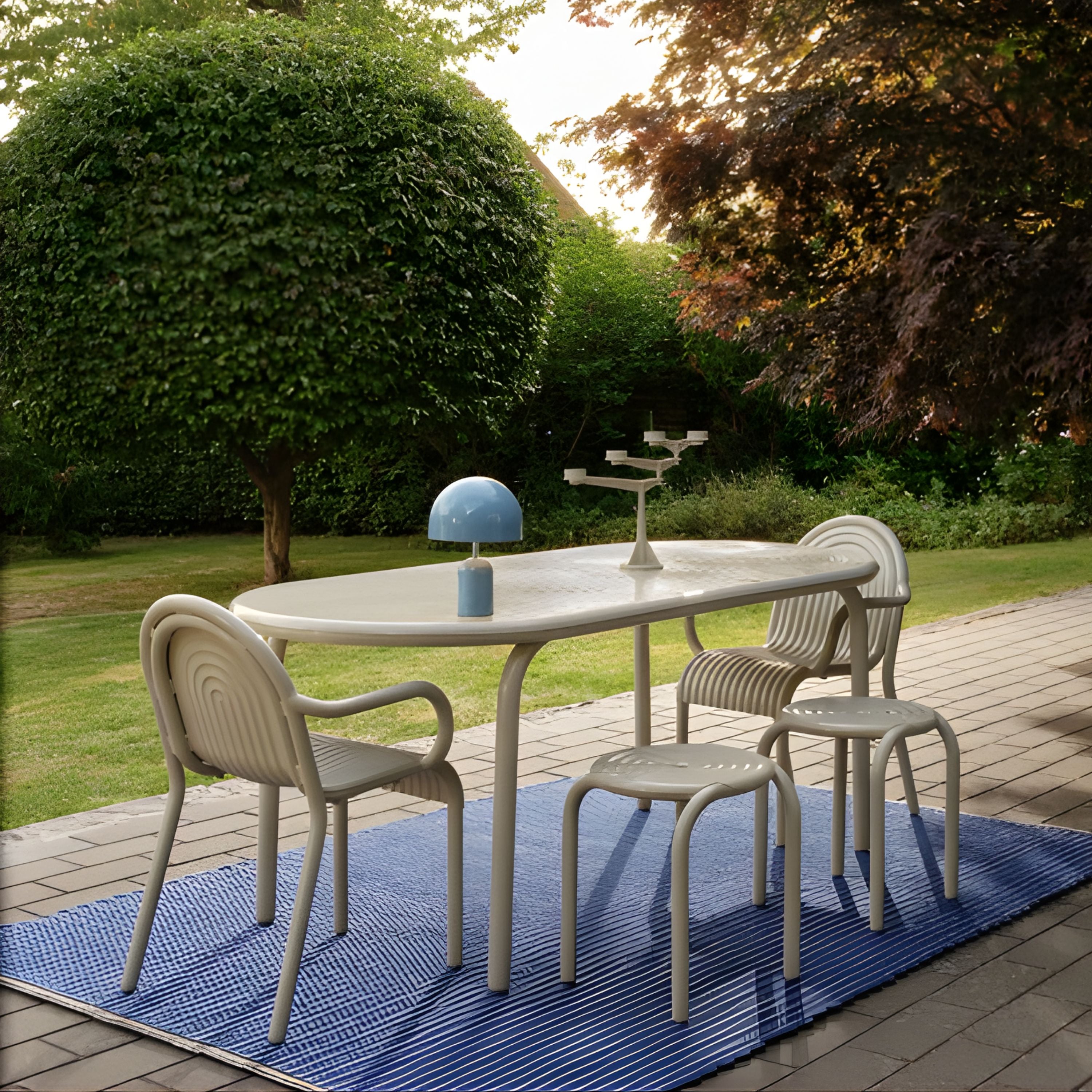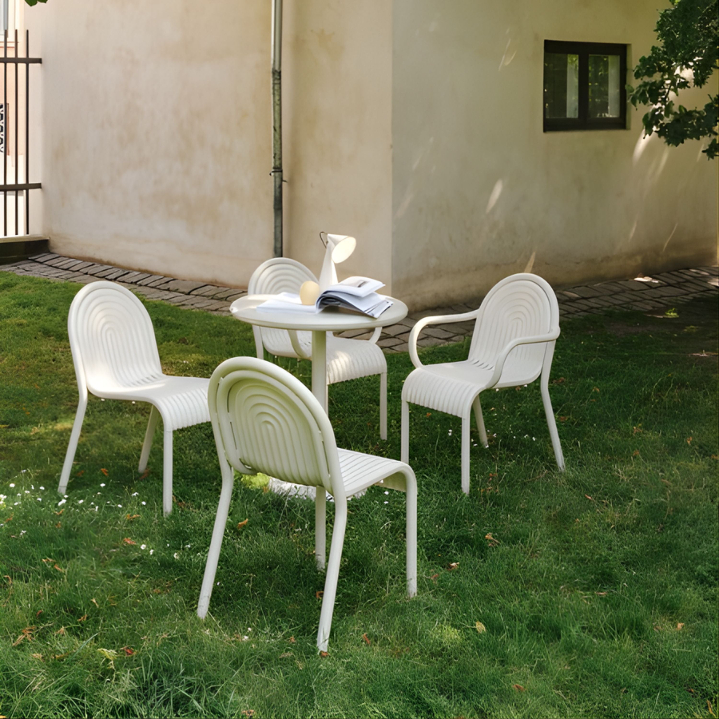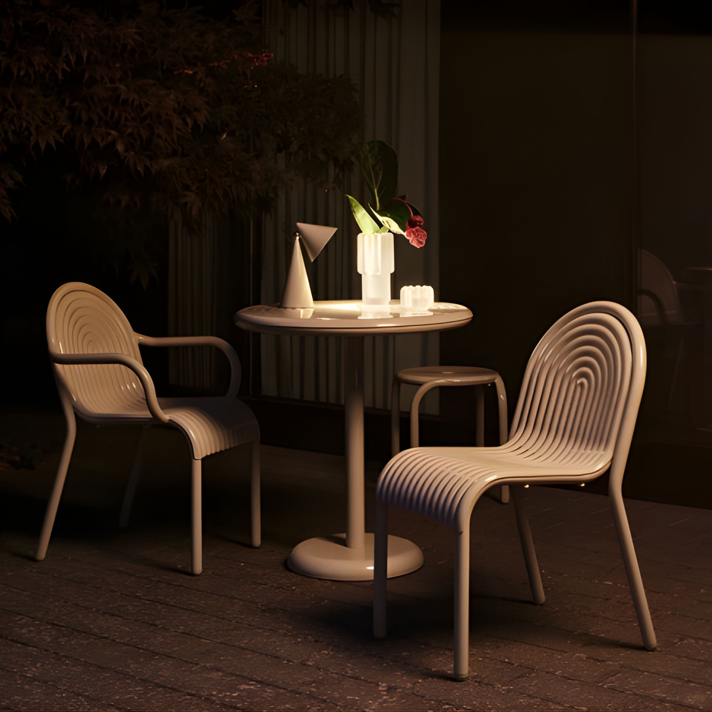 New in 2025, the Groove series is Tom Dixon's first outdoor furniture line. Executed in high-performance, durable aluminum, the stackable yet sturdy Groove chairs are corrosion-resistant and built to withstand the elements. Available in two powder-coated painted finishes. Inspired by Art Deco geometry, the Groove's curves make it as striking as it is practical.