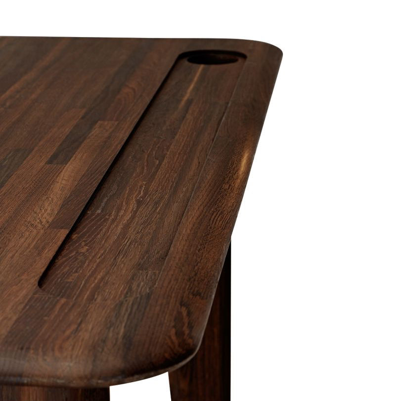 Executed in solid FSC-certified oak, Tom Dixon's Slab desk is constructed in simple geometric shapes that celebrate the natural beauty of wood. Each piece has generous proportions, solid materiality and is softened with a gentle radius edge. The wood's surface is deeply brushed to expose its natural grain and finished with a matte lacquer. Inspired by the archetypical Victorian school desk, this contemporary work station is equally comfortable as a hotel room desk or a dressing table. The traditional inkwell space is transformed into a cable management hole, and a deeply machined groove has been added for pens and accessories.