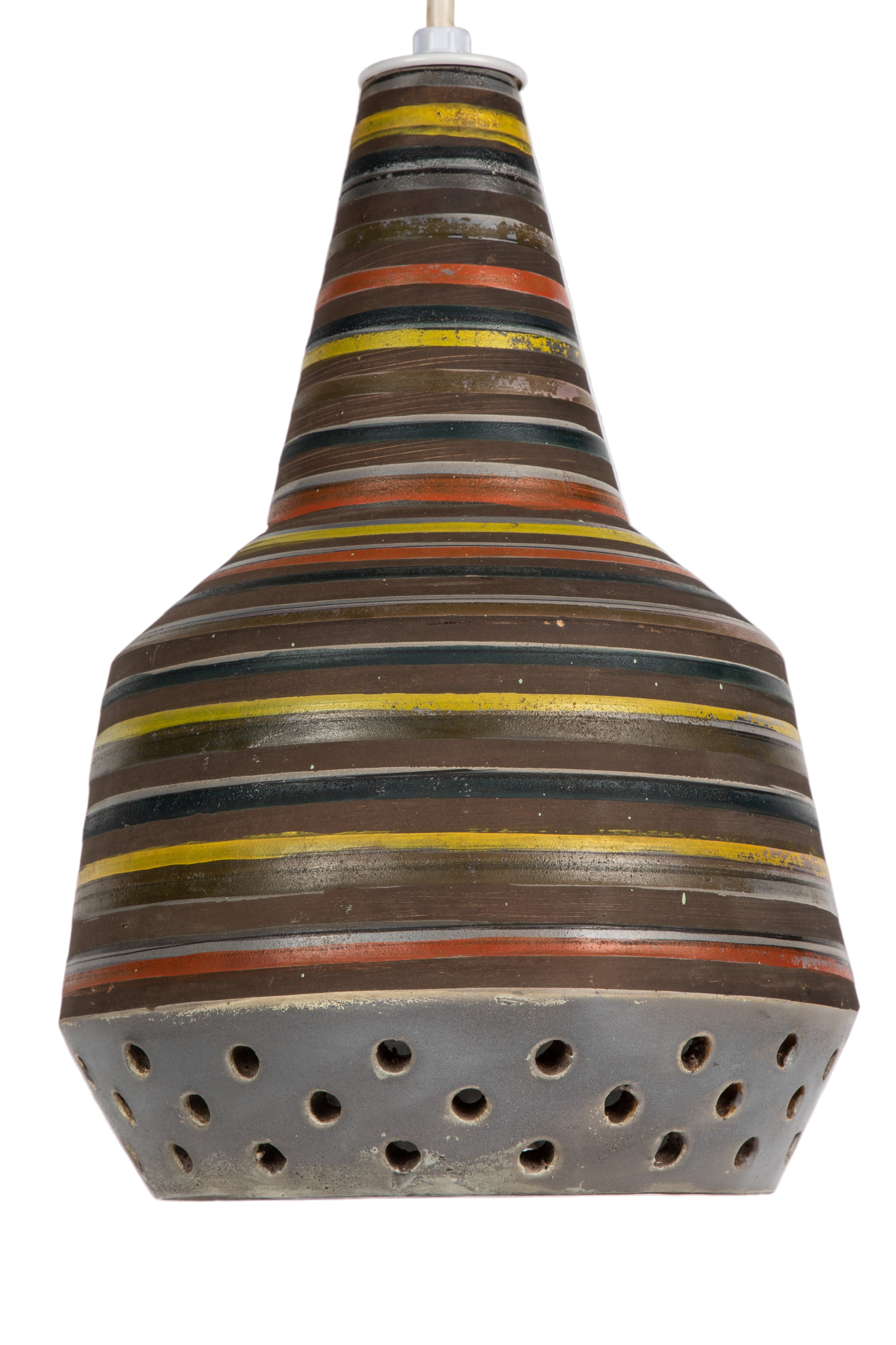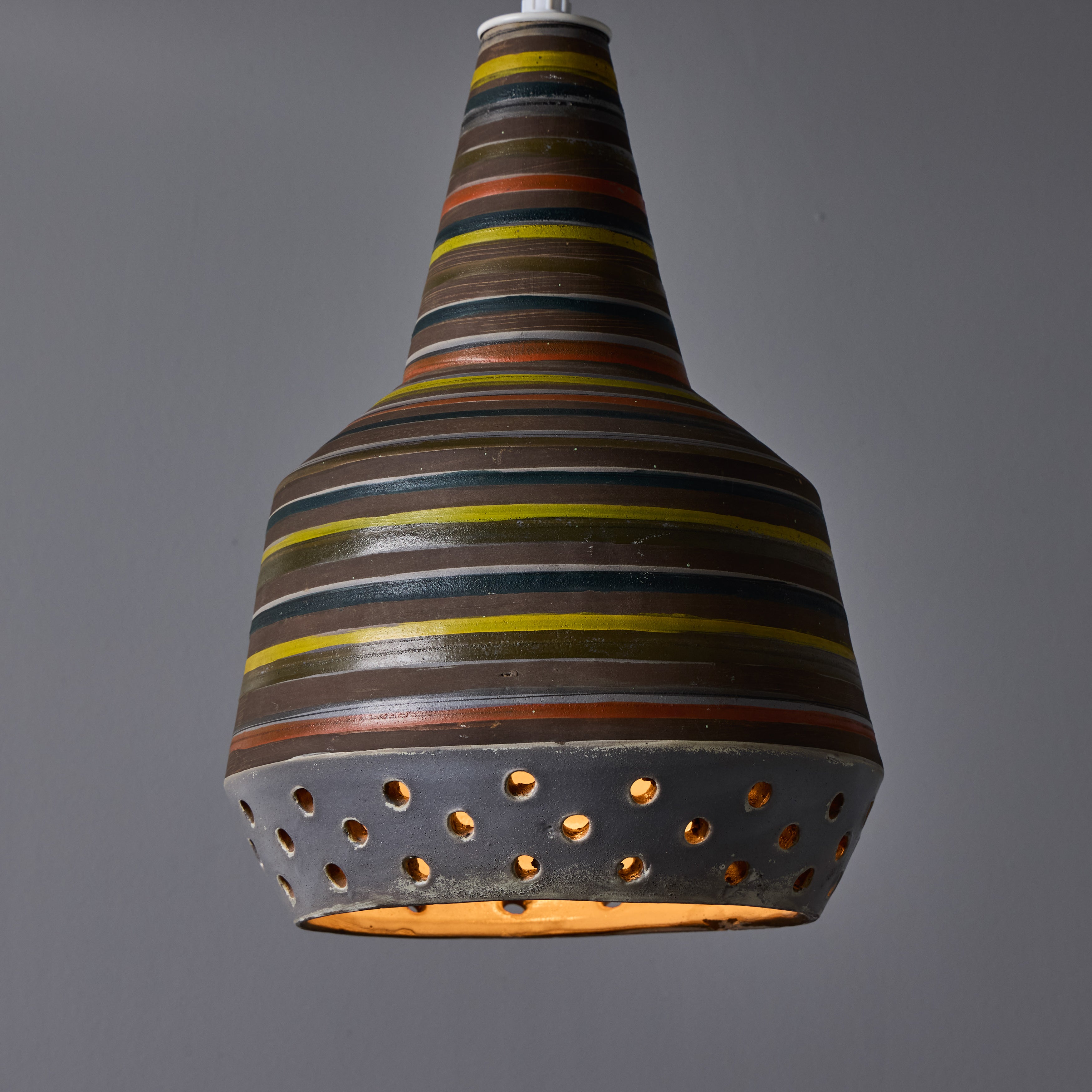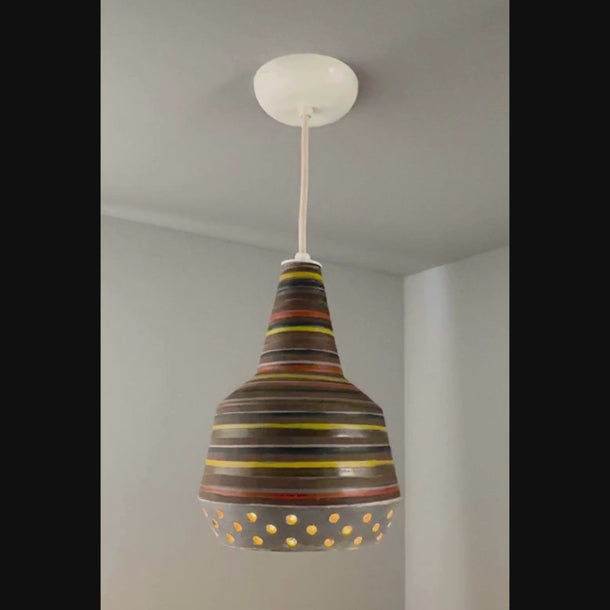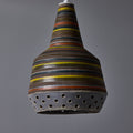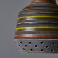 This rare and sculptural Italian ceramic lamp is executed with multicolored glazed horizontal stripes and geometric circular perforations. A distributor of Italian and Scandinavian ceramics throughout the 1940s all the way through 1980, Raymor pieces exemplify Italian craft. No two pieces are alike. Retains original manufacturer's label. This ceramic pendant measures 9 inches wide by 13 inches high.