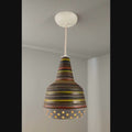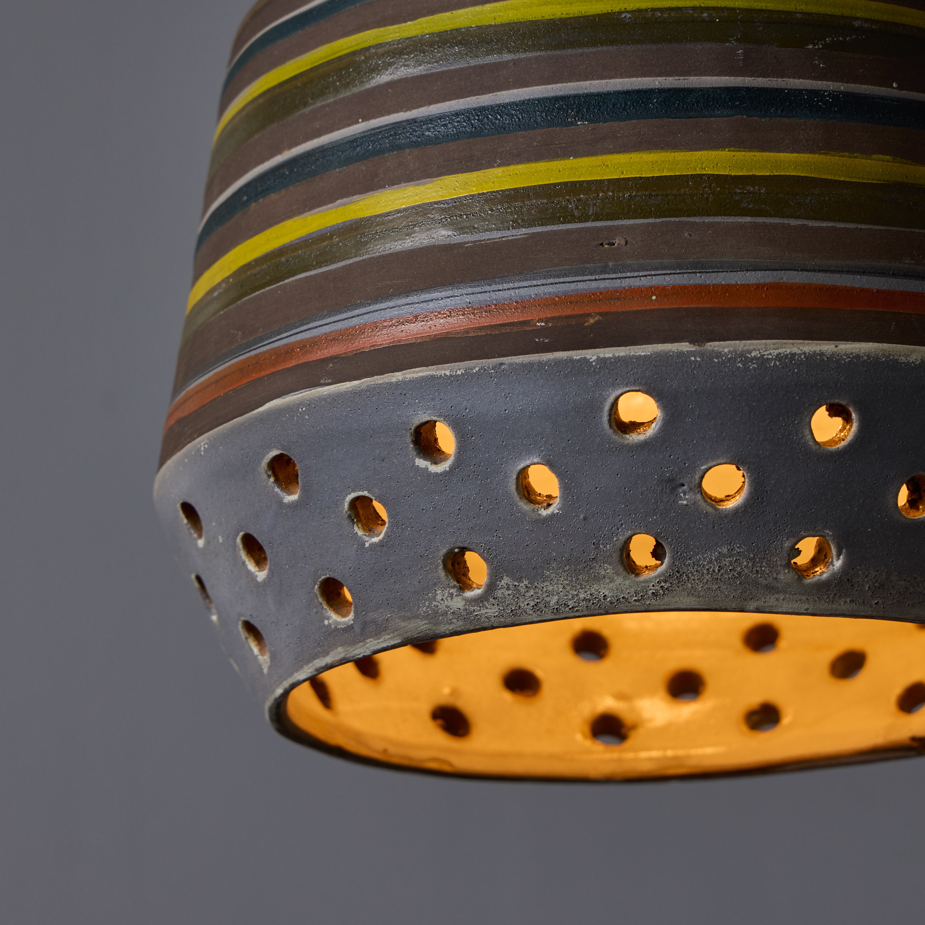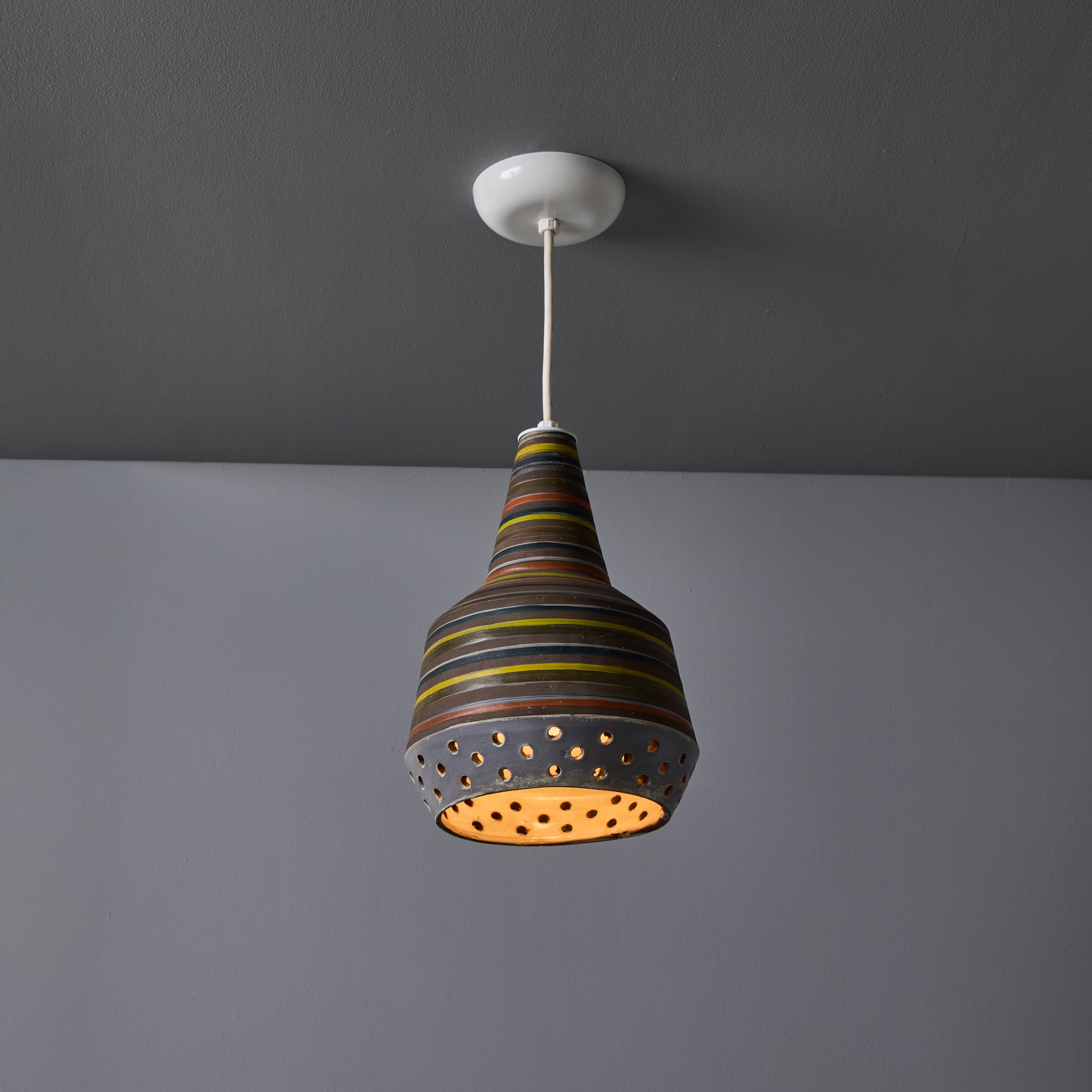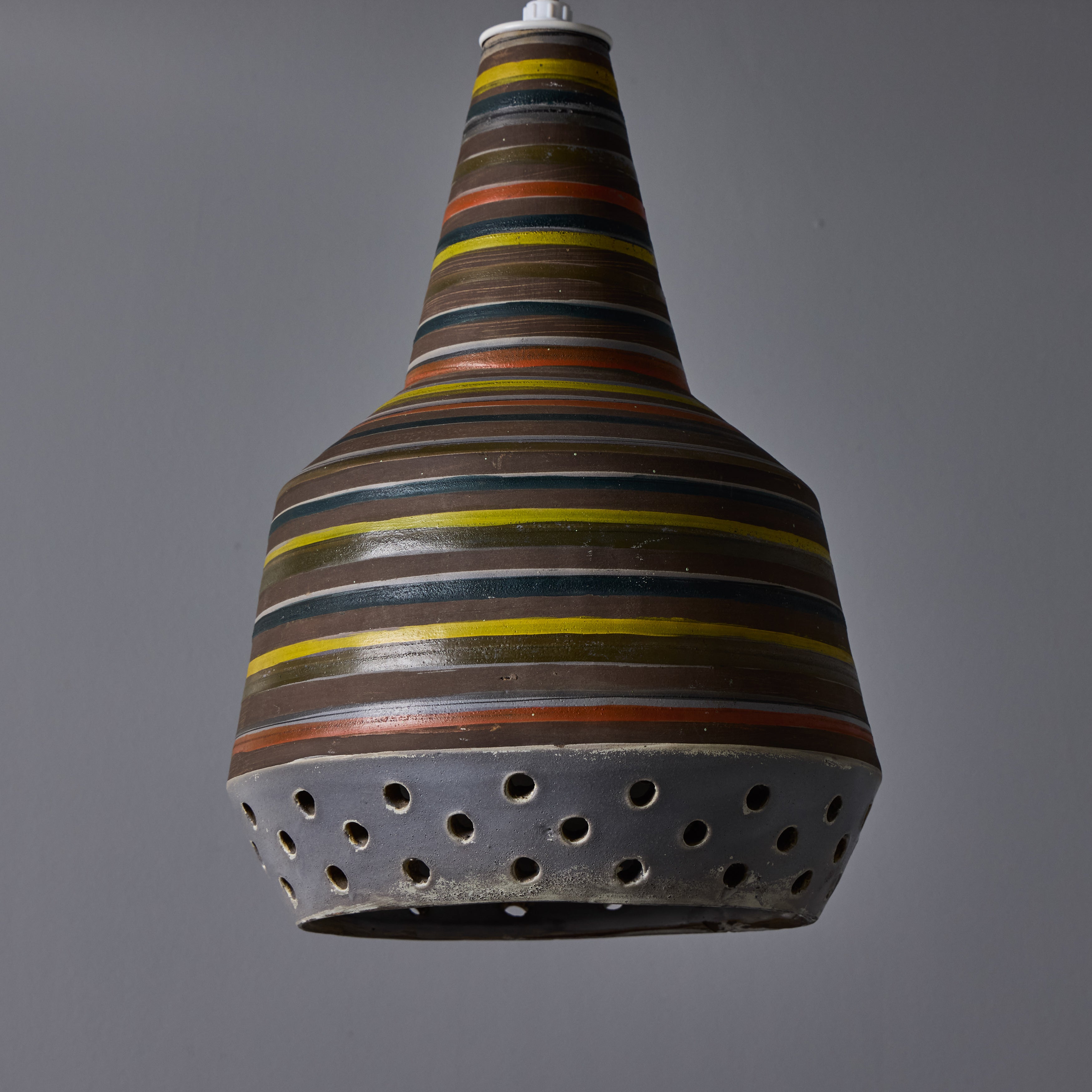 This rare and sculptural Italian ceramic lamp is executed with multicolored glazed horizontal stripes and geometric circular perforations. A distributor of Italian and Scandinavian ceramics throughout the 1940s all the way through 1980, Raymor pieces exemplify Italian craft. No two pieces are alike. Retains original manufacturer's label. This ceramic pendant measures 9 inches wide by 13 inches high.
