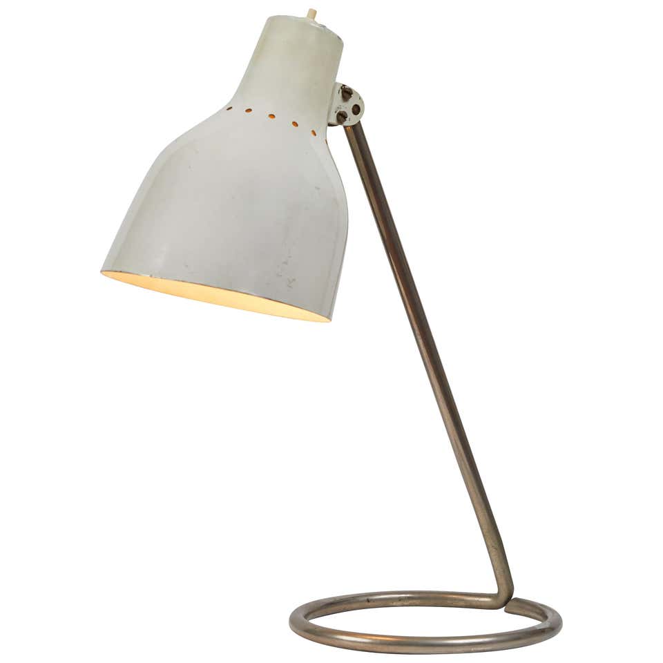 Executed in white enameled metal and nickel or steel, this 1960s vintage table lamp is attributed to Swiss lighting house BAG Turgi. The white painted shade adjusts left/right and up/down. The round nickel finish base complements the shade. Reminiscent of the refined minimalist designs of Tito Agnoli for O-Luce.