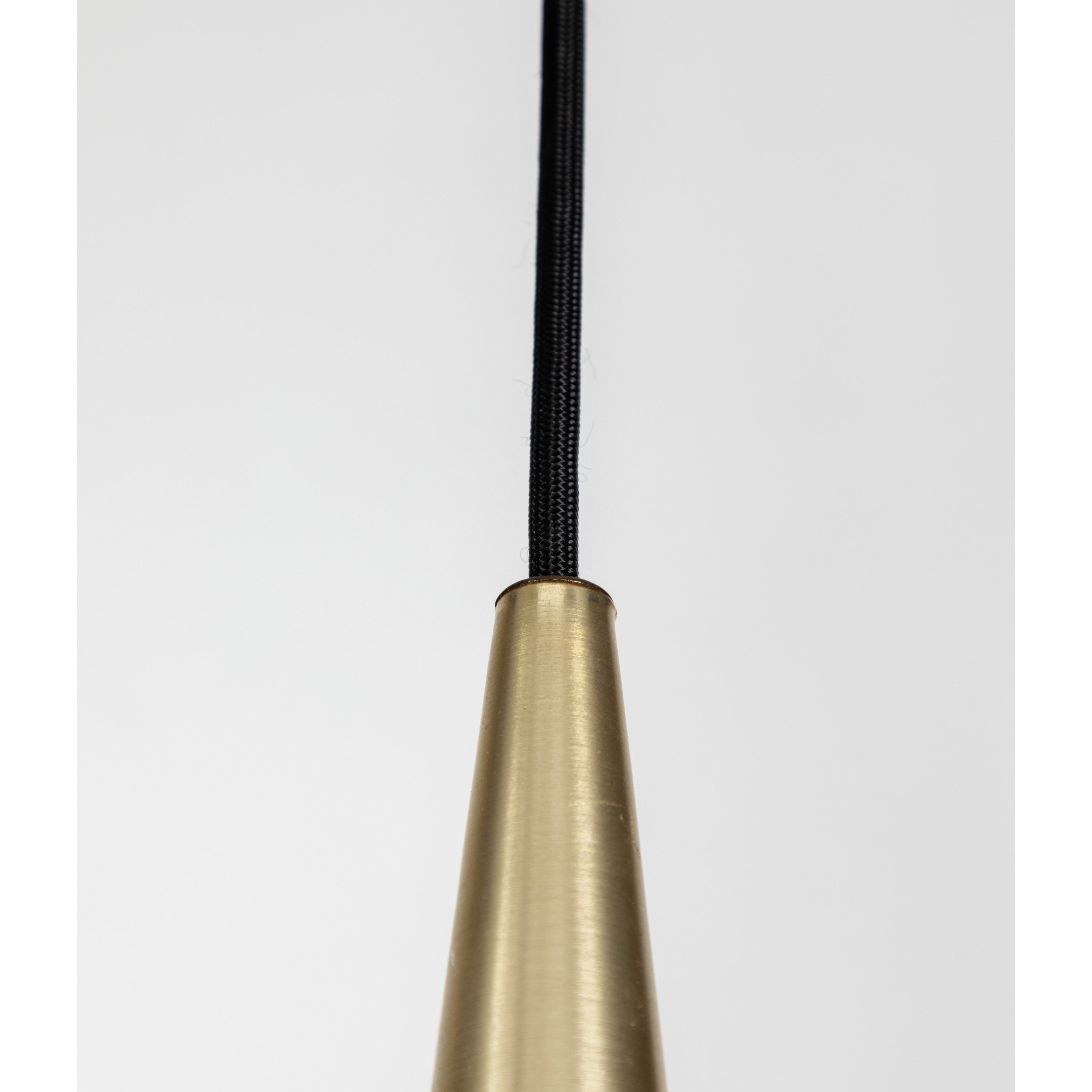 Executed in brassed metal and thick opaline molded glass etched on the inside, with custom solid brass canopy and thick black cloth cord. Staff Leuchten produced these lights in Germany throughout the 1960s.