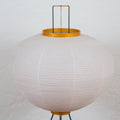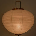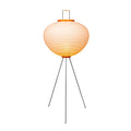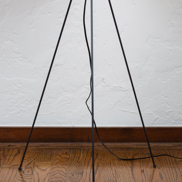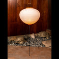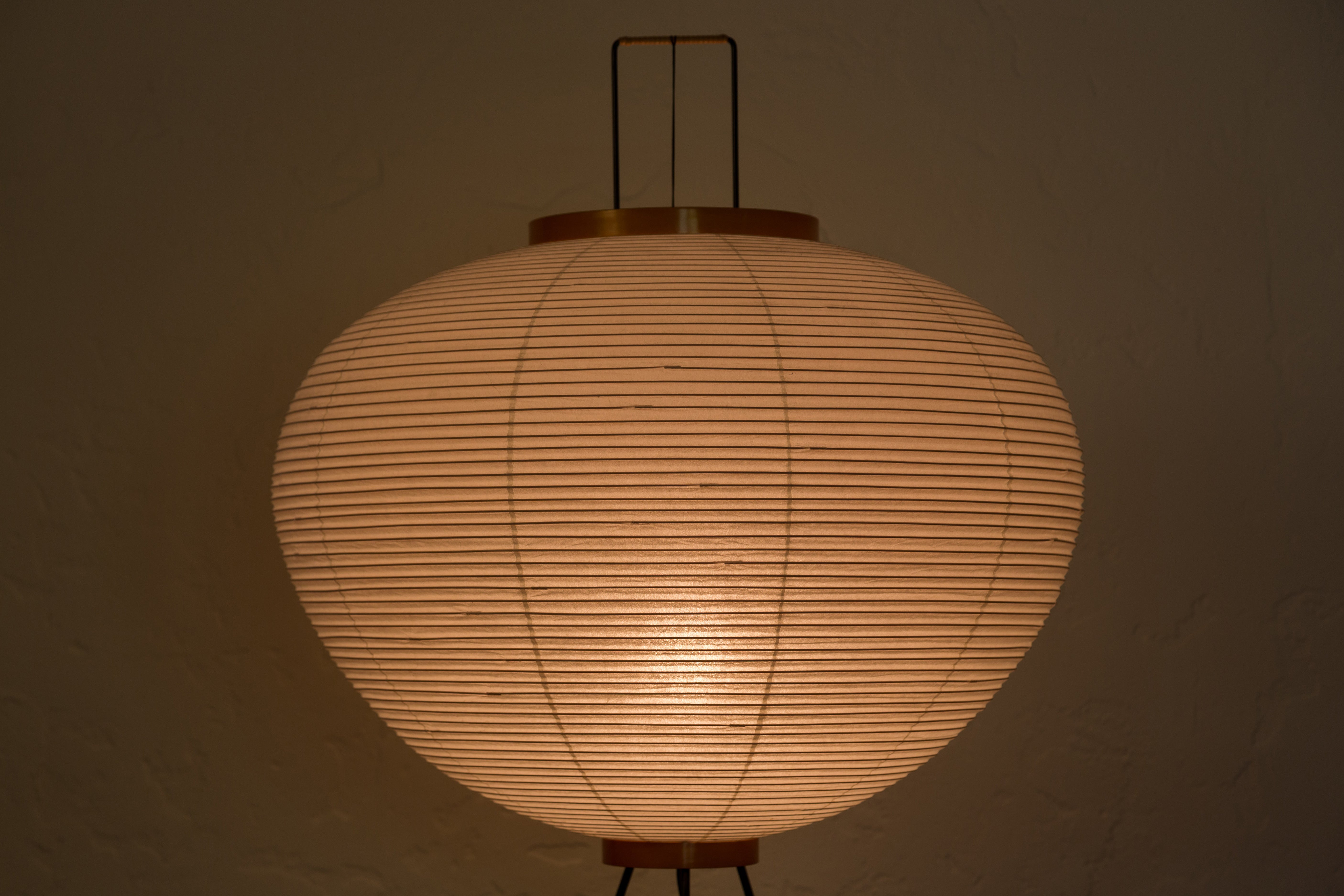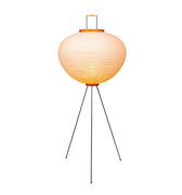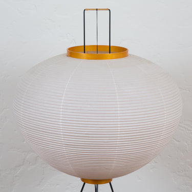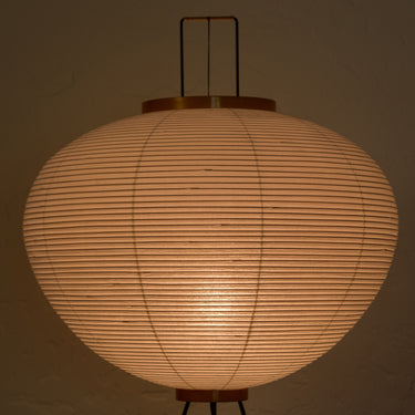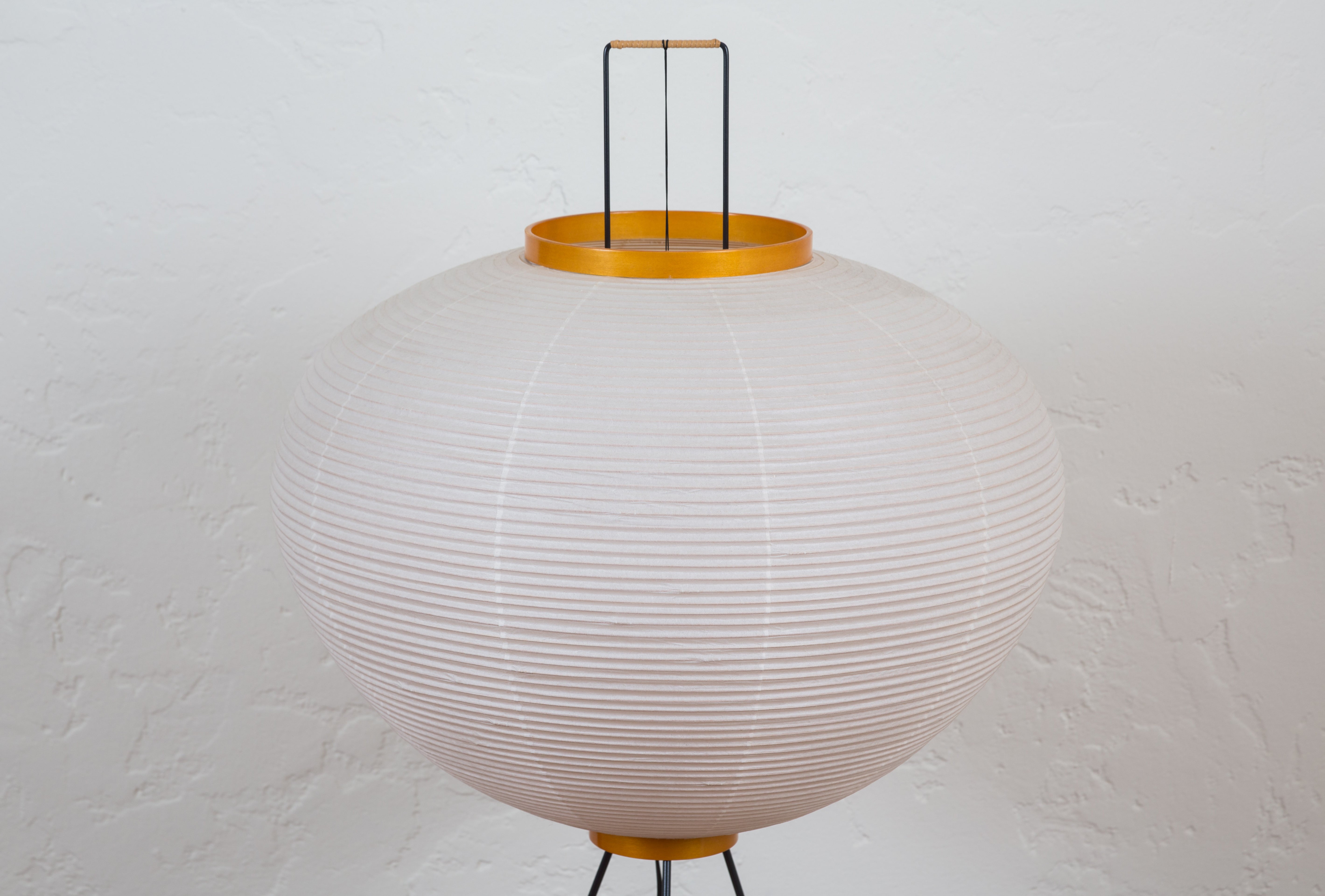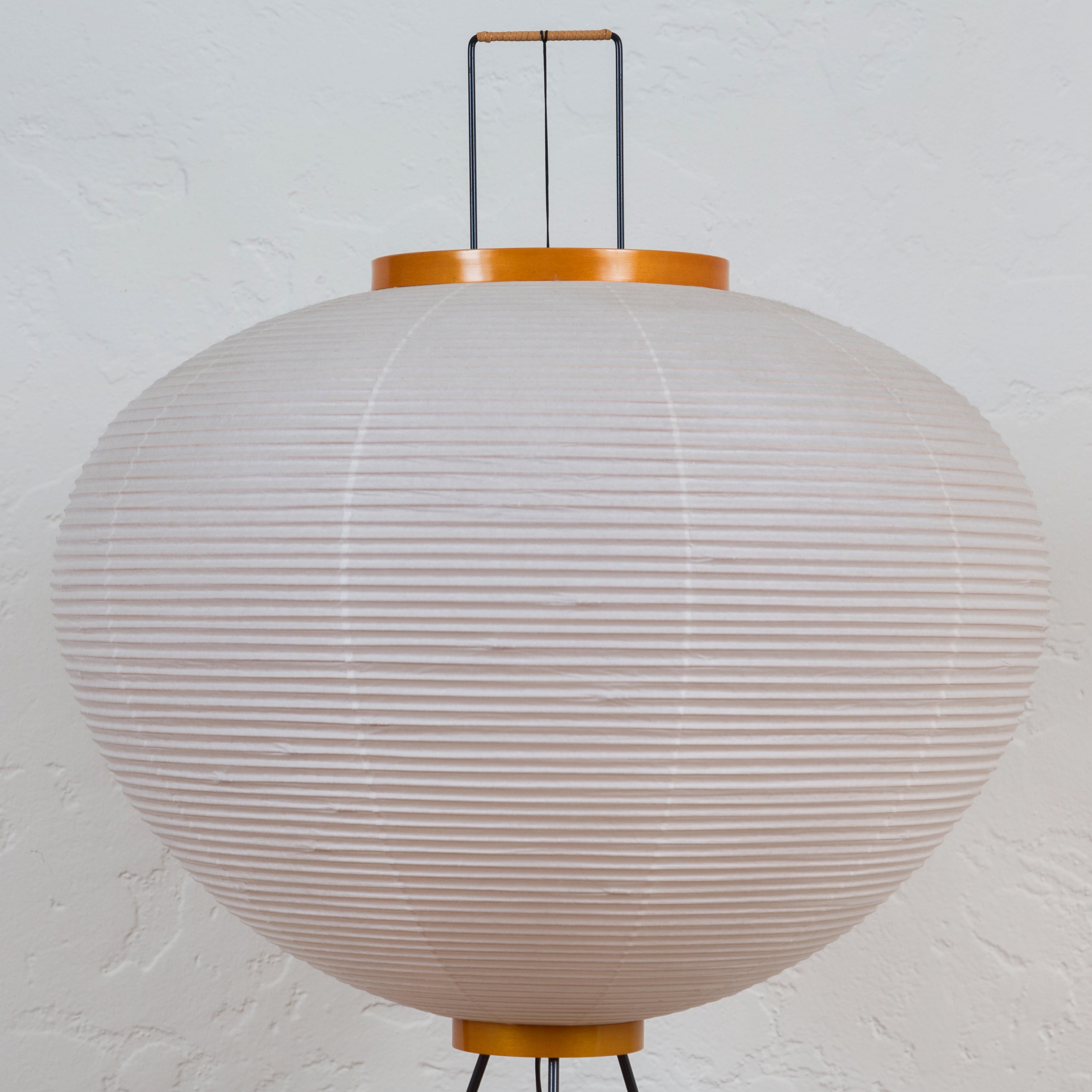 The shade is made from handmade washi paper and bamboo ribs with Noguchi Akari manufacturer's stamp. The lamp measures 50 inches from the feet to the top of the wire structure. The shade measures 21 inches at its widest point. The bulb casts a soft diffuse glow, providing a sculptural focal point in any space.