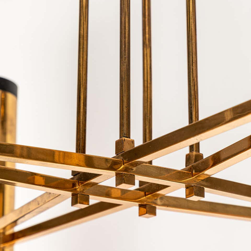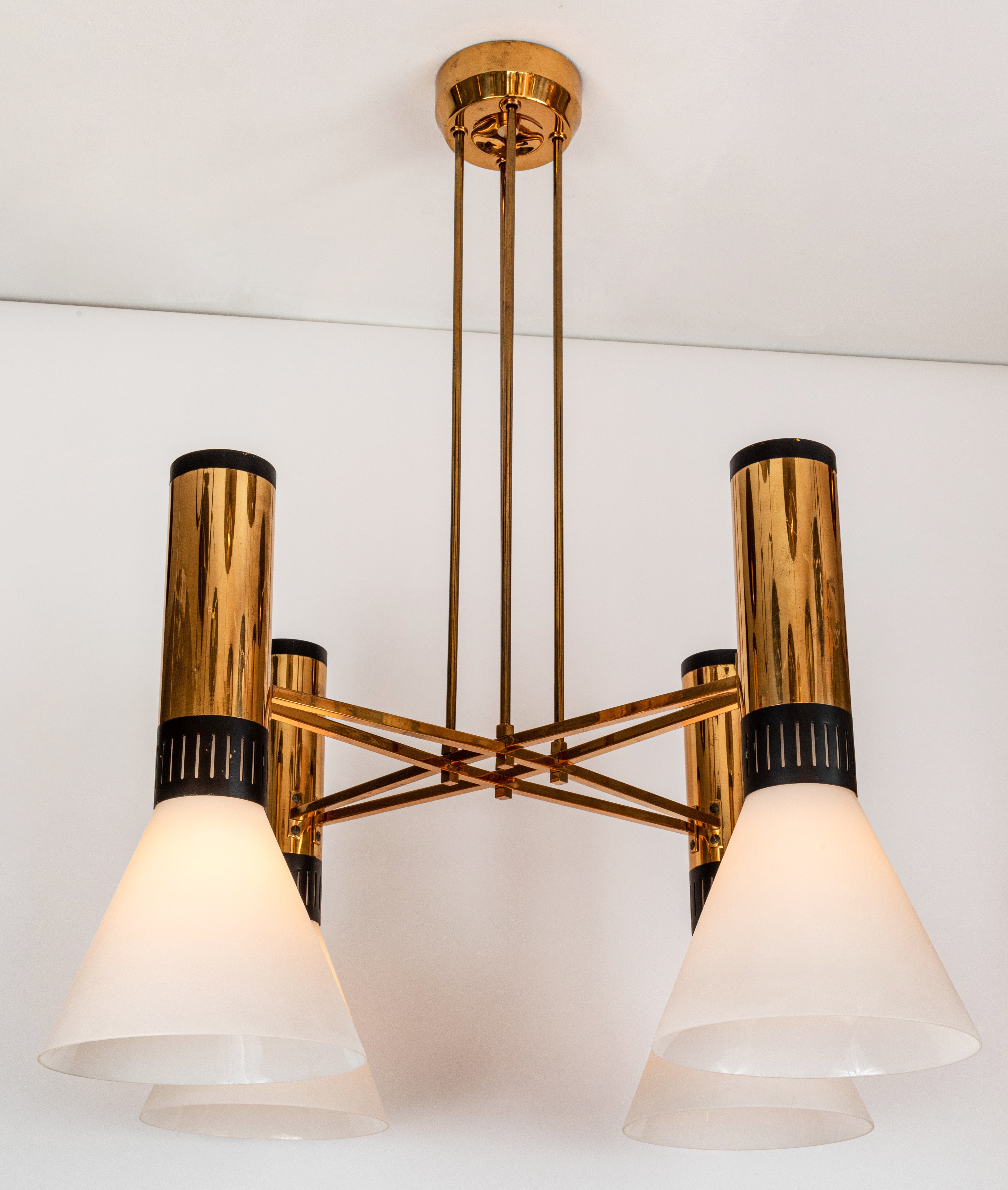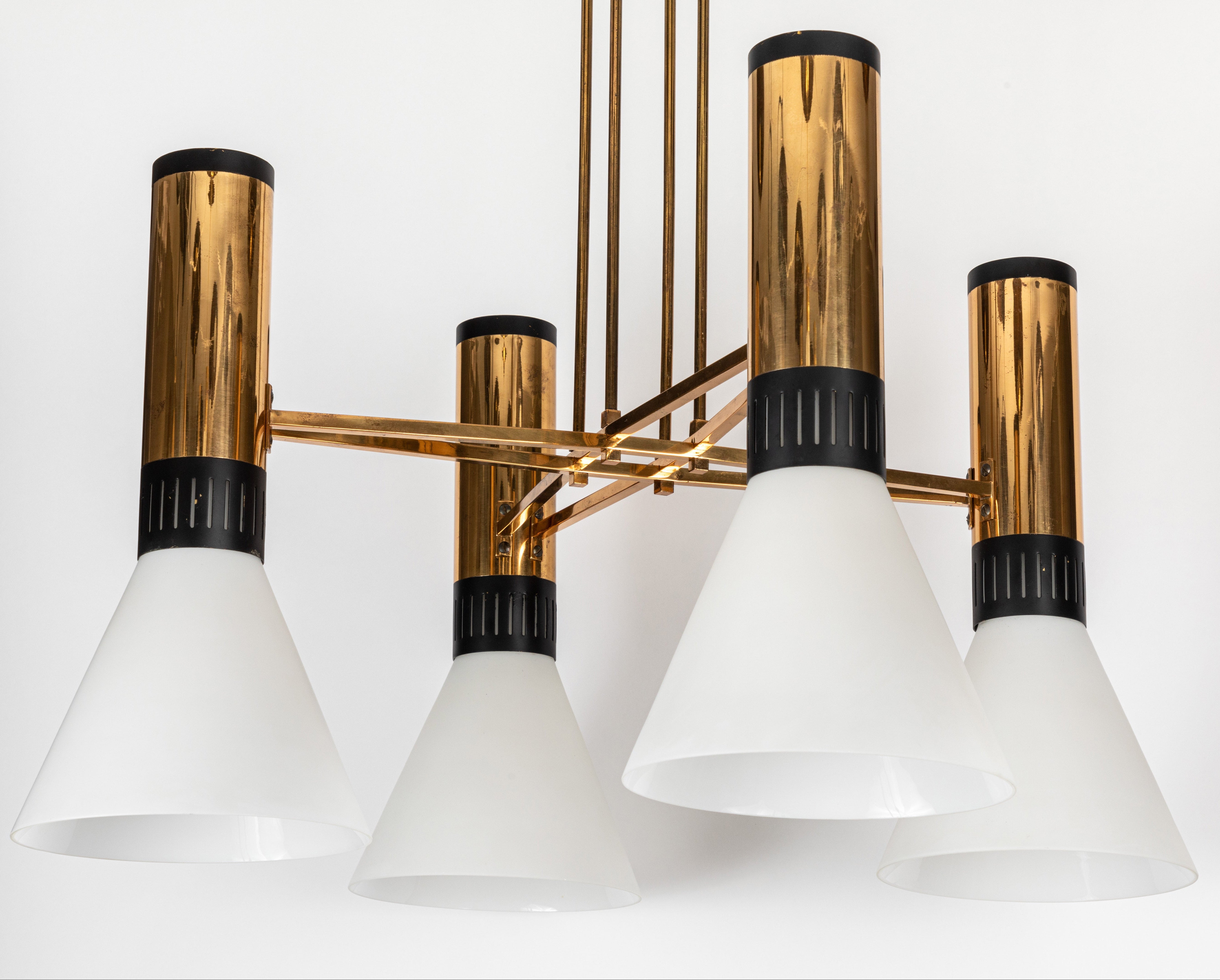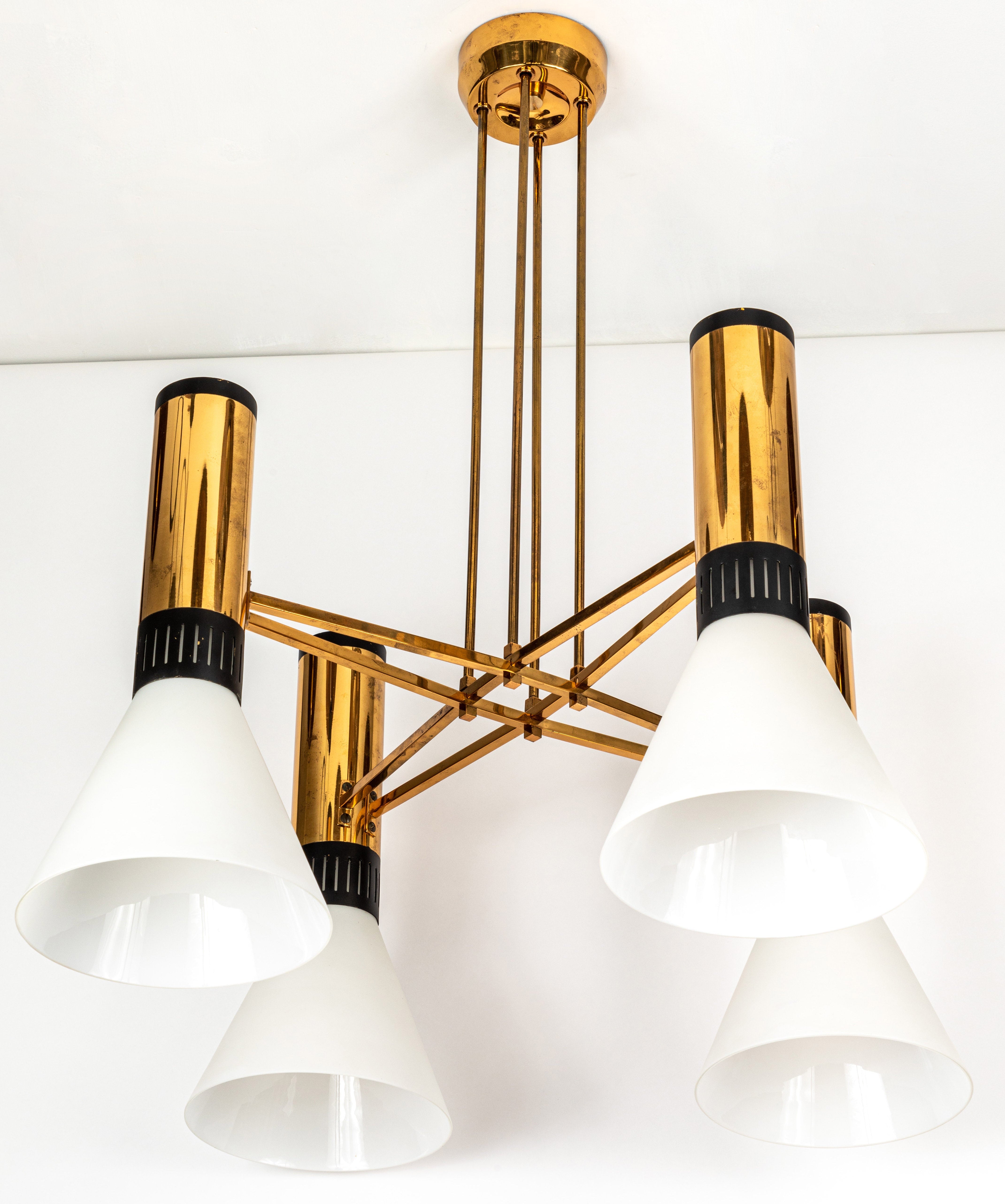A quintessentially iconic 1950s Italian design comprised of 4 large matte triplex opaline frosted glass cones mounted on a sculptural brass and black lacquered aluminum geometric structure. A highly functional light sculpture of impressive scale and incomparable refinement. Retains original manufacturer's label.