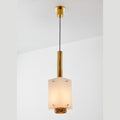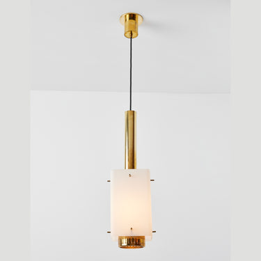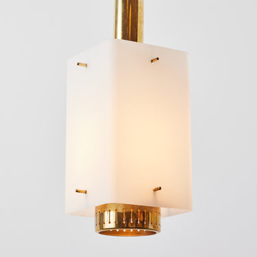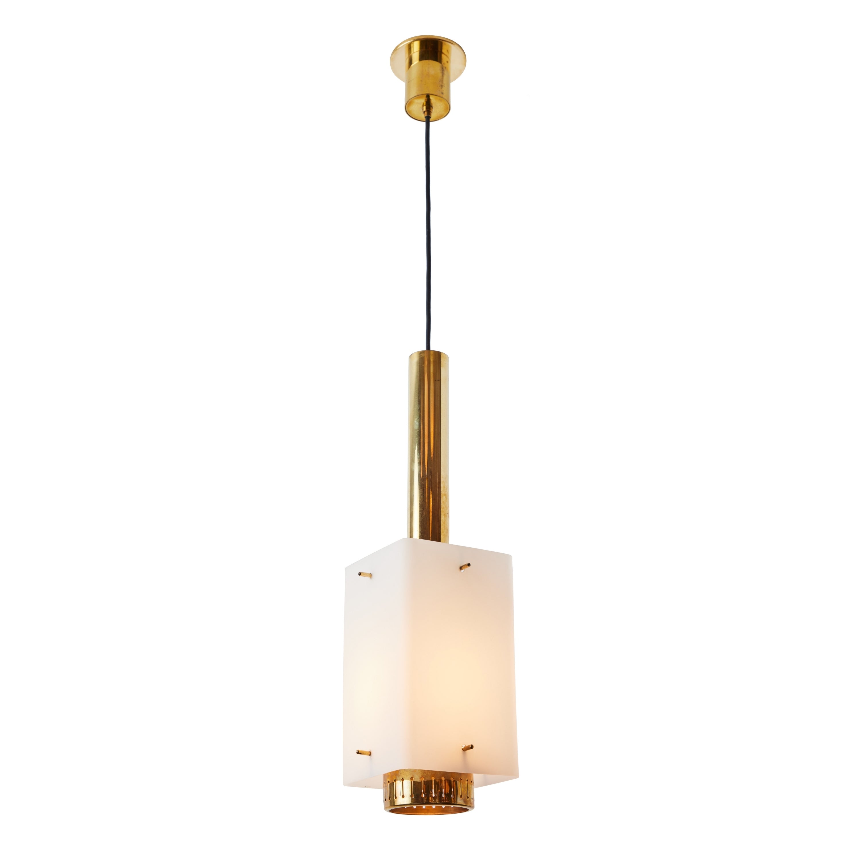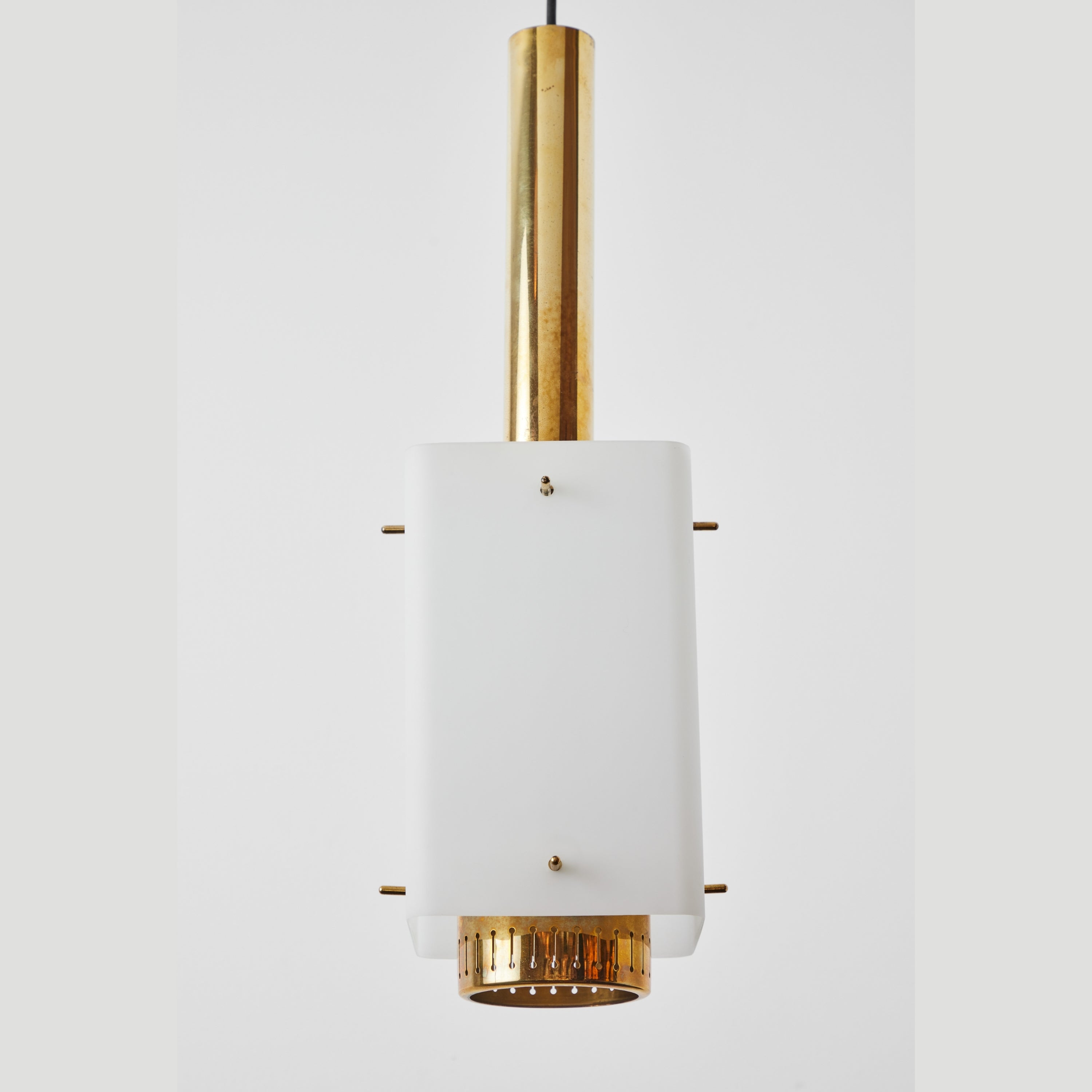 A quintessentially 1950s Italian design executed in matte opaline glass and brass. A highly functional light sculpture of attractive scale and refinement. The brass has a beautiful vintage patina. Rectangular glass diffuser is held in place with 8 decorative brass screws. Pendant measures 22 inches in height with a maximum total drop of 48 inches. Retains original manufacturer's yellow label.