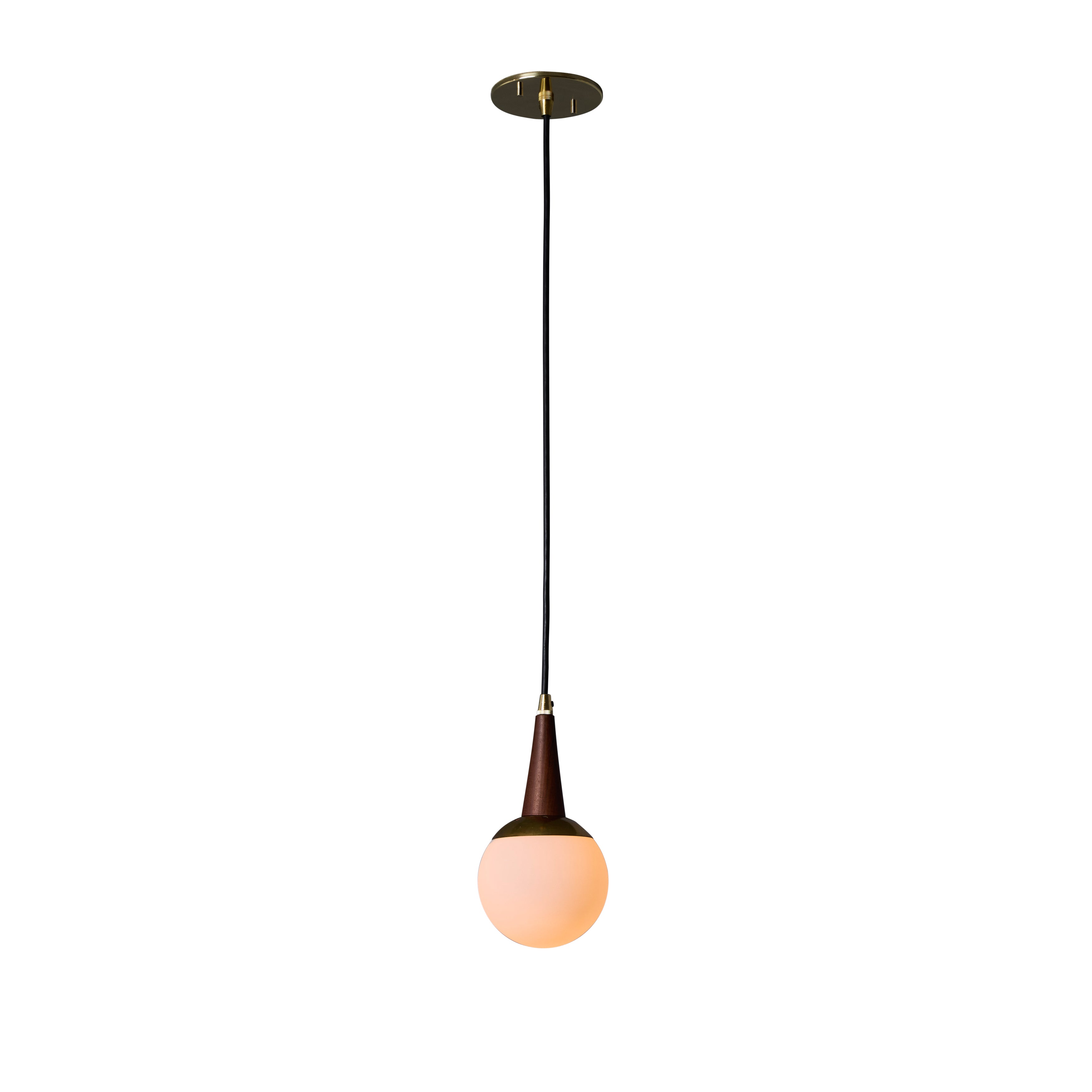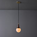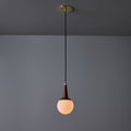 Executed in round smooth opaline glass with brass hardware and a wood accent finial over the glass shade. A refined ceiling lamp light of attractive scale suitable for bar or powder room overhead lighting. Unmarked.