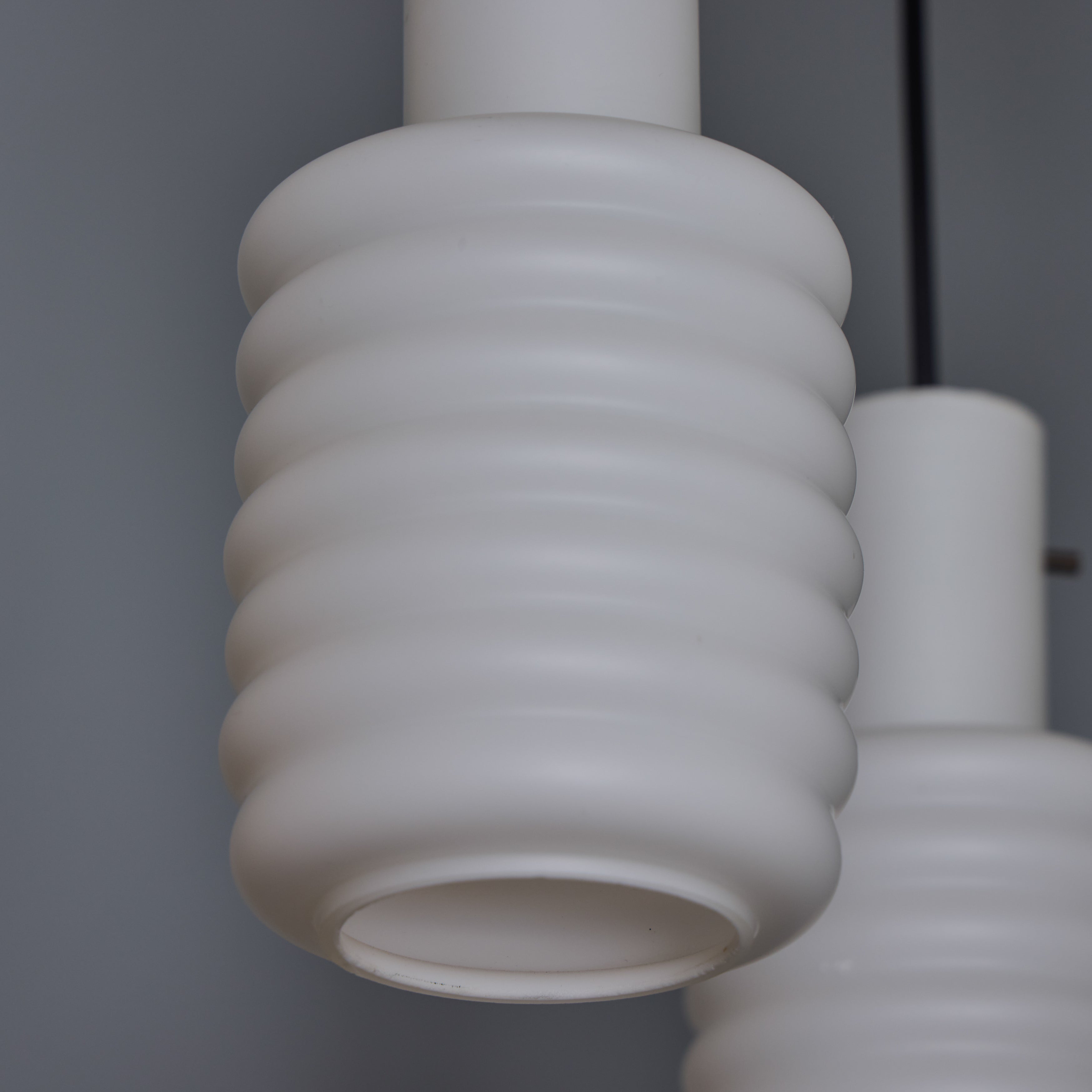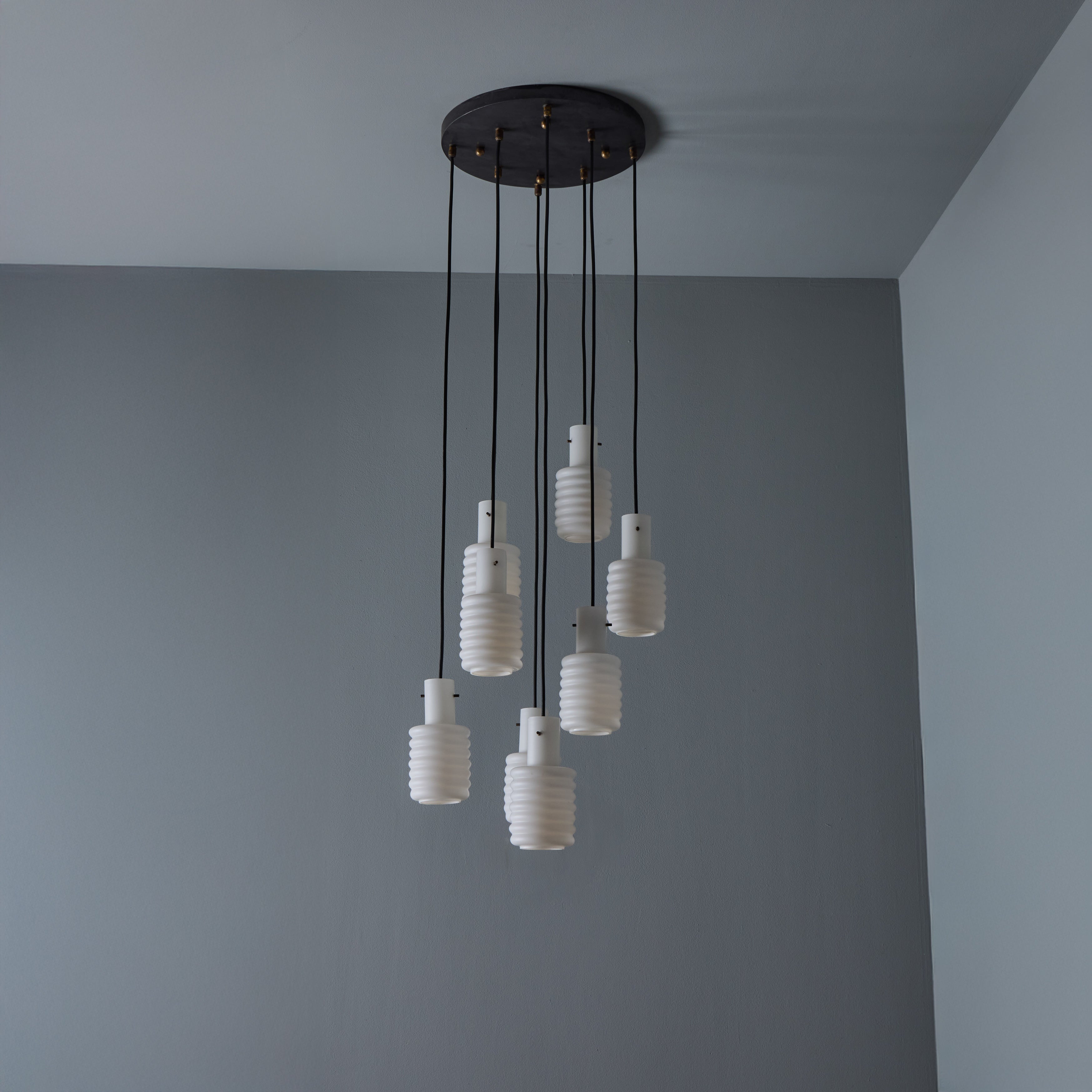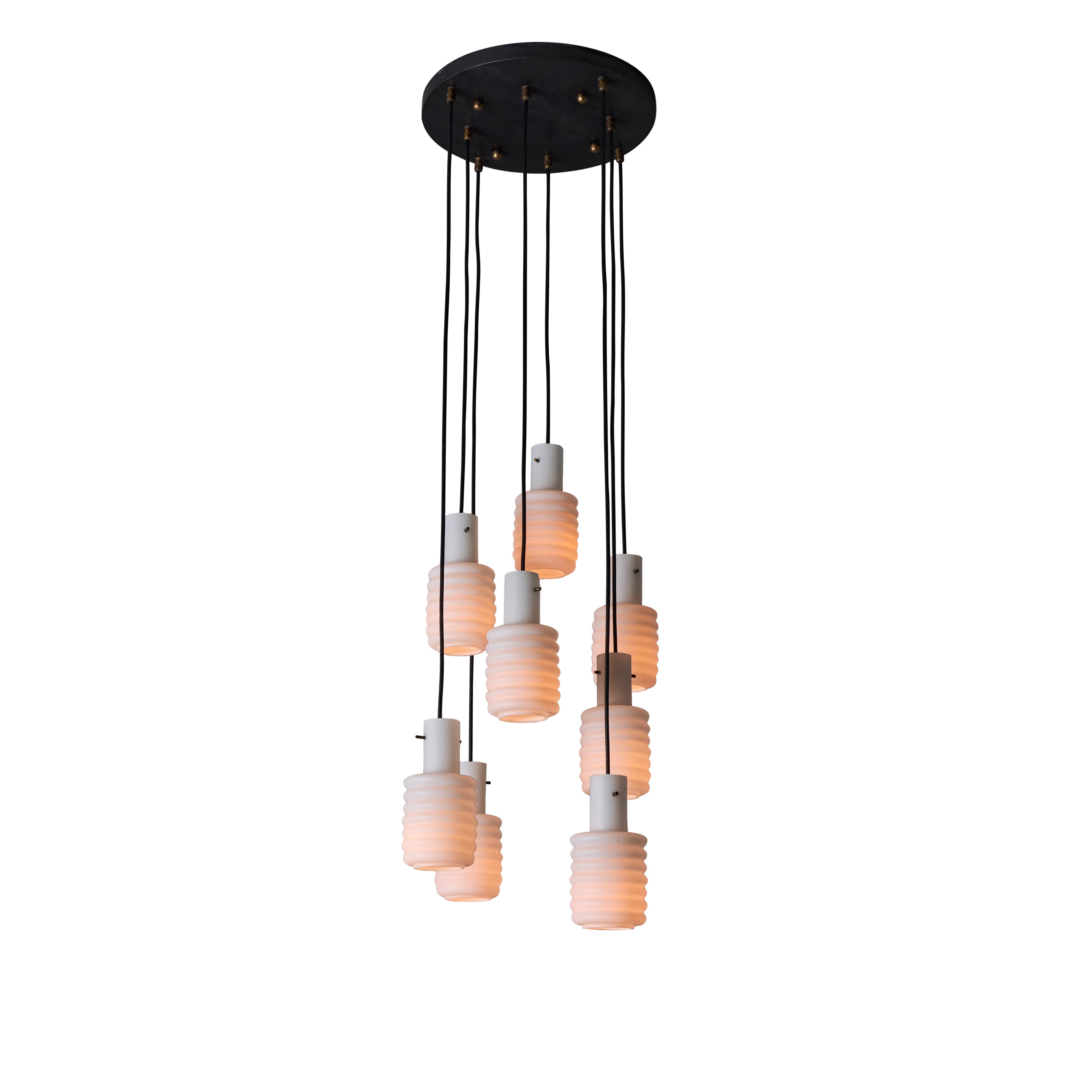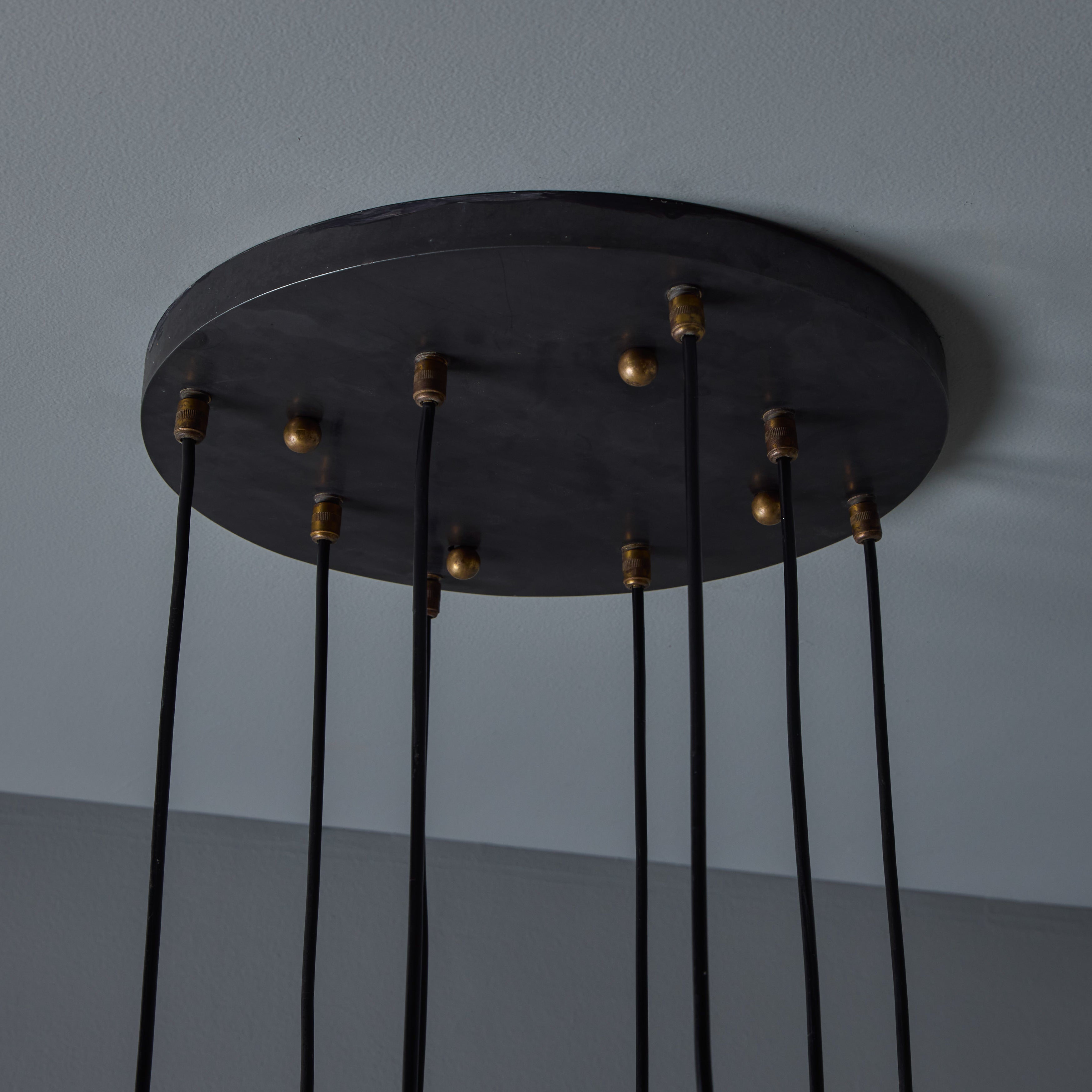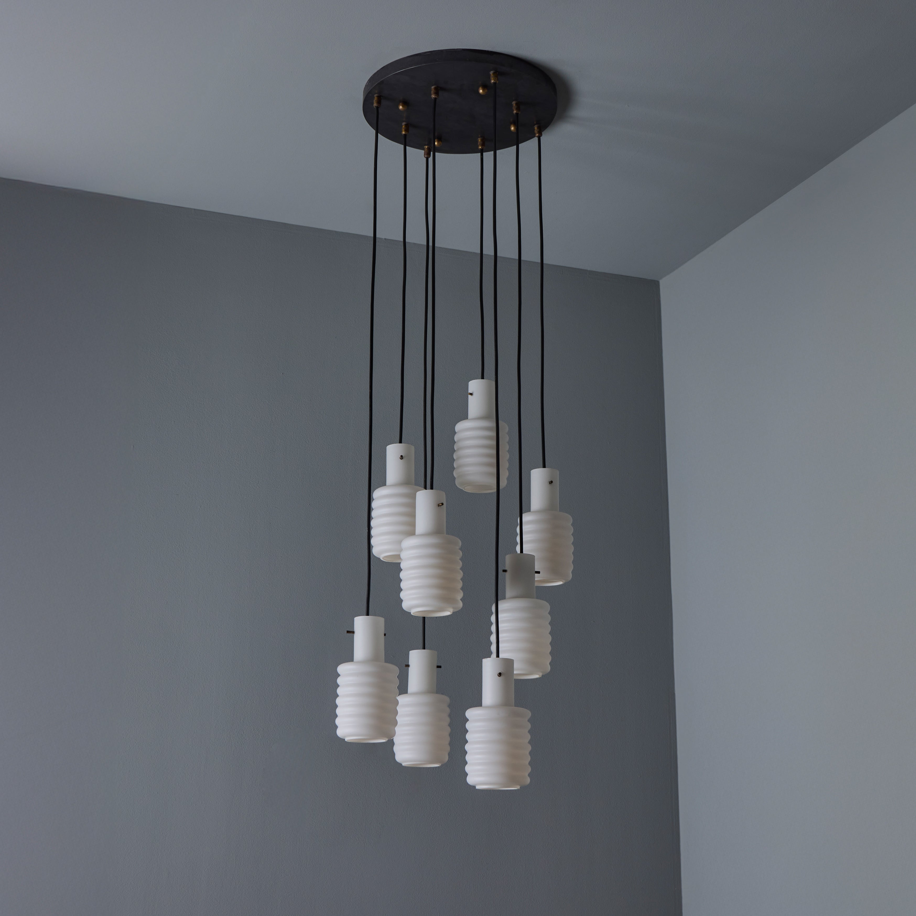 An extremely refined design executed in sculptural blown opaline glass, black painted metal and patinated brass. An exquisite unsigned example that shares numerous attributes to the iconic early work of Lelli and Arredoluce Monza. Individual cord on each pendant can be cut to desired lengths to produce the desired cascading effect.