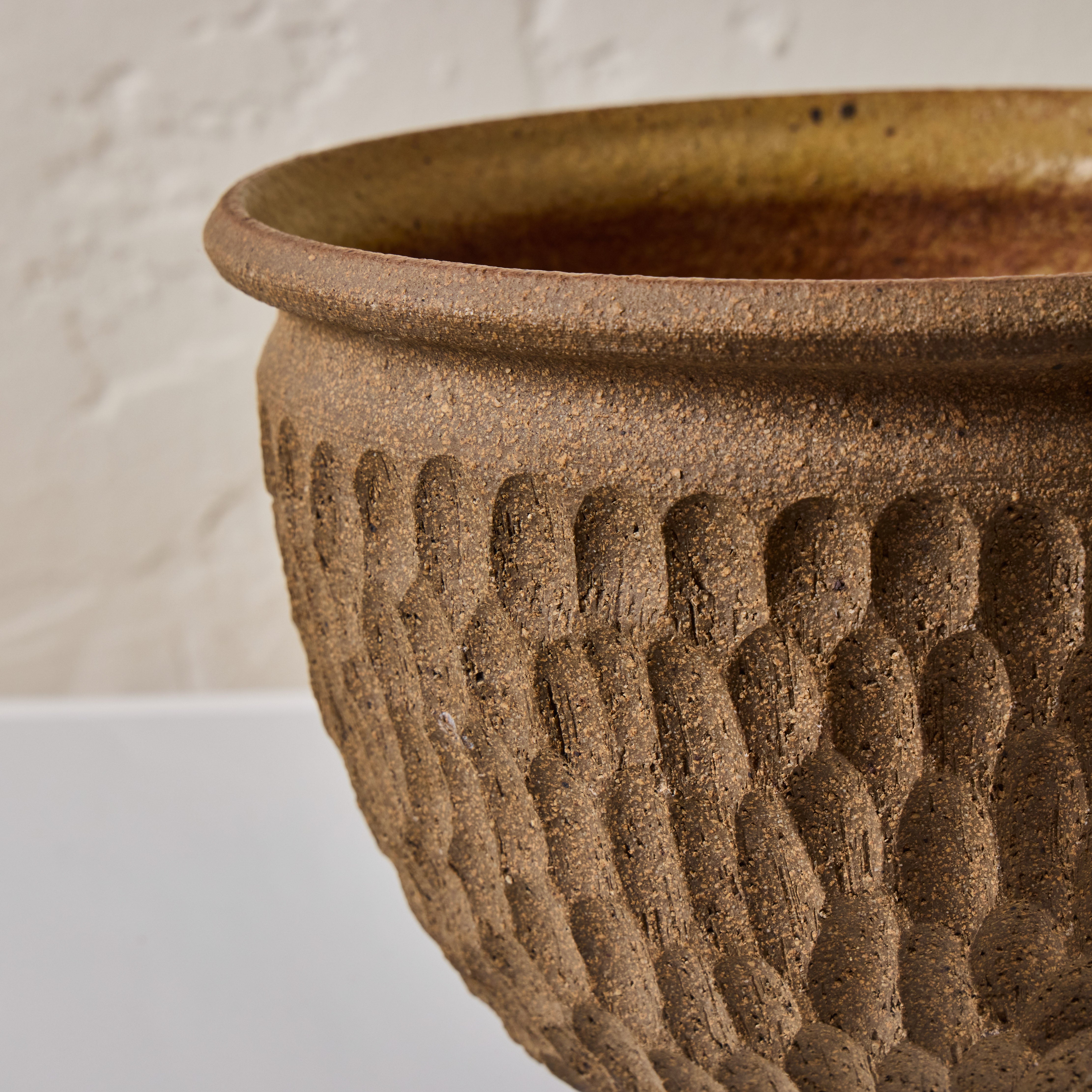 Executed by accomplished potter Robert Maxwell in hand-thrown earthenware, textured with his signature 'Thumbprint' design. A very clean and incredibly rare example of his work throughout the 1960s and 1970s in Venice, California. Structurally sound and highly presentable. Retains Maxwell's original signature on the bottom.