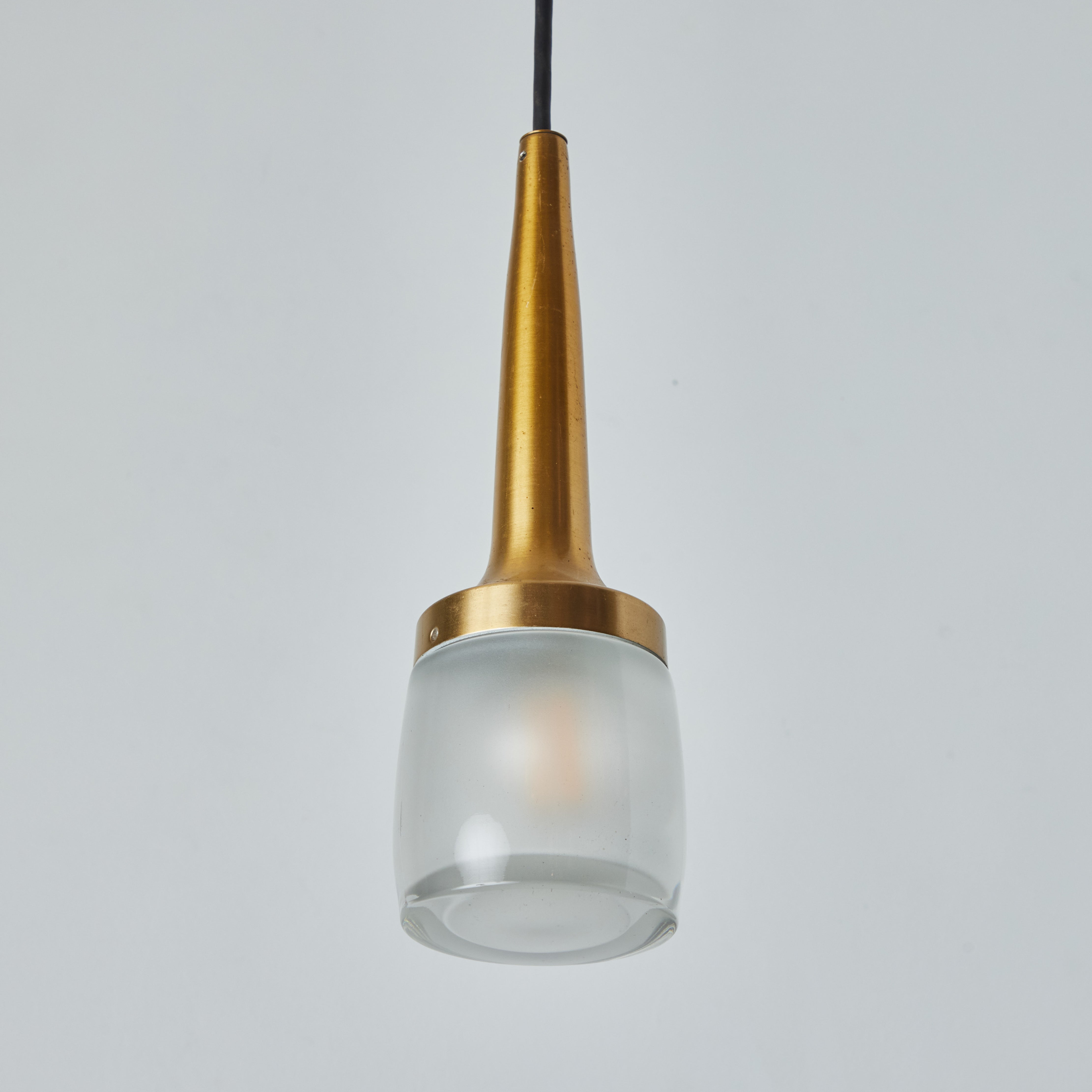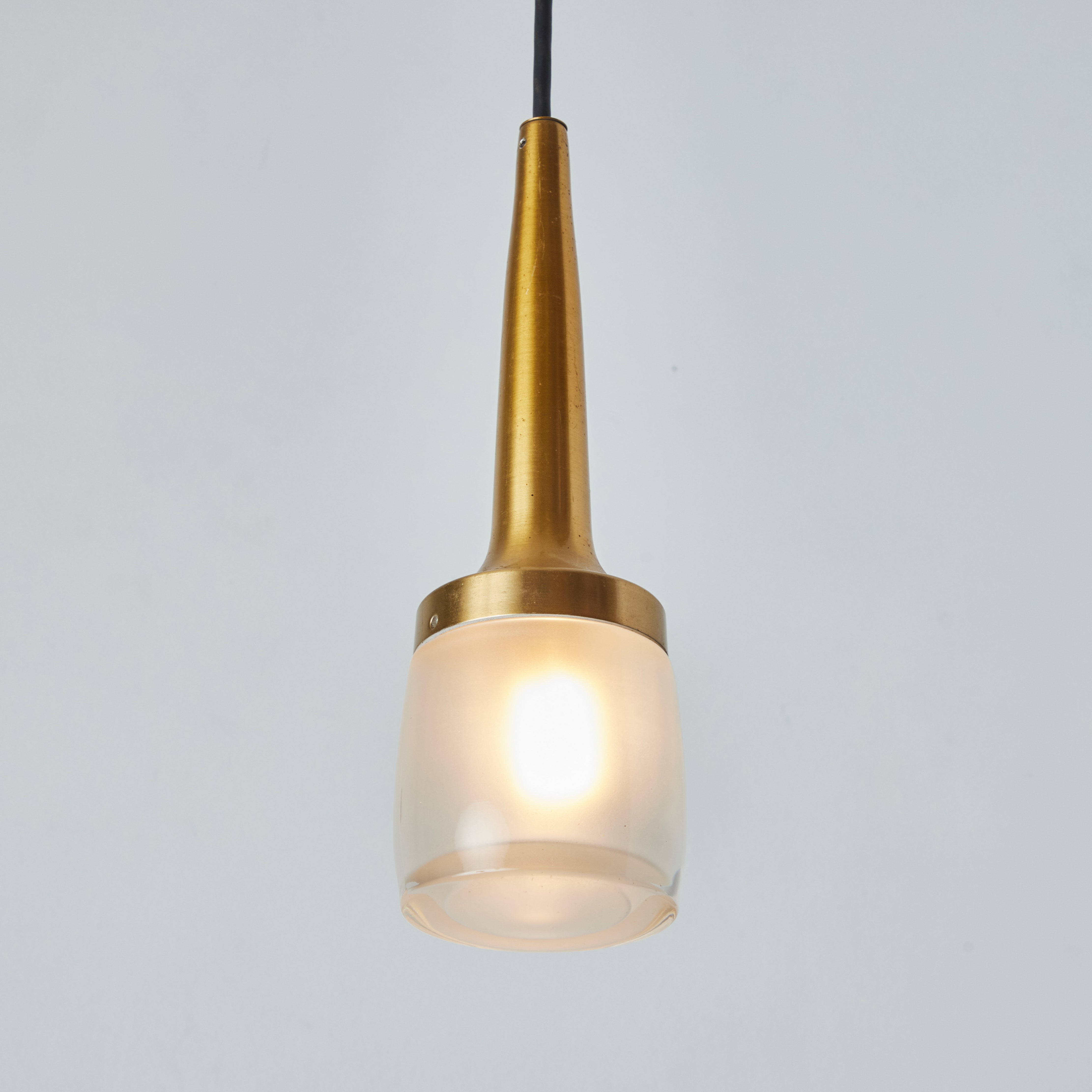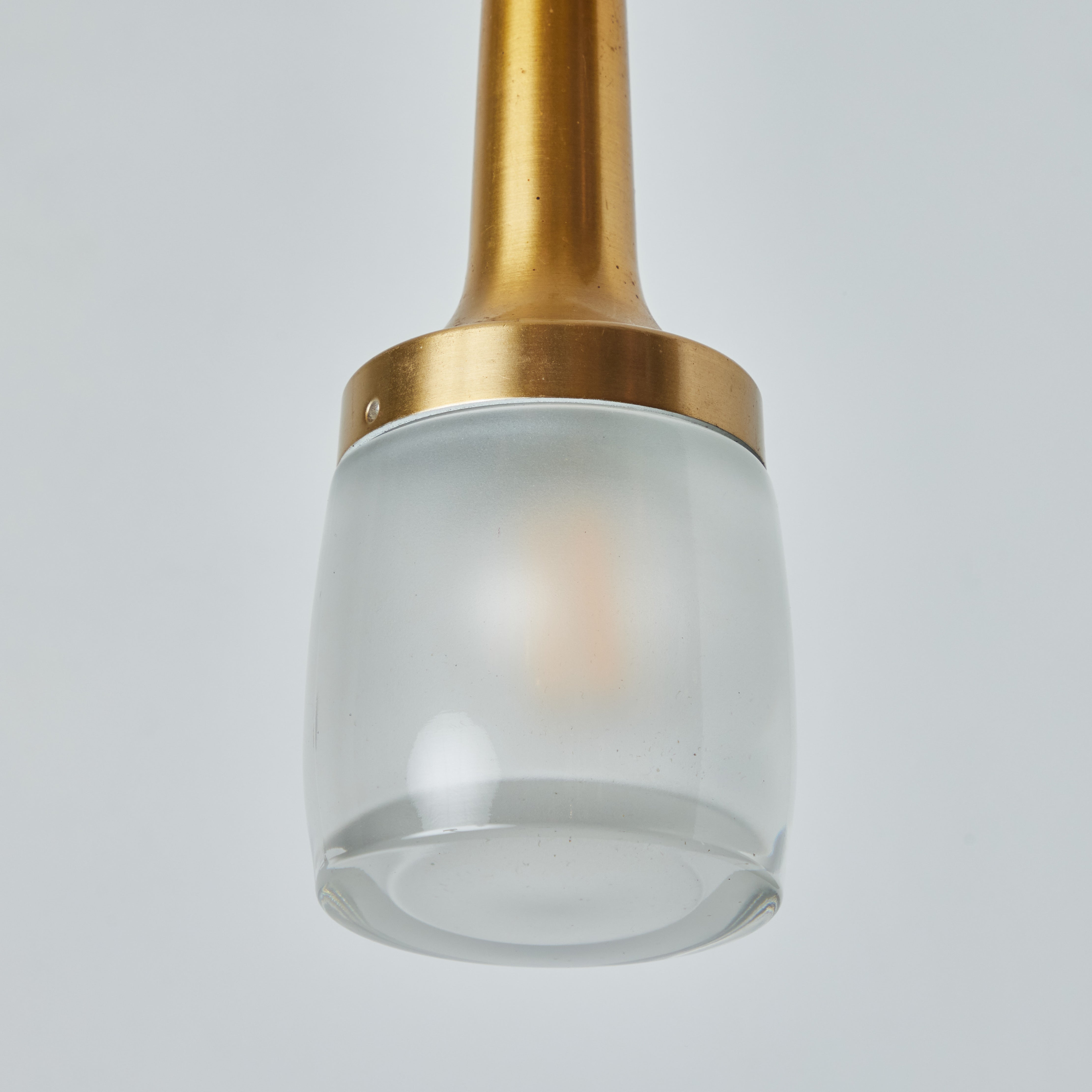 Executed in brassed metal and thick opaline molded glass etched on the inside for a soft diffuse lighting effect. New custom solid brass canopy and thick cloth cord. Staff Leuchten produced these pendants in Germany, circa 1960s. Ideal for bars, powder rooms and other areas calling for soft lighting.