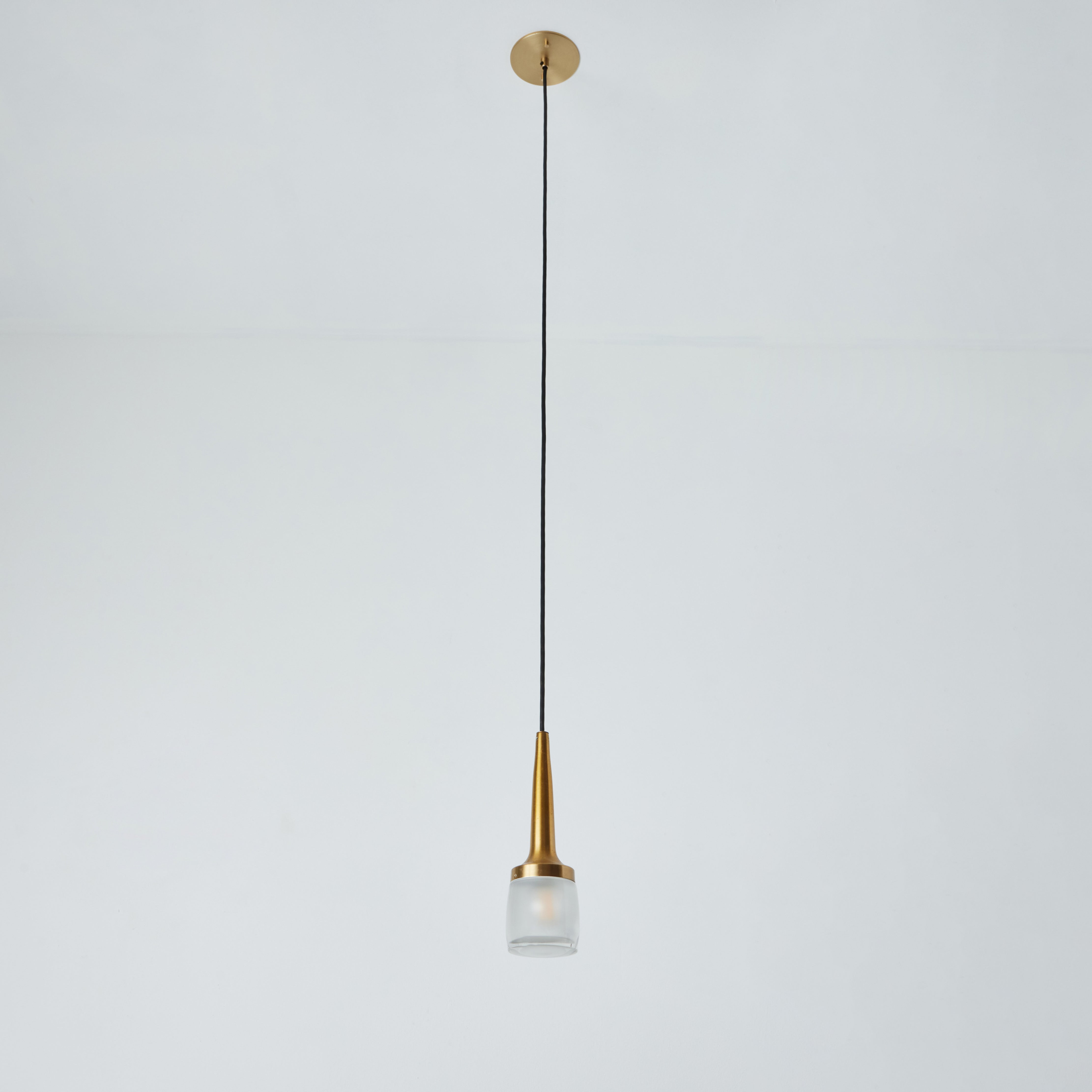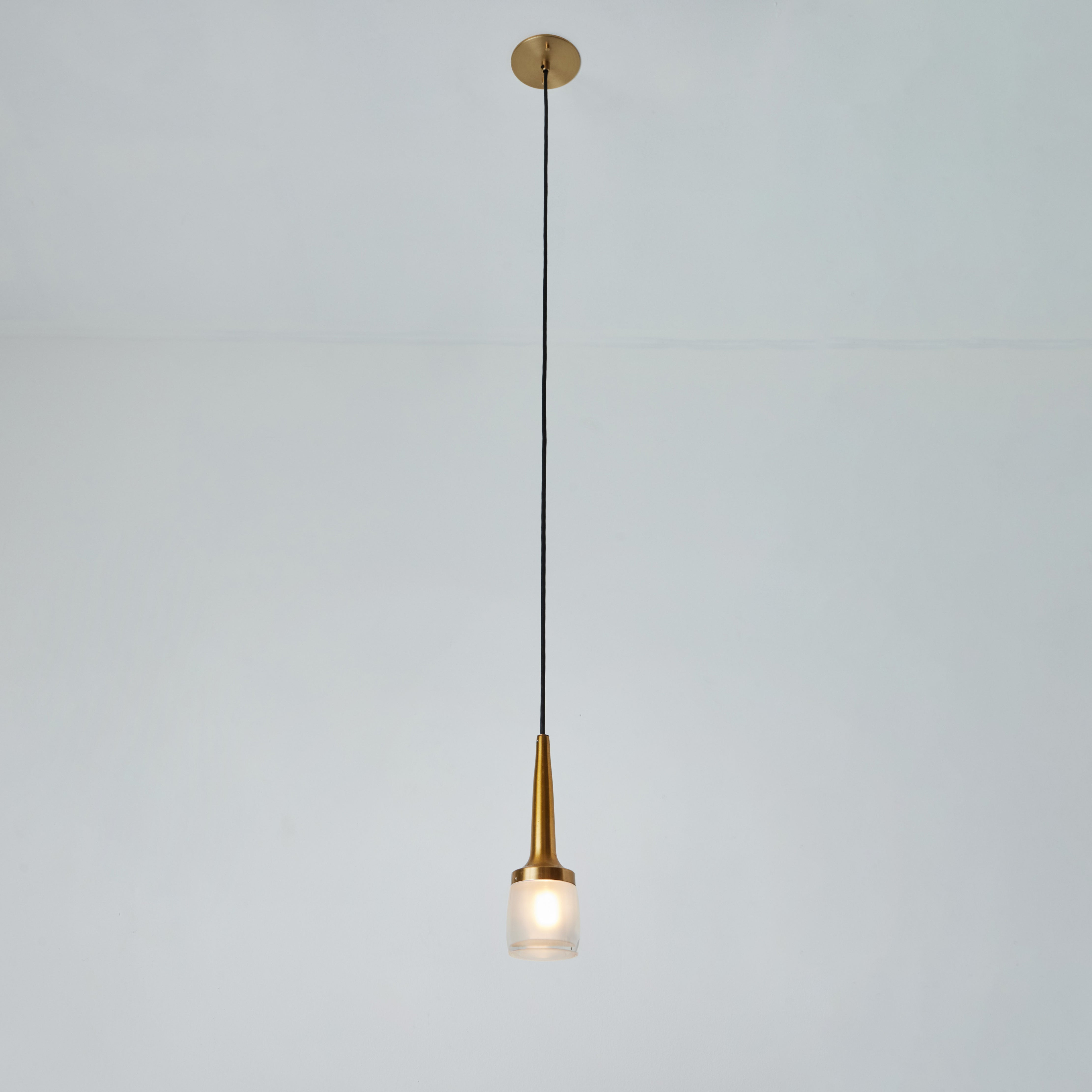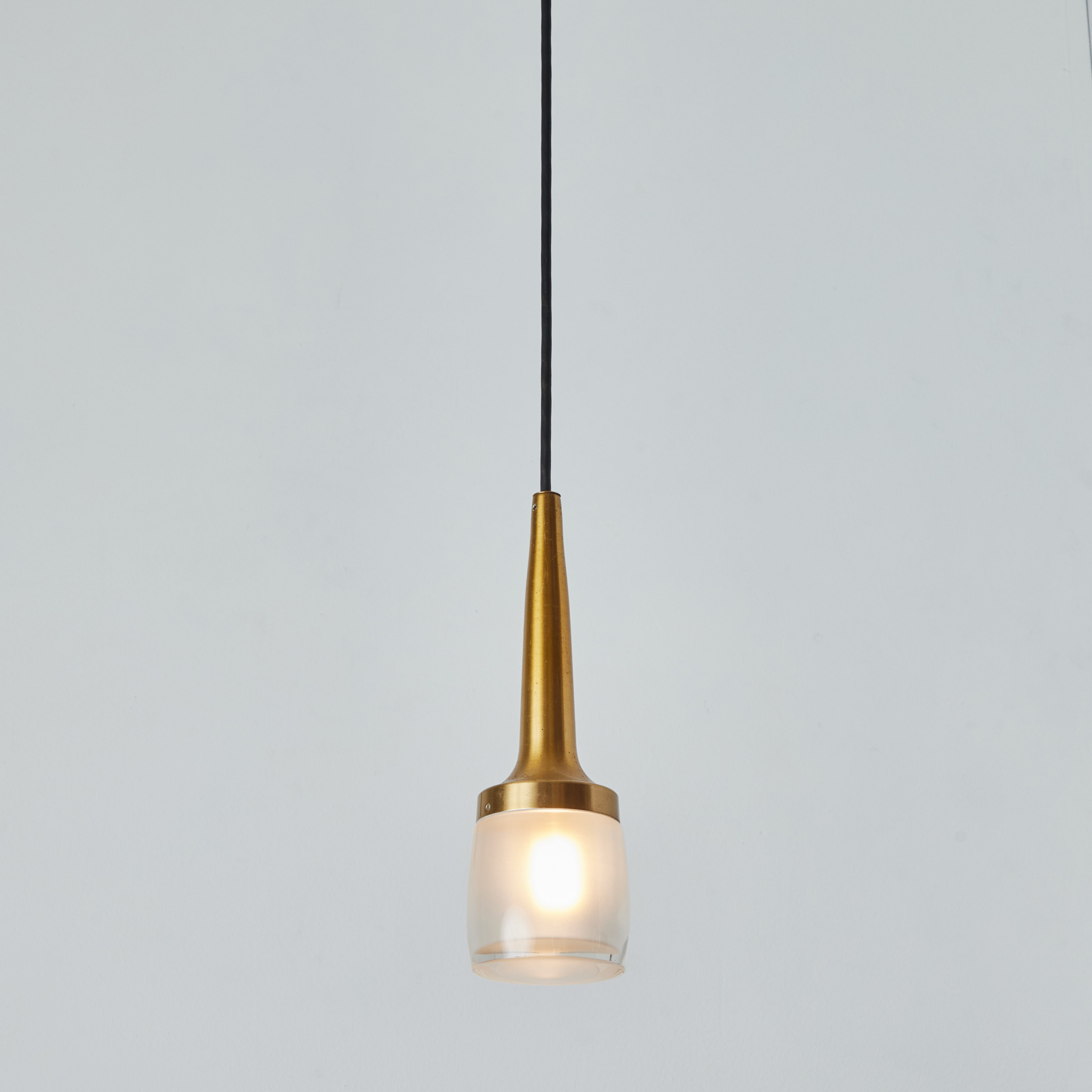Executed in brassed metal and thick opaline molded glass etched on the inside for a soft diffuse lighting effect. New custom solid brass canopy and thick cloth cord. Staff Leuchten produced these pendants in Germany, circa 1960s. Ideal for bars, powder rooms and other areas calling for soft lighting.