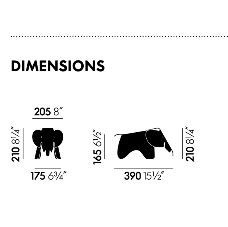 The Eames elephant is available in two sizes and seven colors, updated for 2026. Also available in wood in a separate listing. Lead times vary from 1-2 weeks to 6-8 weeks or more depending on the variant selected. Suitable for outdoor use, but should be brought inside to prevent fading/wear and tear.
