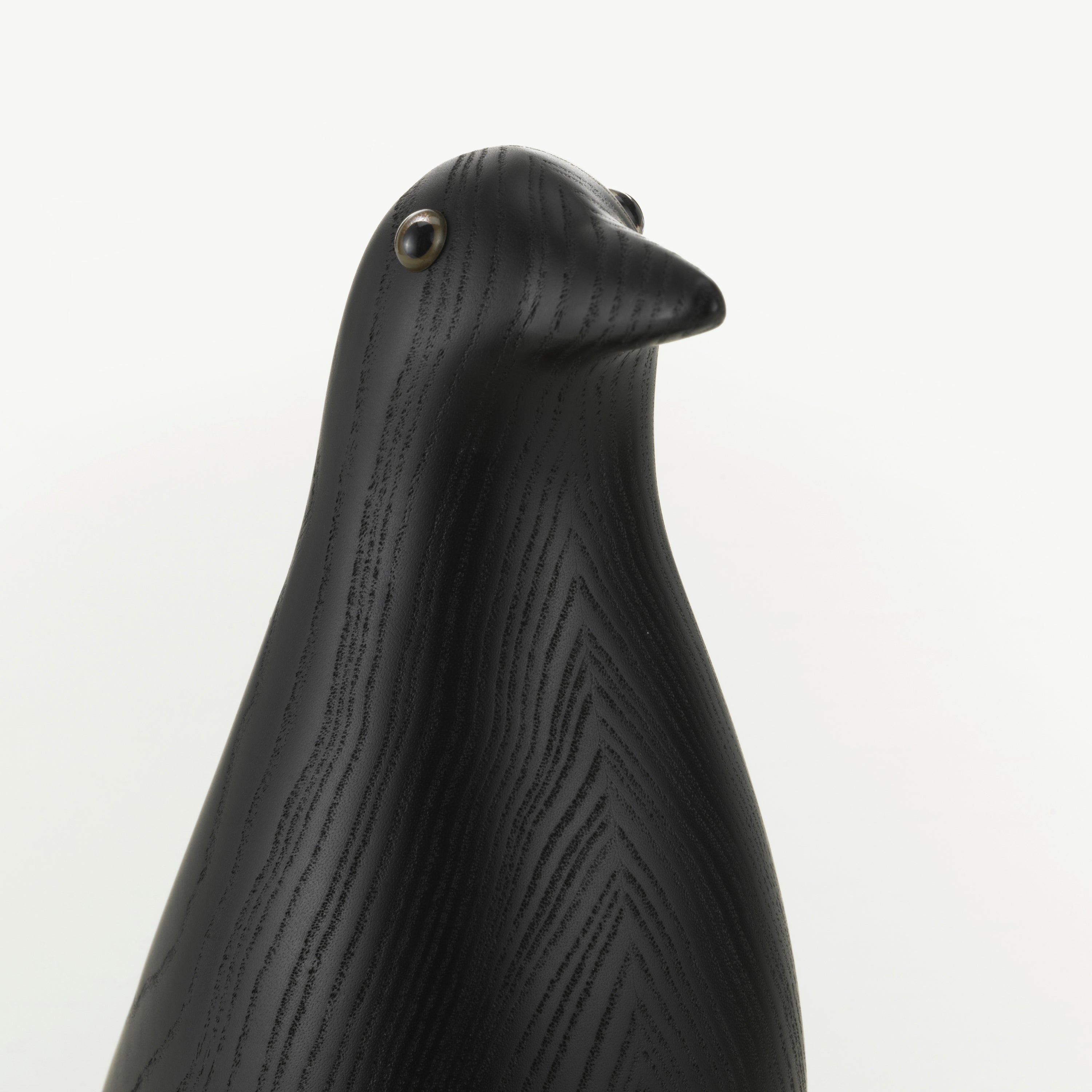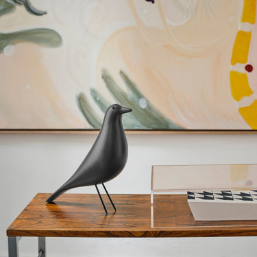 Charles and Ray Eames enriched the collage-like interior of their private home, the Eames House, with numerous objects and accessories that they brought back from their travels. For over fifty years, the figure of a wooden bird has stood in the centre of the living room – an artefact of American folk art that was evidently highly treasured by the couple, since it also appeared frequently as an accessory in photographs taken by Charles and Ray. Executed in solid walnut or black lacquered alder with steel legs, the House Bird remains an iconic Eames design.