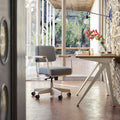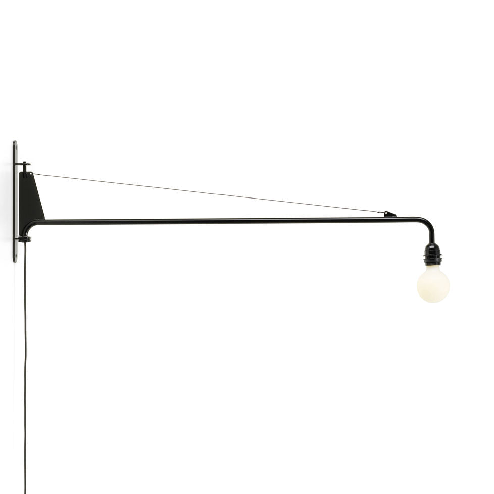 Jean Prouvé created the first version of the Potence wall lamp in the 1940s for his own home in Nancy: a simple light bulb affixed to a long, pivoting steel bar held by a steel wire. Executed in a powder-coated finish in colors derived from Prouvé's original colors. Thanks to its reductive aesthetic, 'Petite Potence' is an ideal lighting choice for a wide variety of settings, from dining and living rooms to offices or cafés.