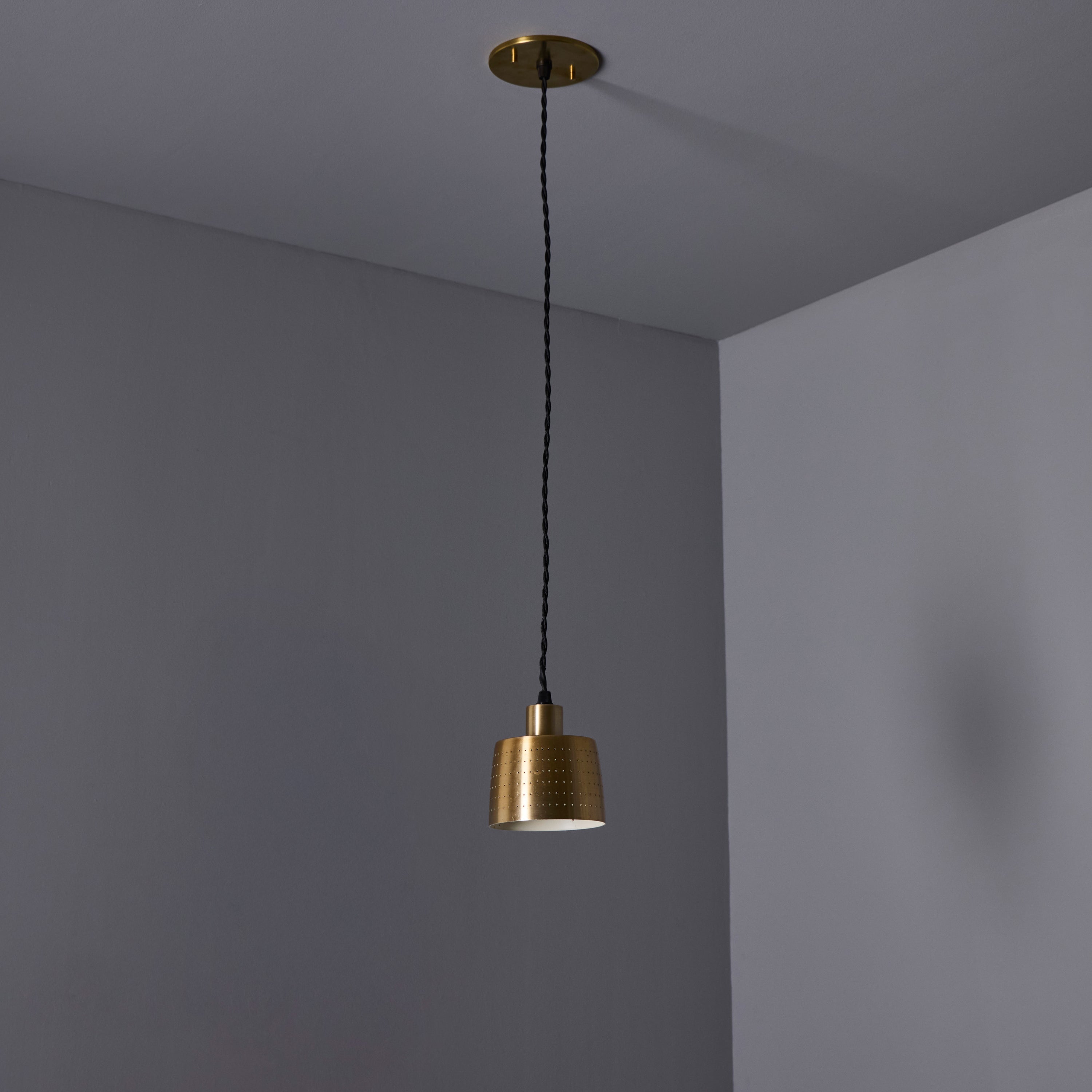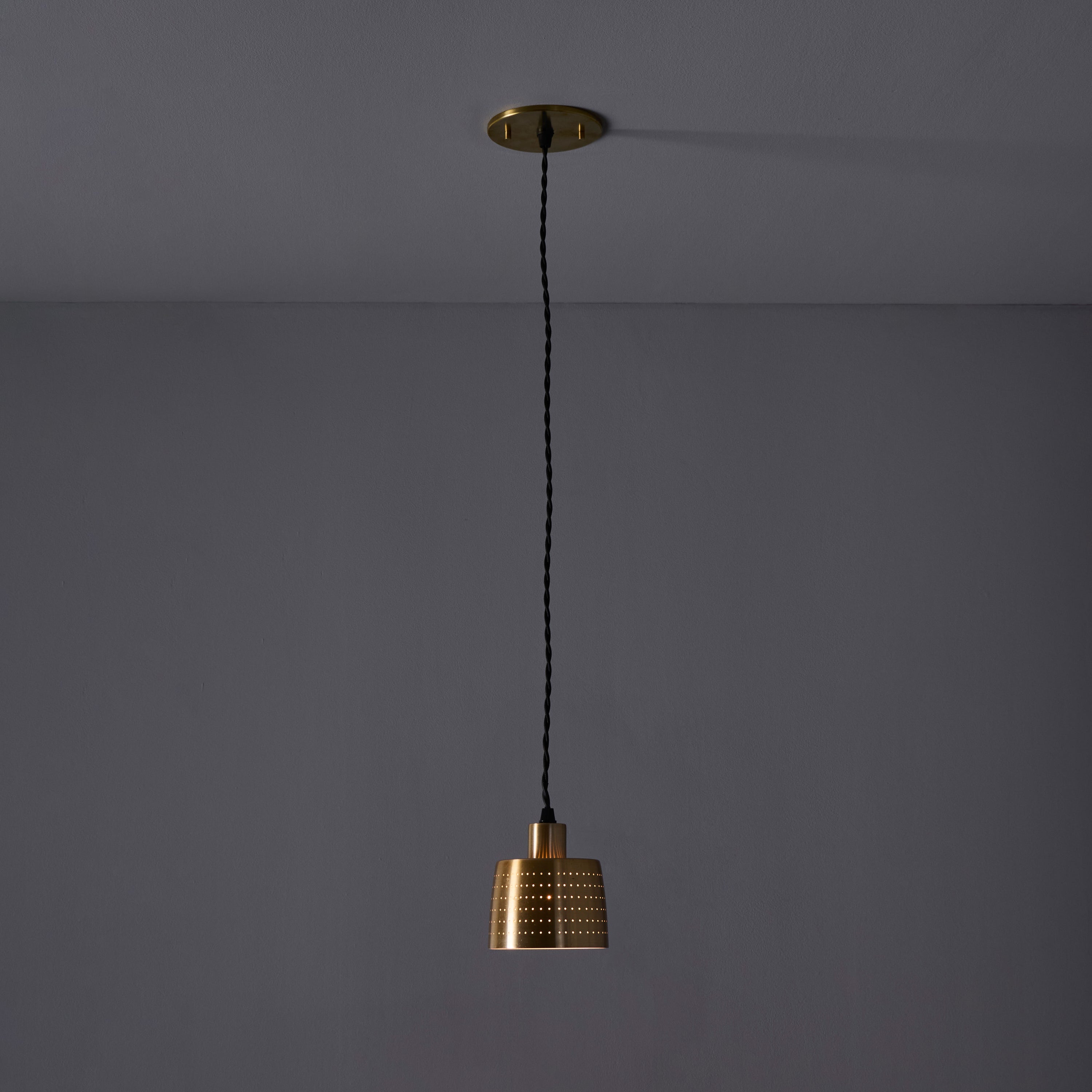 Executed in perforated brassed metal with an attractive patina, this sculptural pendant lamp is highly characteristic of quintessential Swedish design of the midcentury era. Unmarked. The perforated shade casts geometric light and shadow patterns when illuminated.
