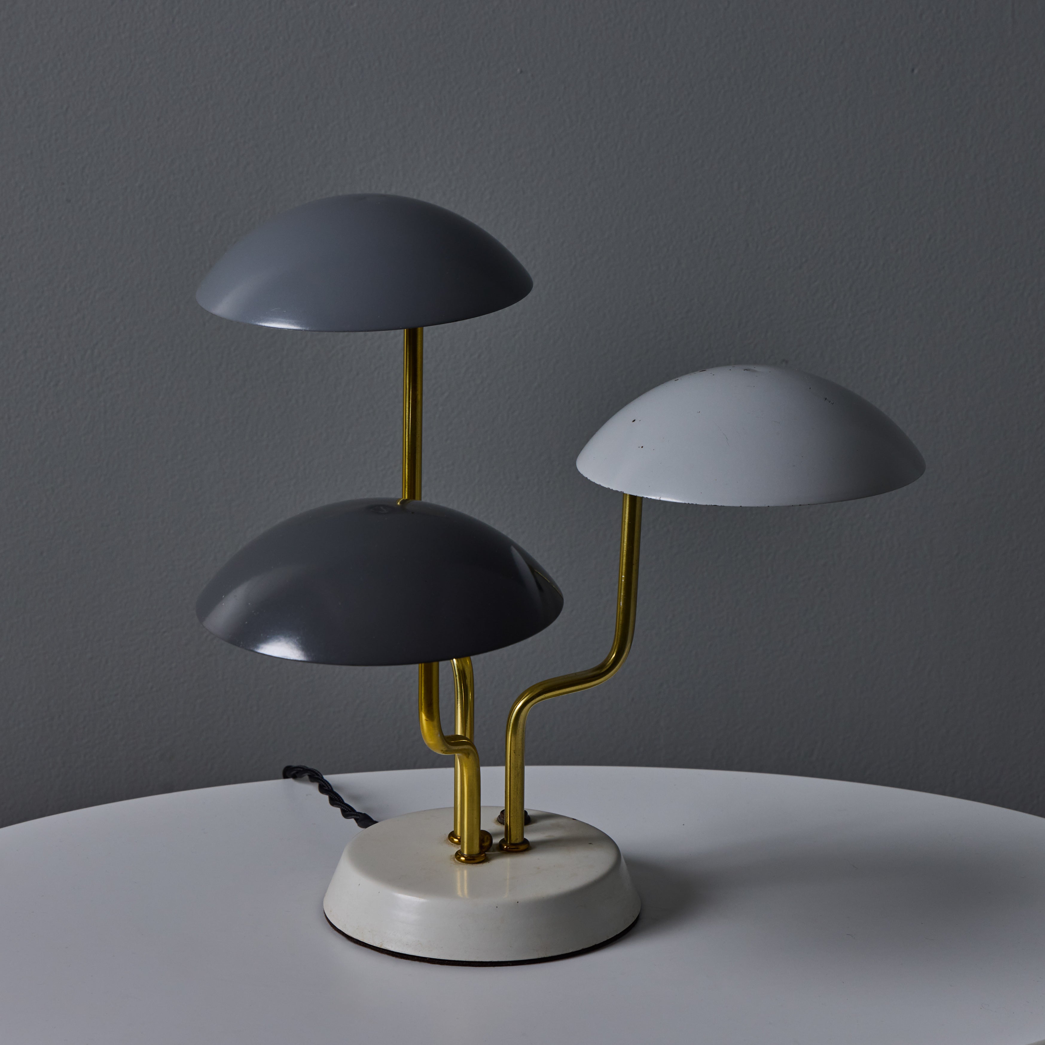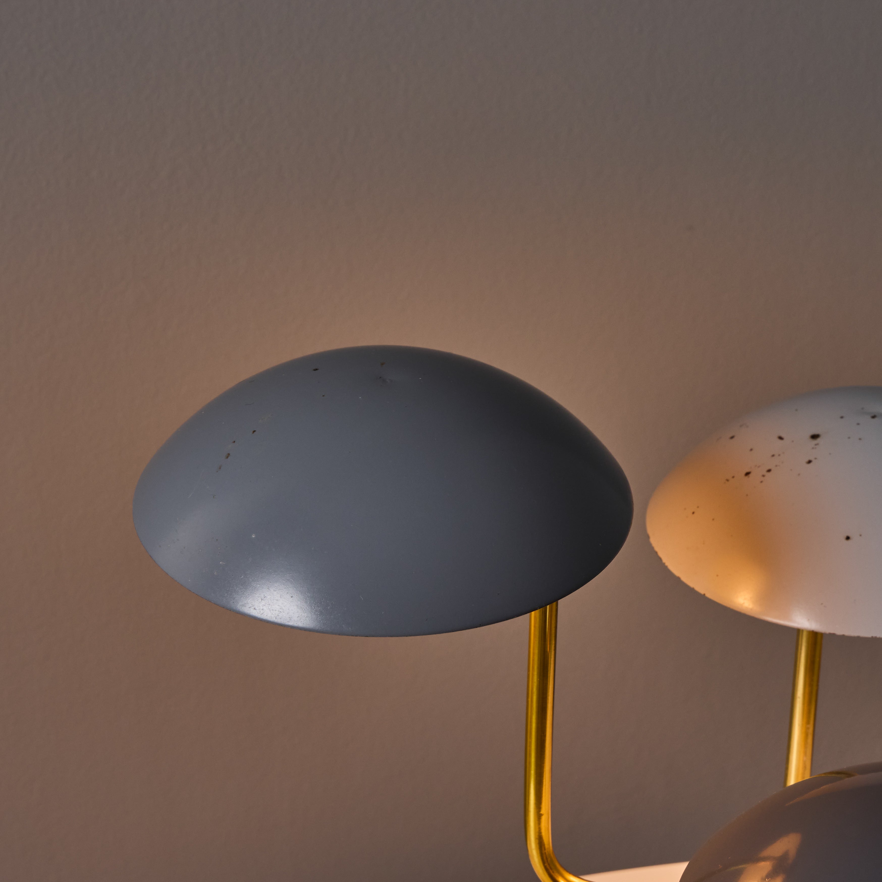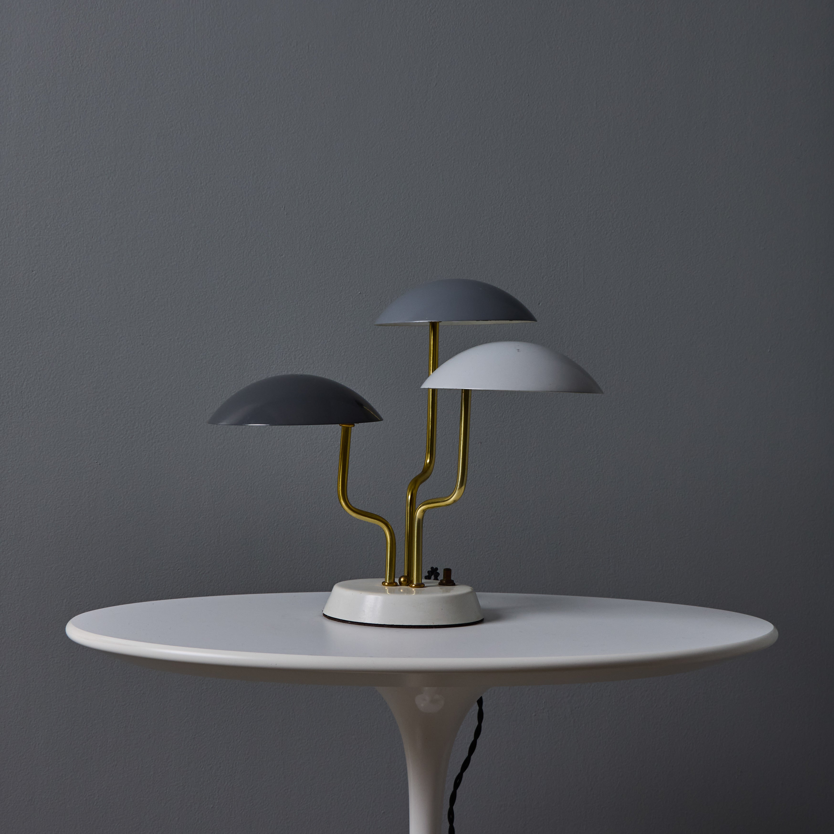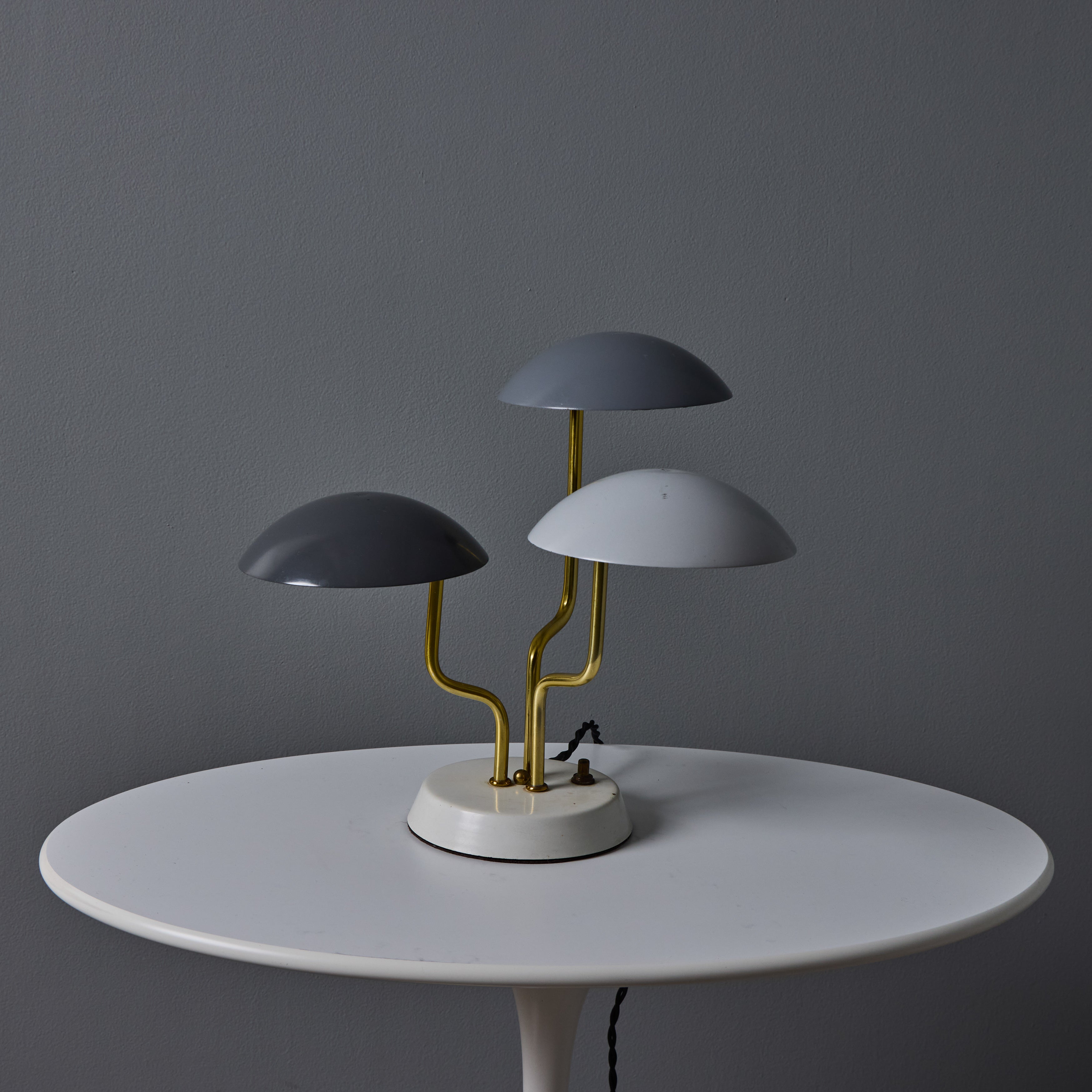 A striking yet minimalistic table lamp designed by Gino Sarfatti, circa 1952. This extremely rare and iconic design is executed in lightly patinated brass and metal shades painted in greys and whites. Original colors in good vintage condition. The individual saucer shades rotate independently for a variety of lighting configurations of a uniquely sculptural quality. Arteluce was one of the most innovative lighting design companies in Italy during the midcentury era, with Sarfatti their superstar. His designs have been long sought after by collectors in the know.