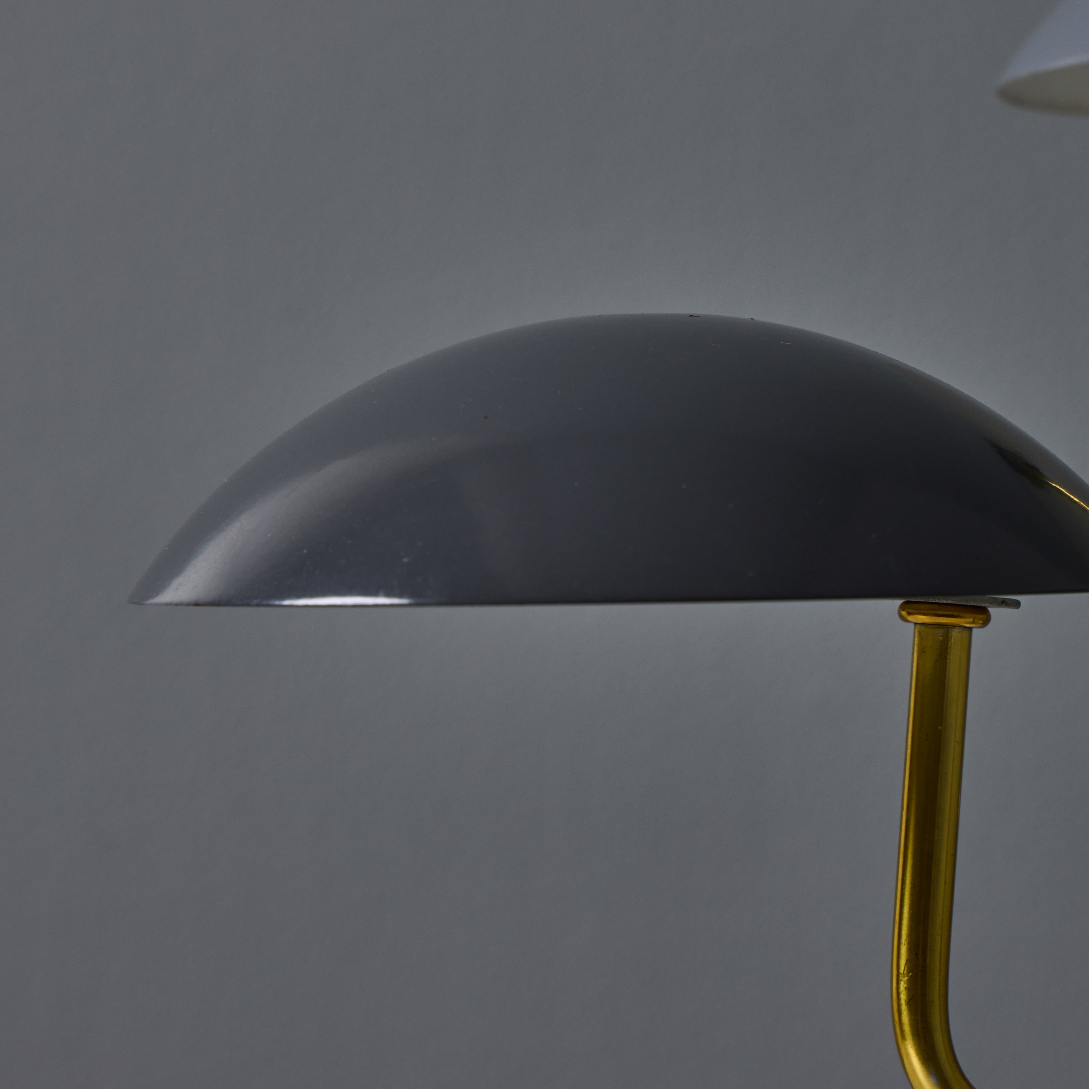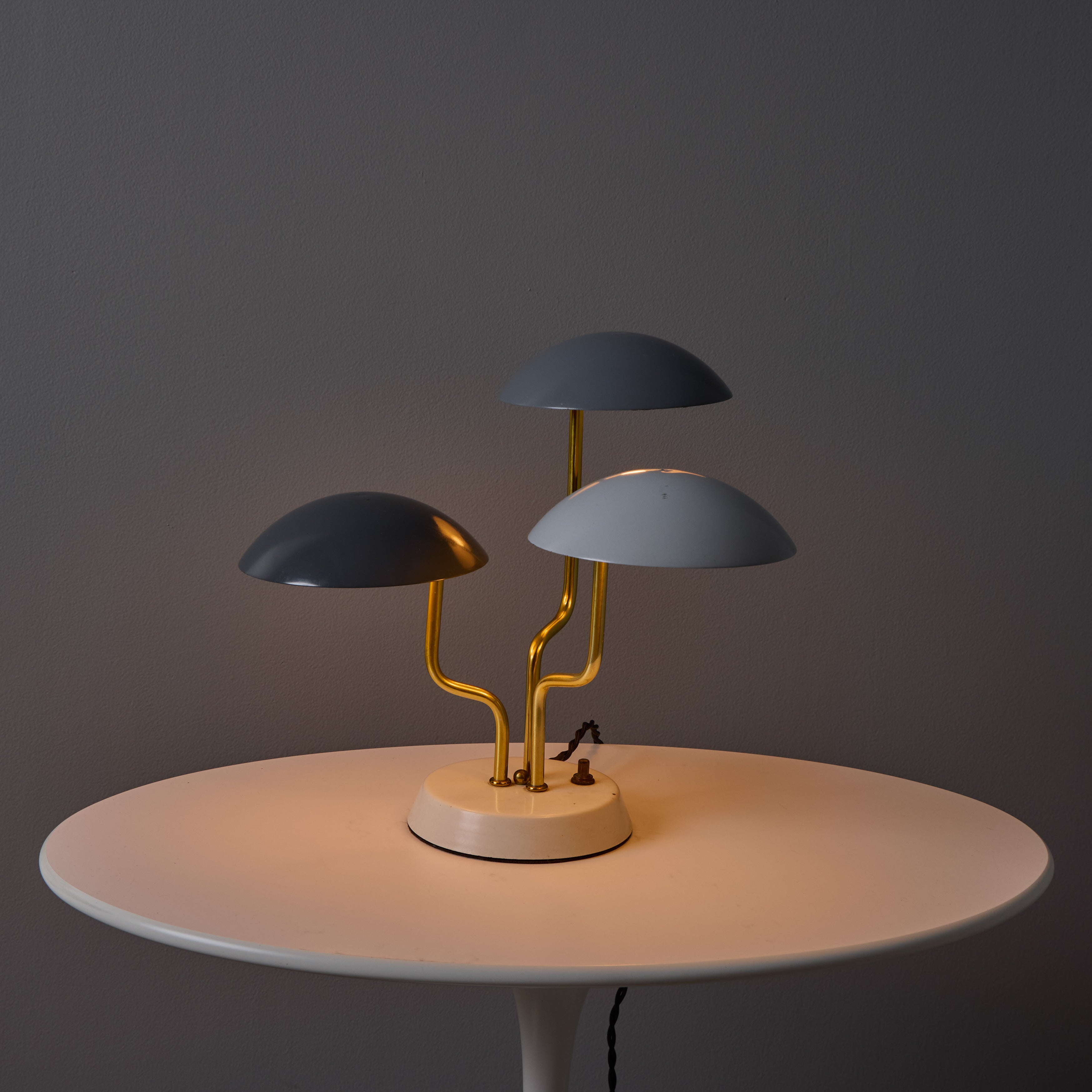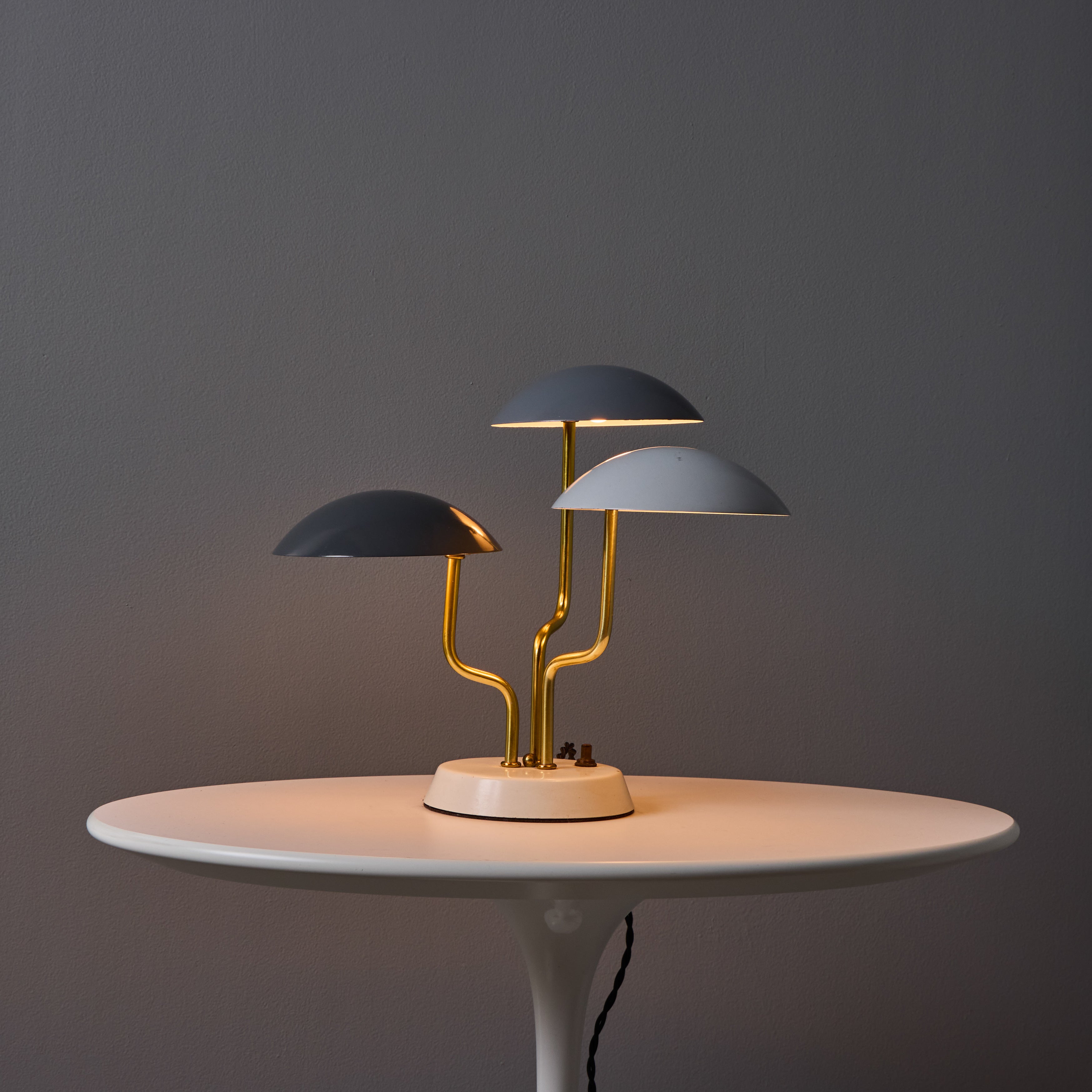A striking yet minimalistic table lamp designed by Gino Sarfatti, circa 1952. This extremely rare and iconic design is executed in lightly patinated brass and metal shades painted in greys and whites. Original colors in good vintage condition. The individual saucer shades rotate independently for a variety of lighting configurations of a uniquely sculptural quality. Arteluce was one of the most innovative lighting design companies in Italy during the midcentury era, with Sarfatti their superstar. His designs have been long sought after by collectors in the know.