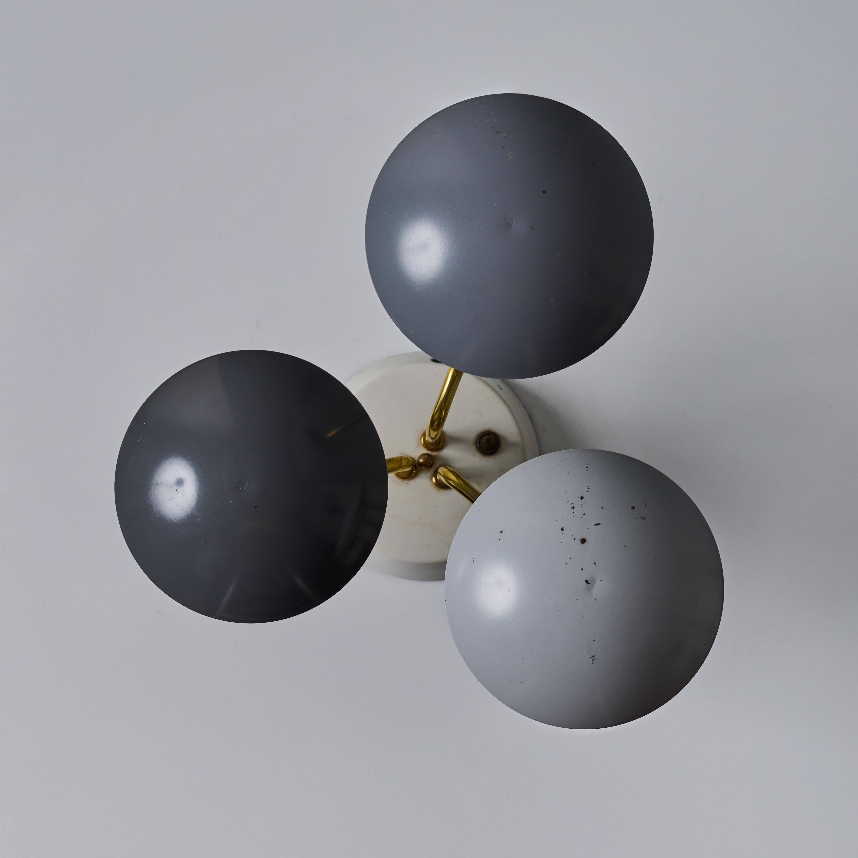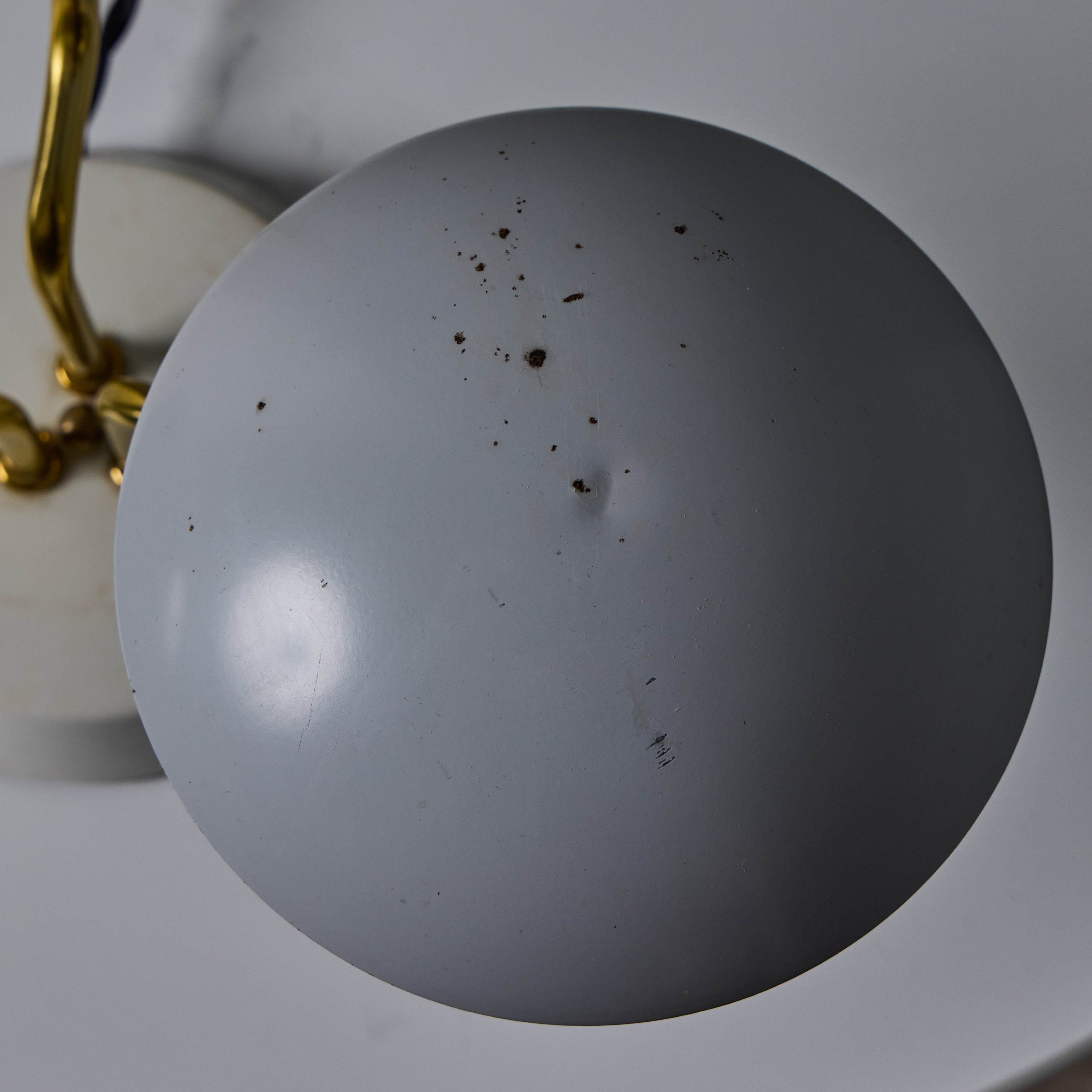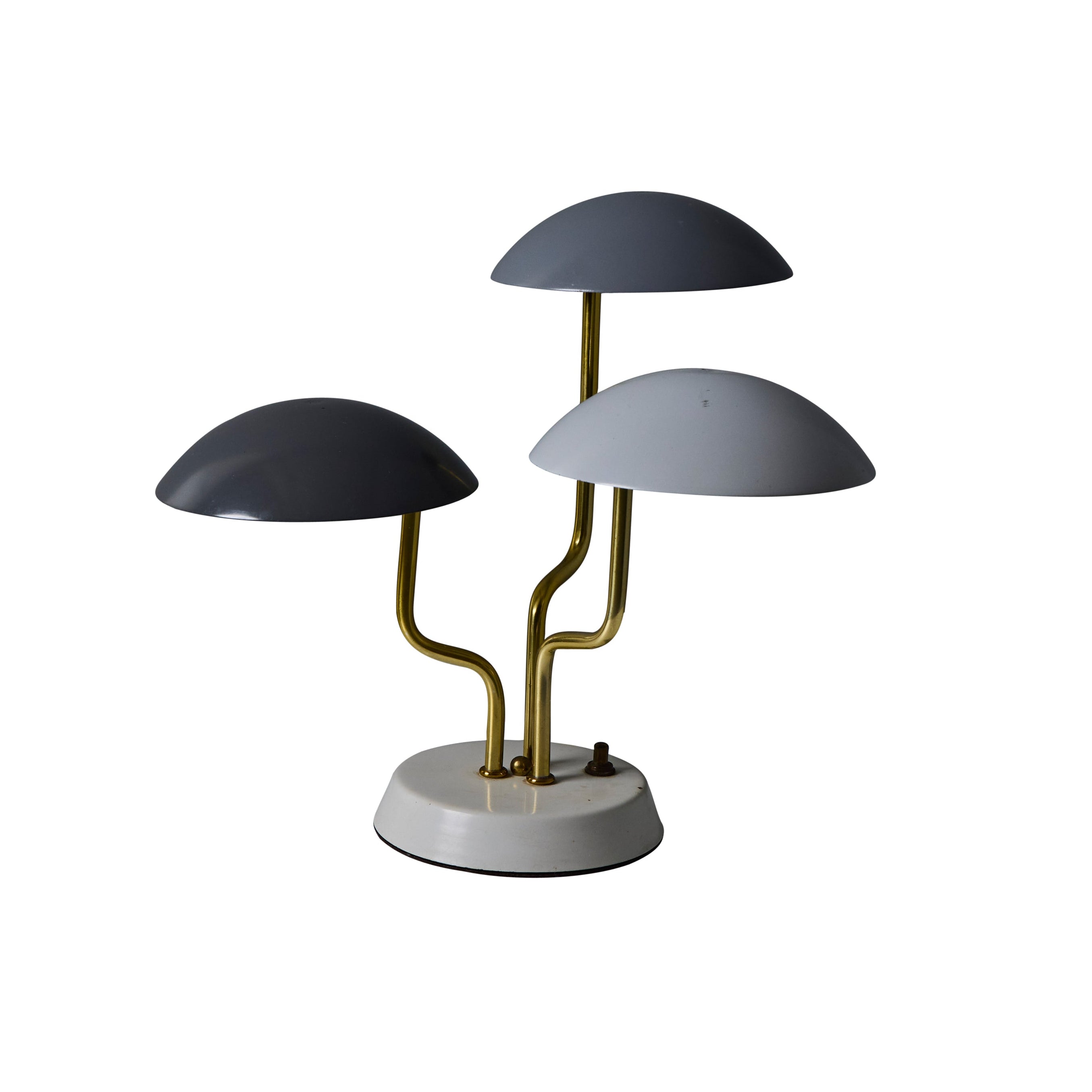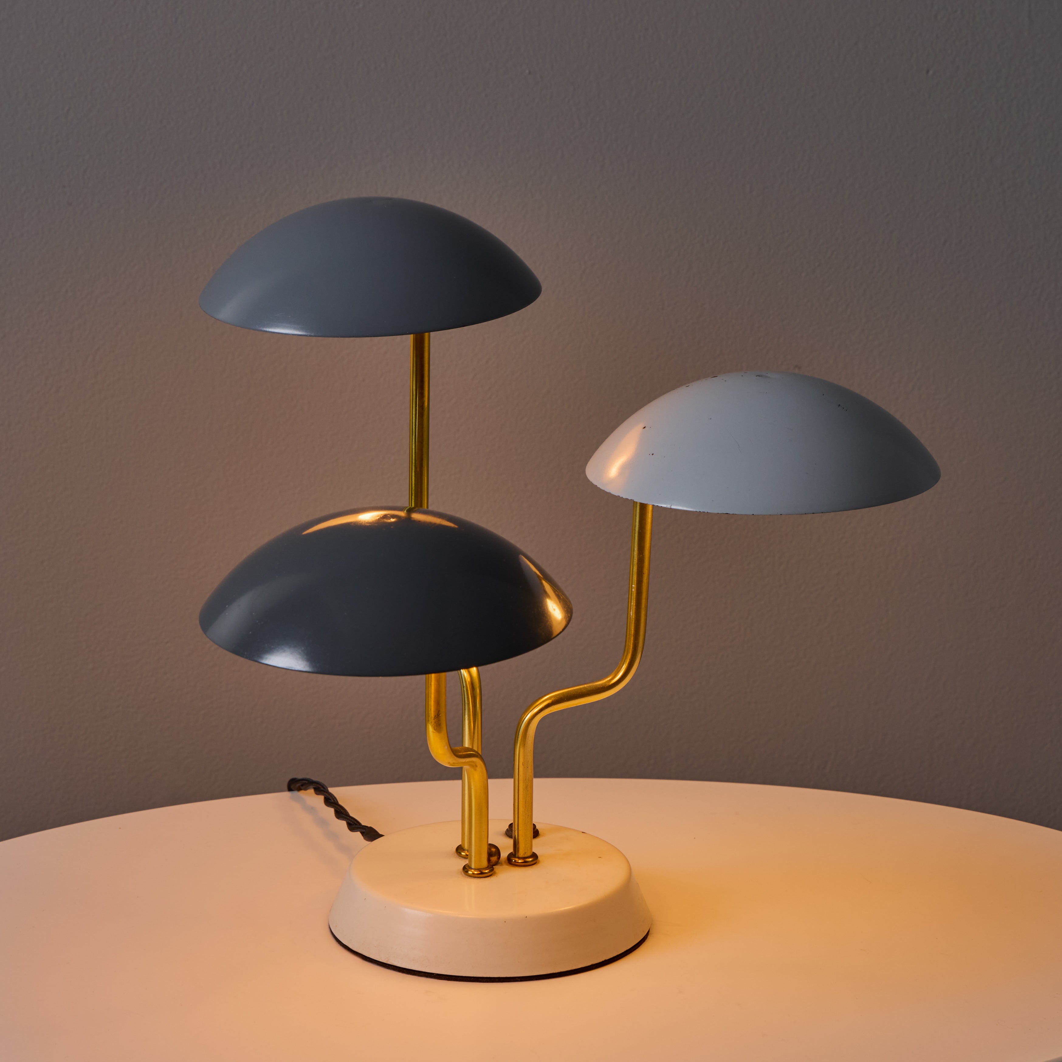 A striking yet minimalistic table lamp designed by Gino Sarfatti, circa 1952. This extremely rare and iconic design is executed in lightly patinated brass and metal shades painted in greys and whites. Original colors in good vintage condition. The individual saucer shades rotate independently for a variety of lighting configurations of a uniquely sculptural quality. Arteluce was one of the most innovative lighting design companies in Italy during the midcentury era, with Sarfatti their superstar. His designs have been long sought after by collectors in the know.