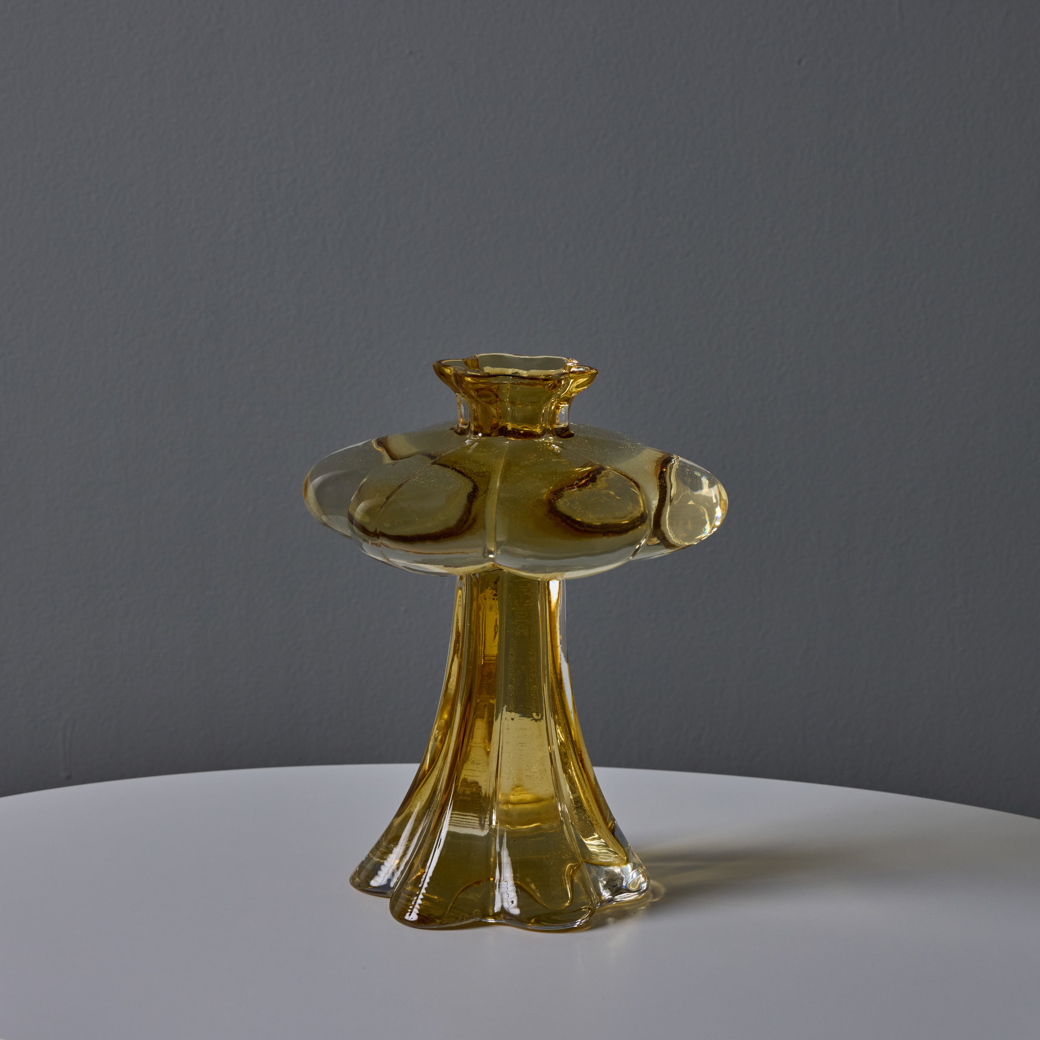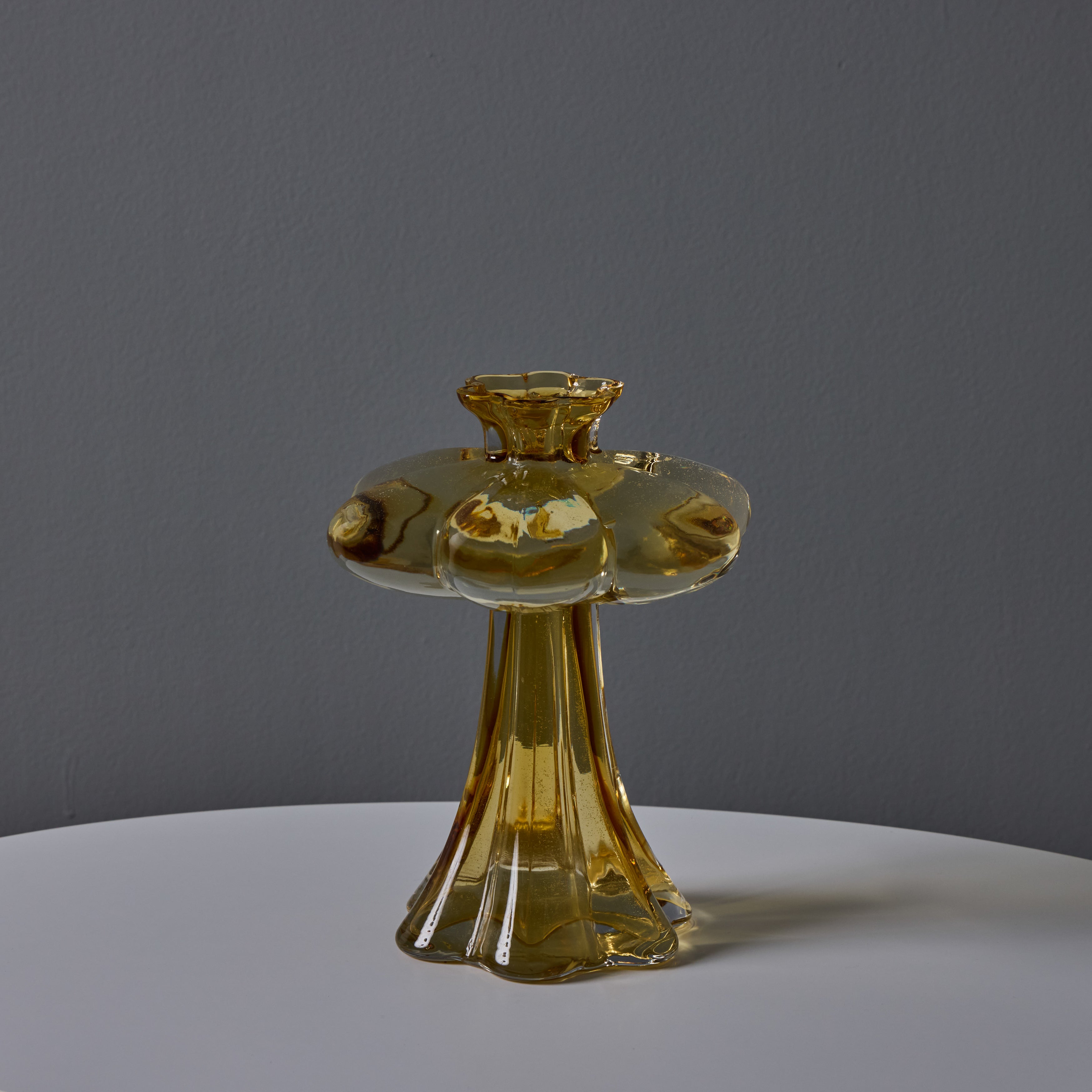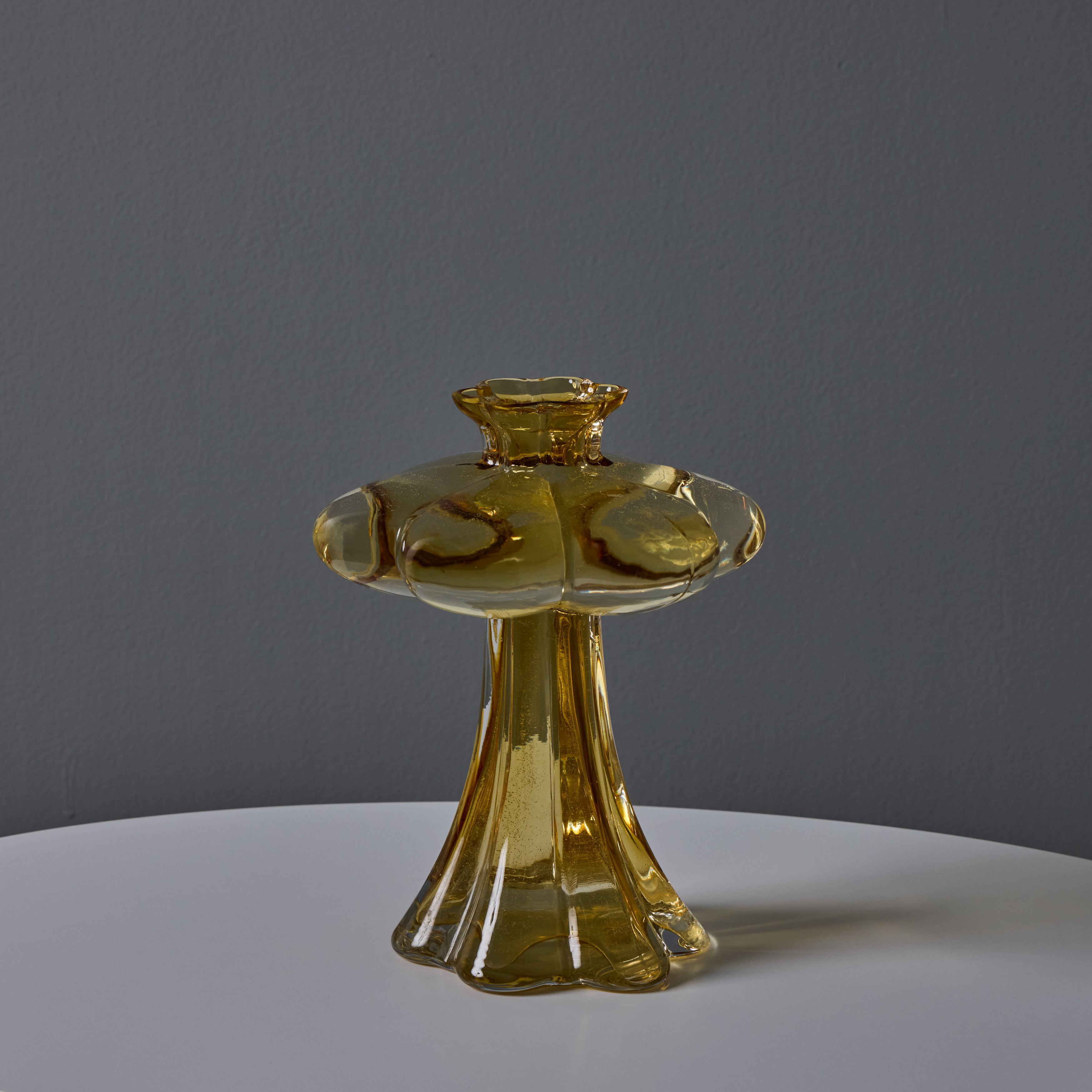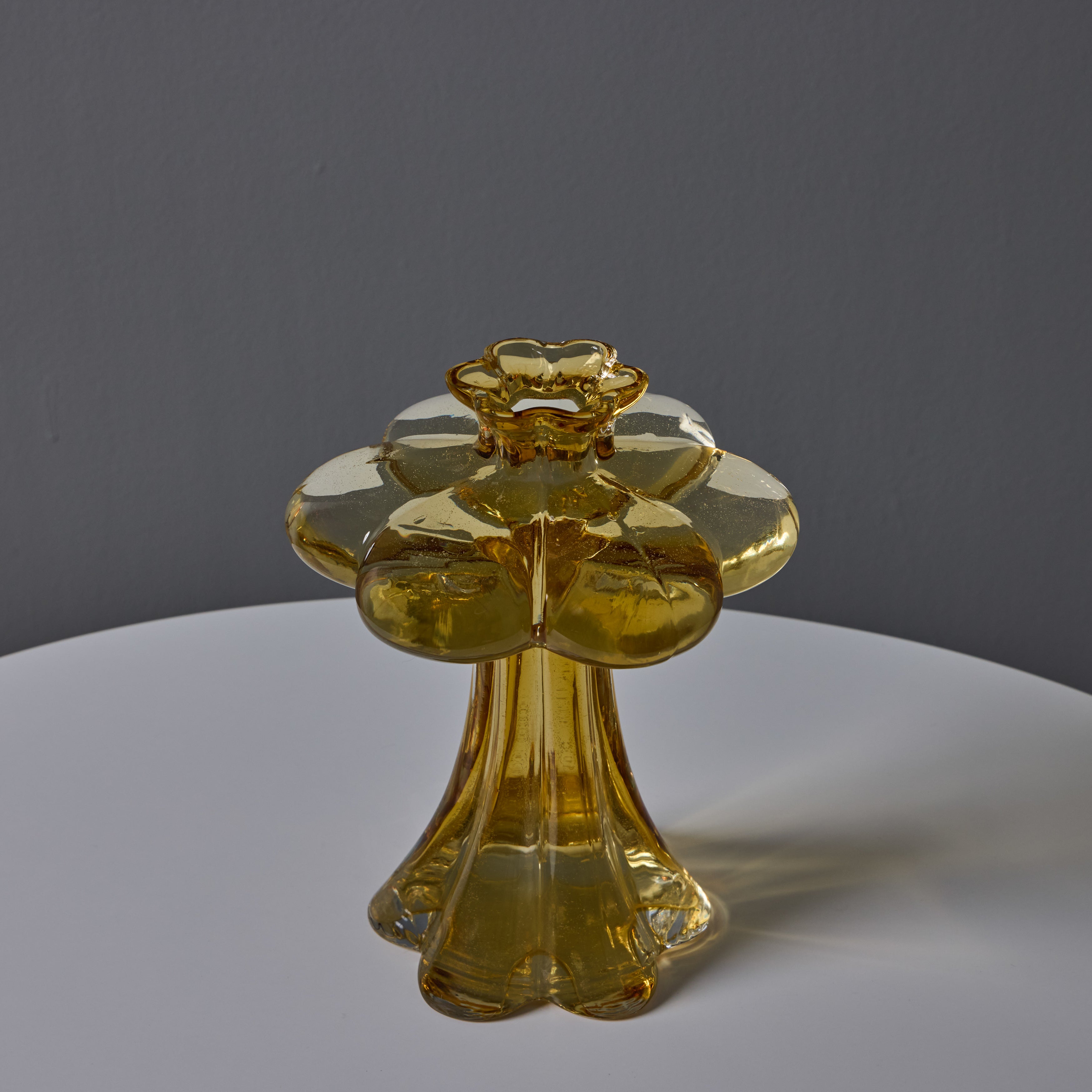 Sculpturally executed in amber glass. Helena Tynell designed many classics for Finland's Riihimäen Lasi glassworks, the most well-known of which being 'Aurinkopullo' (meaning 'sun bottle') from 1964. The Paisankukka or "Flower for the day" vase features soft layered curves of glass and a 6-inch diameter 'flower' near the opening.