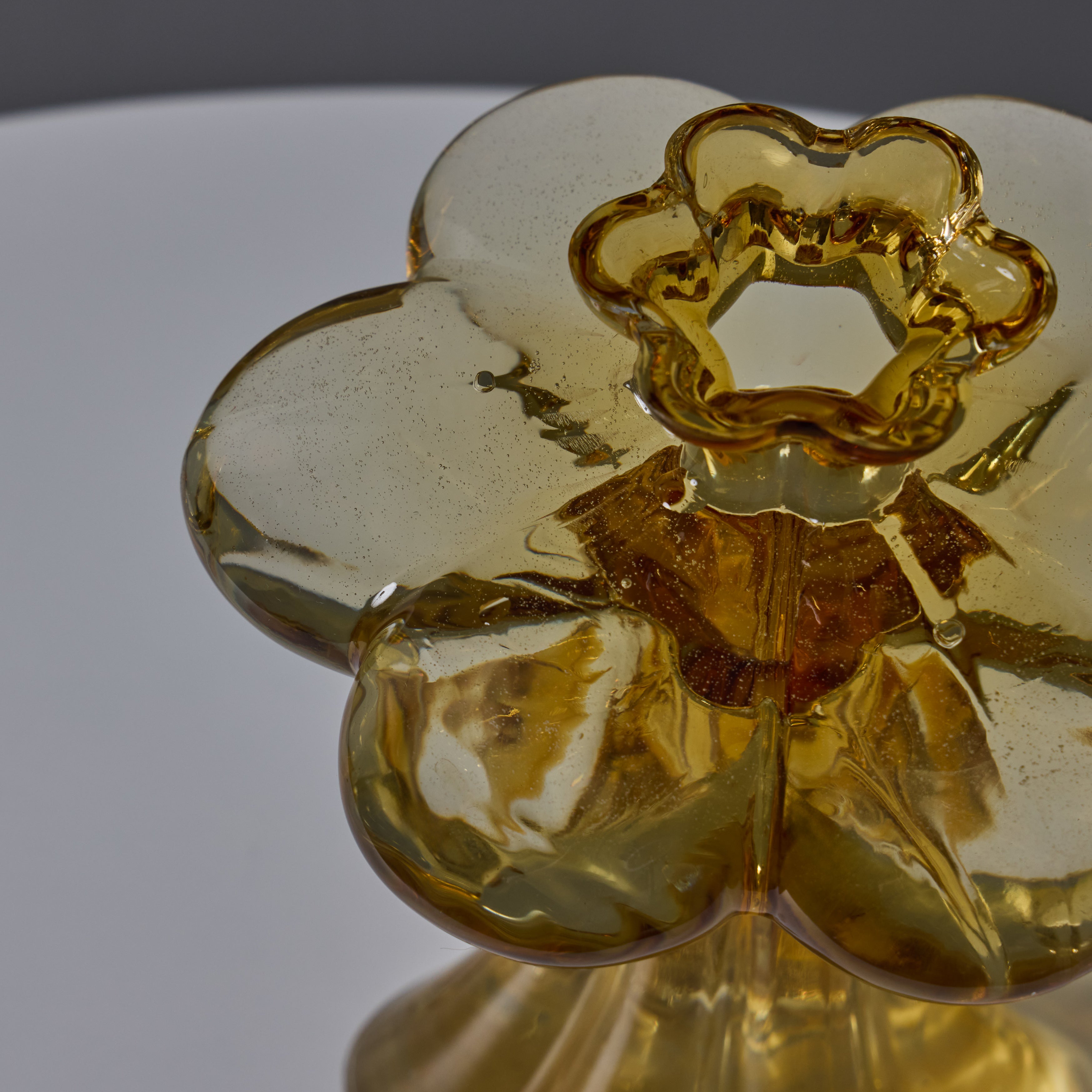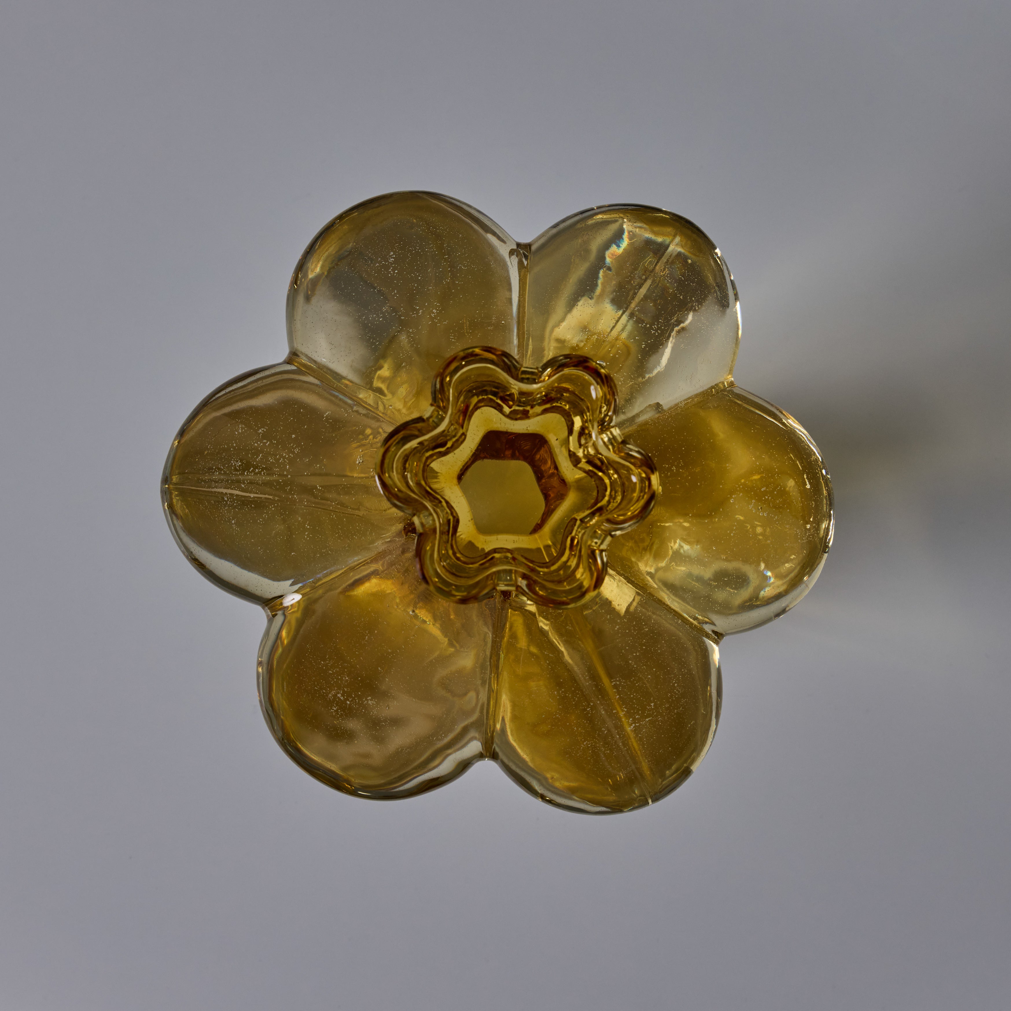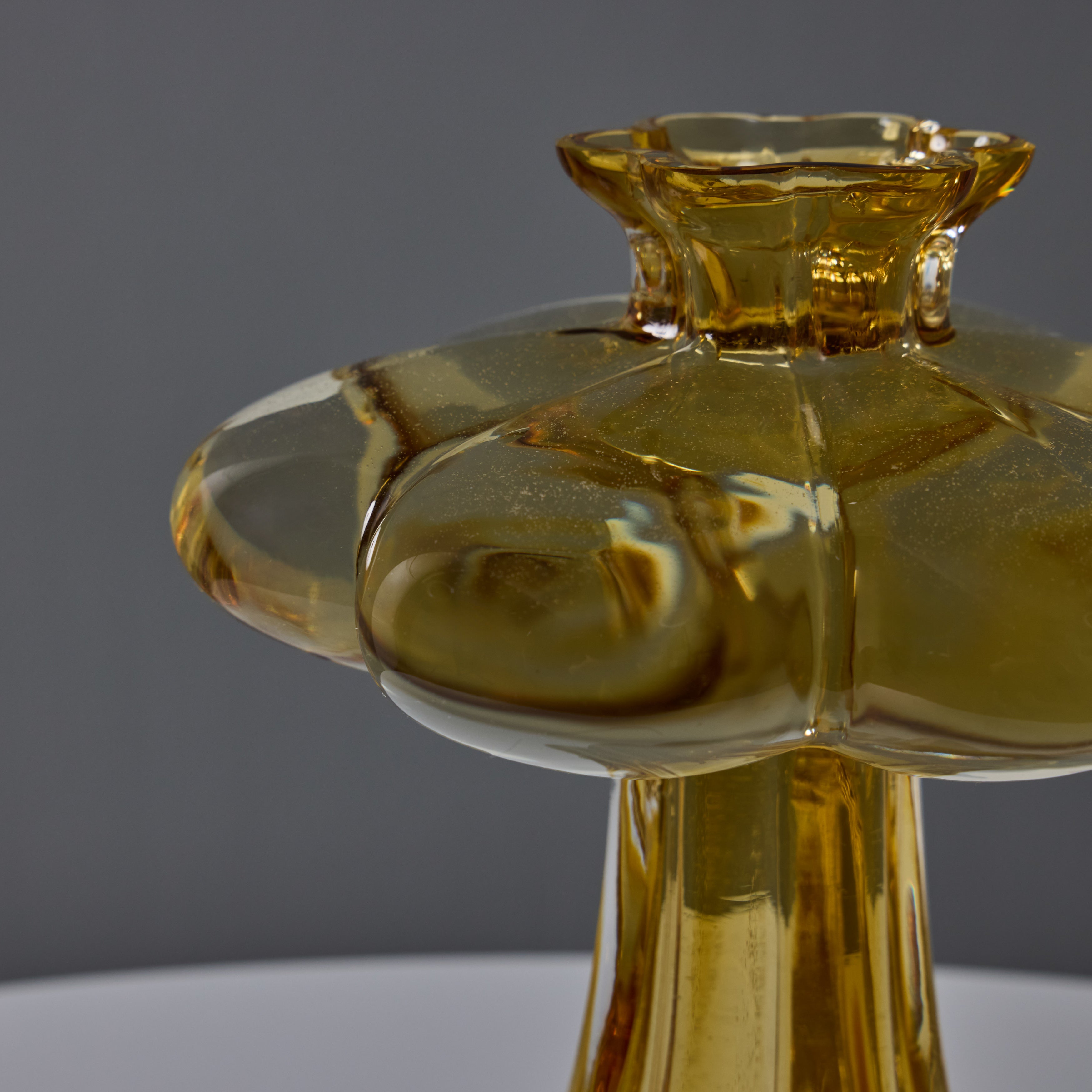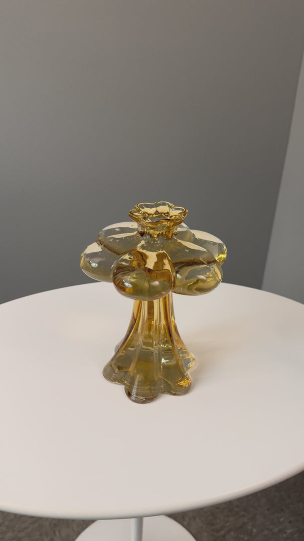 Sculpturally executed in amber glass. Helena Tynell designed many classics for Finland's Riihimäen Lasi glassworks, the most well-known of which being 'Aurinkopullo' (meaning 'sun bottle') from 1964. The Paisankukka or "Flower for the day" vase features soft layered curves of glass and a 6-inch diameter 'flower' near the opening.