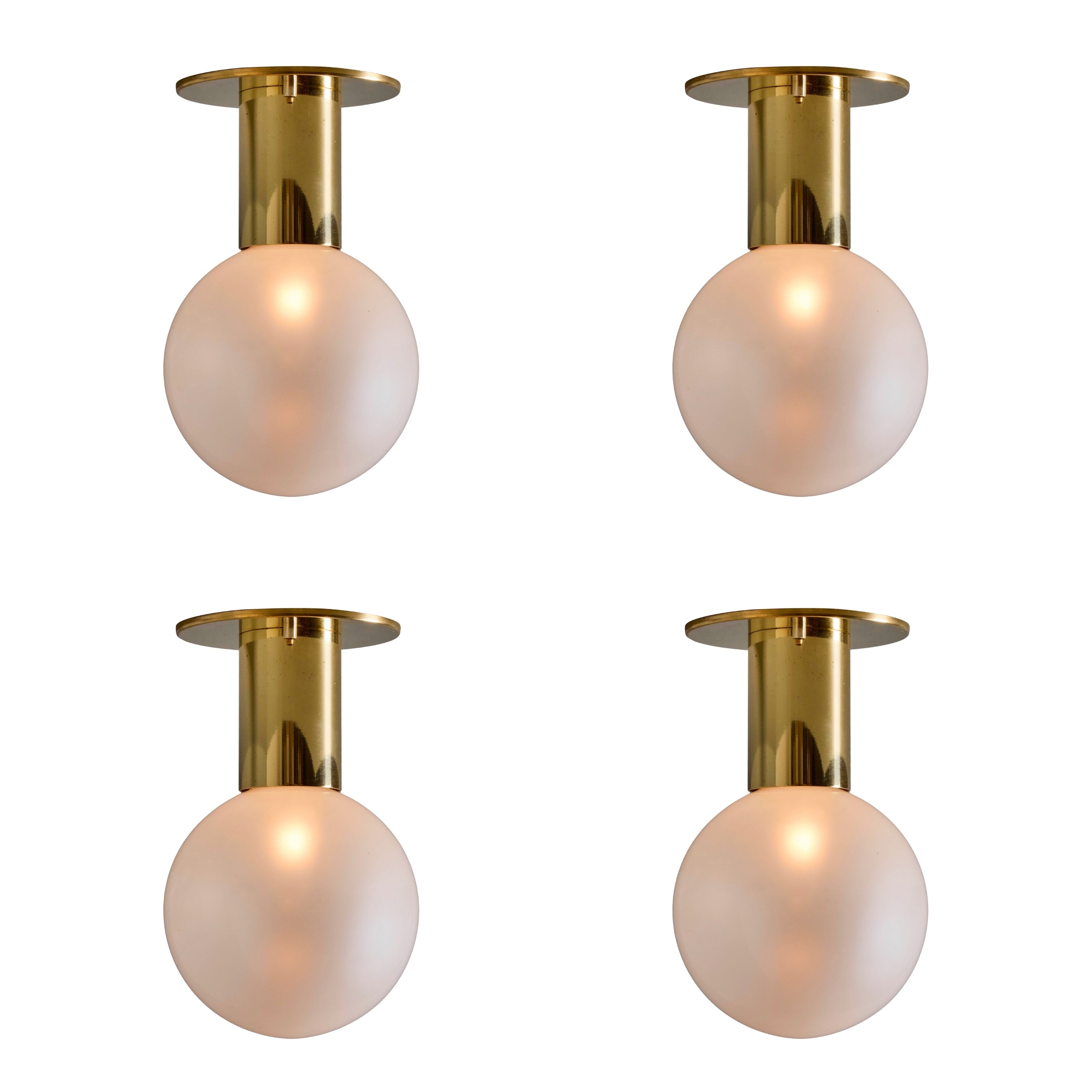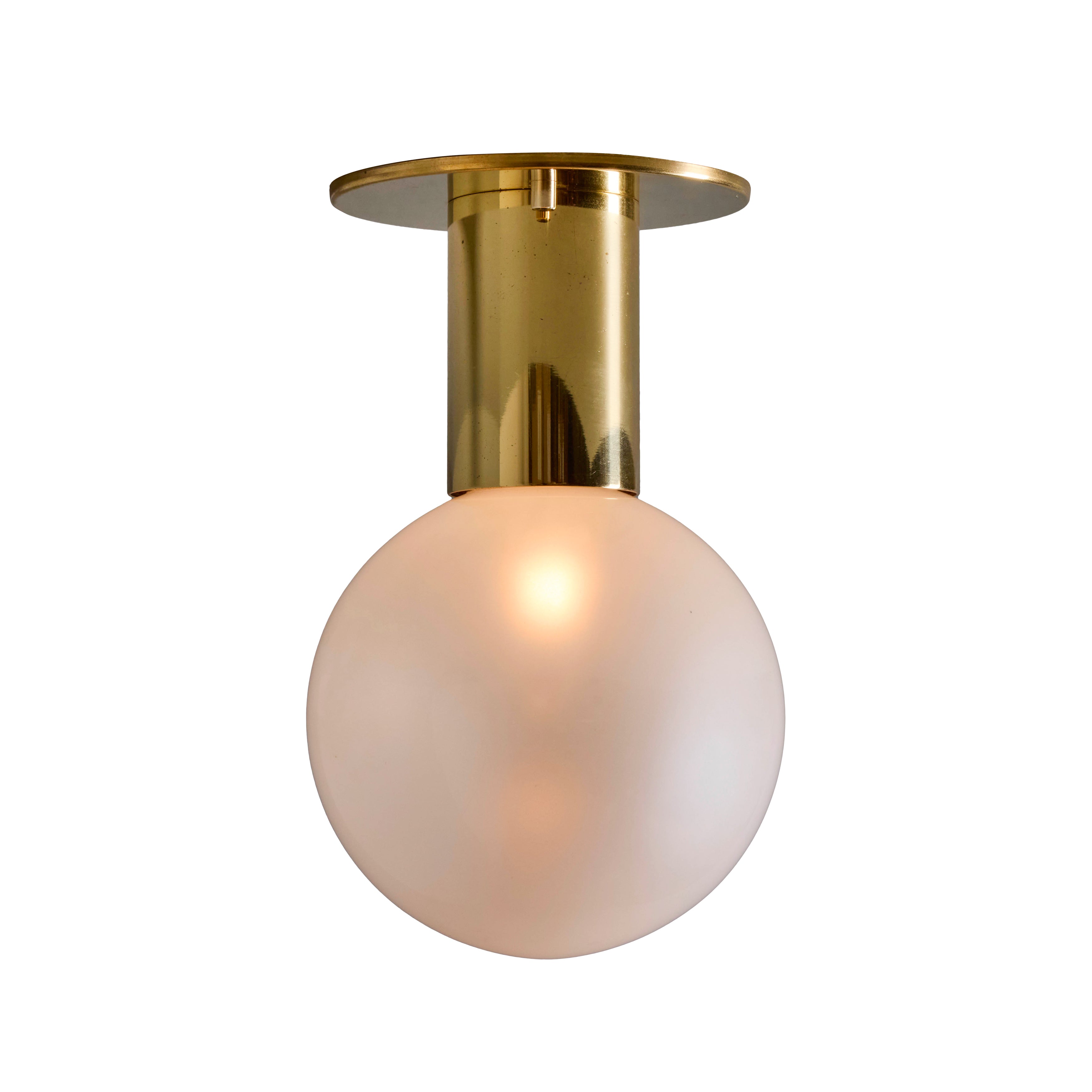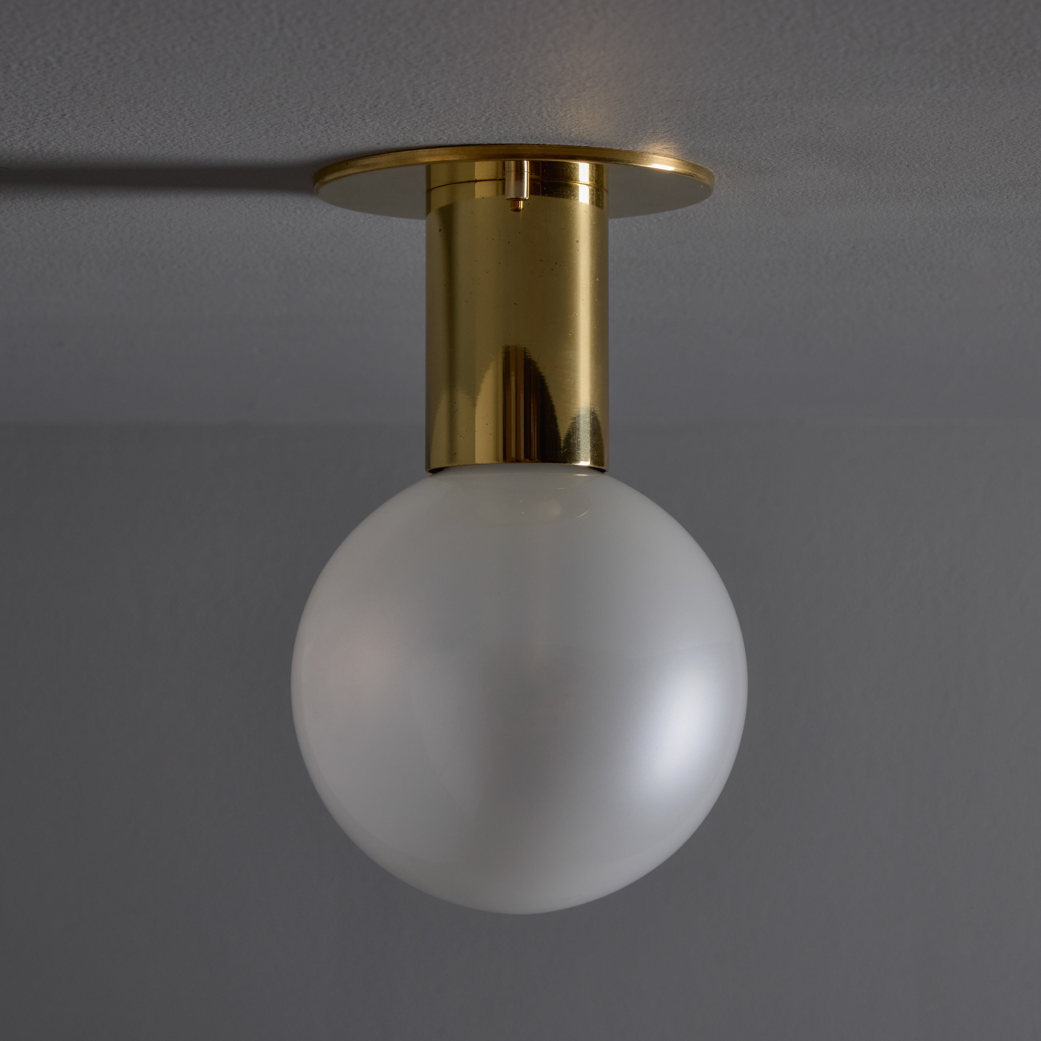 Executed in brass-plated metal and delicate blown opaline glass that reveals a soft pearlescent sheen when unlit. Produced in Germany in the 1960s and 1970s and designed by Japanese lighting pioneer Motoko Ishii; this wall light is among her refined mid-century designs produced by German manufacturer Staff Leuchten. The glass casts a pleasant warm glow that is ideal for powder rooms and interiors in need of soft indirect lighting.