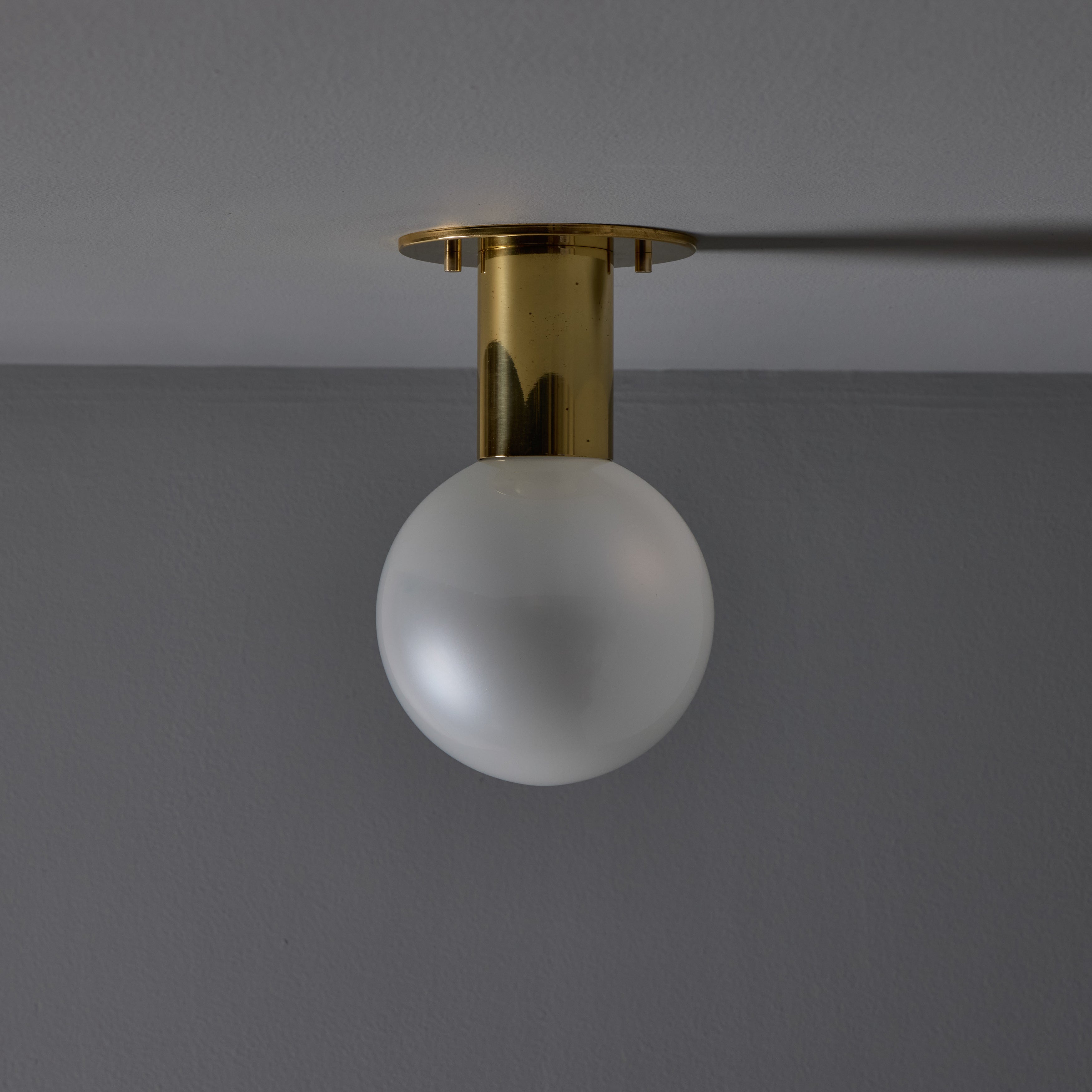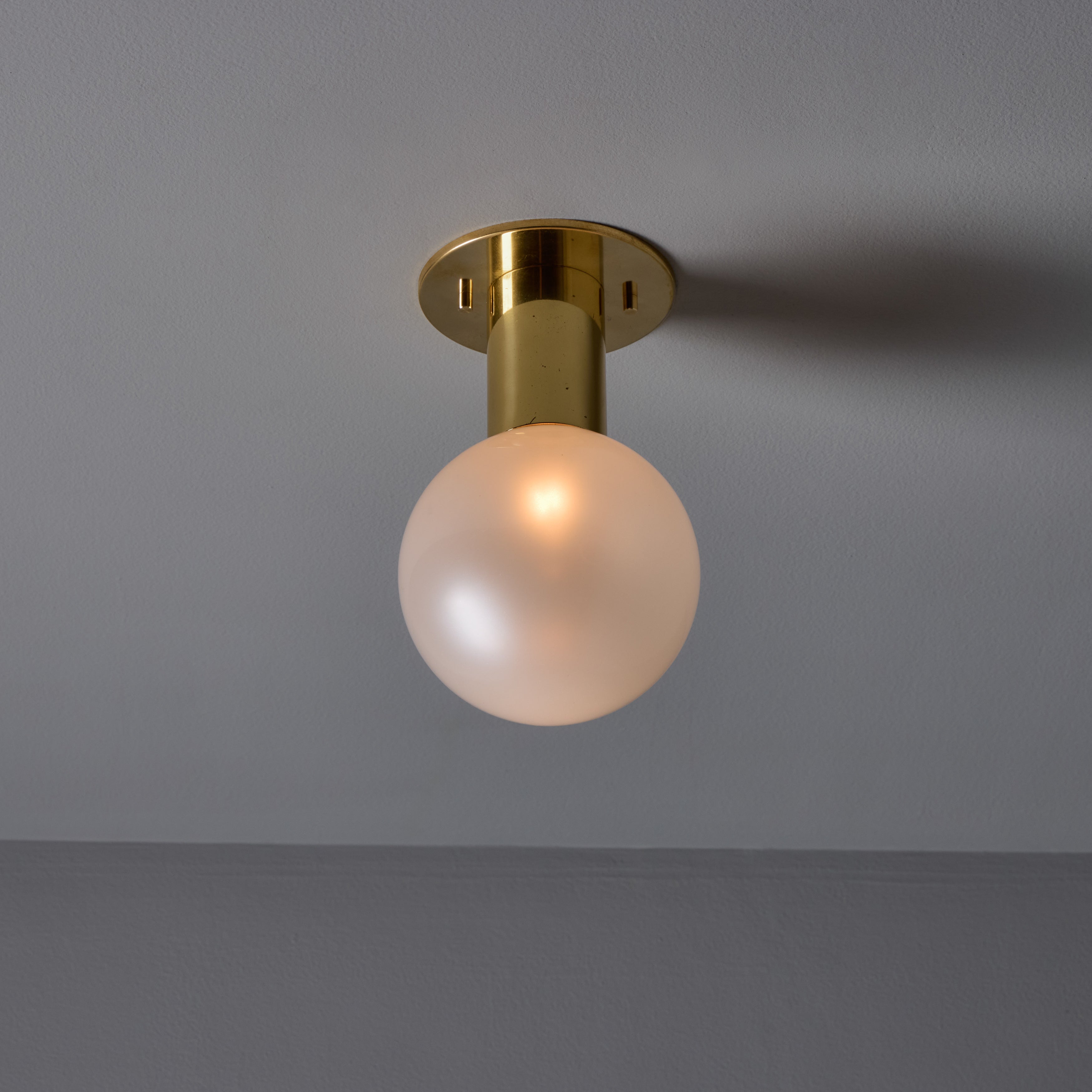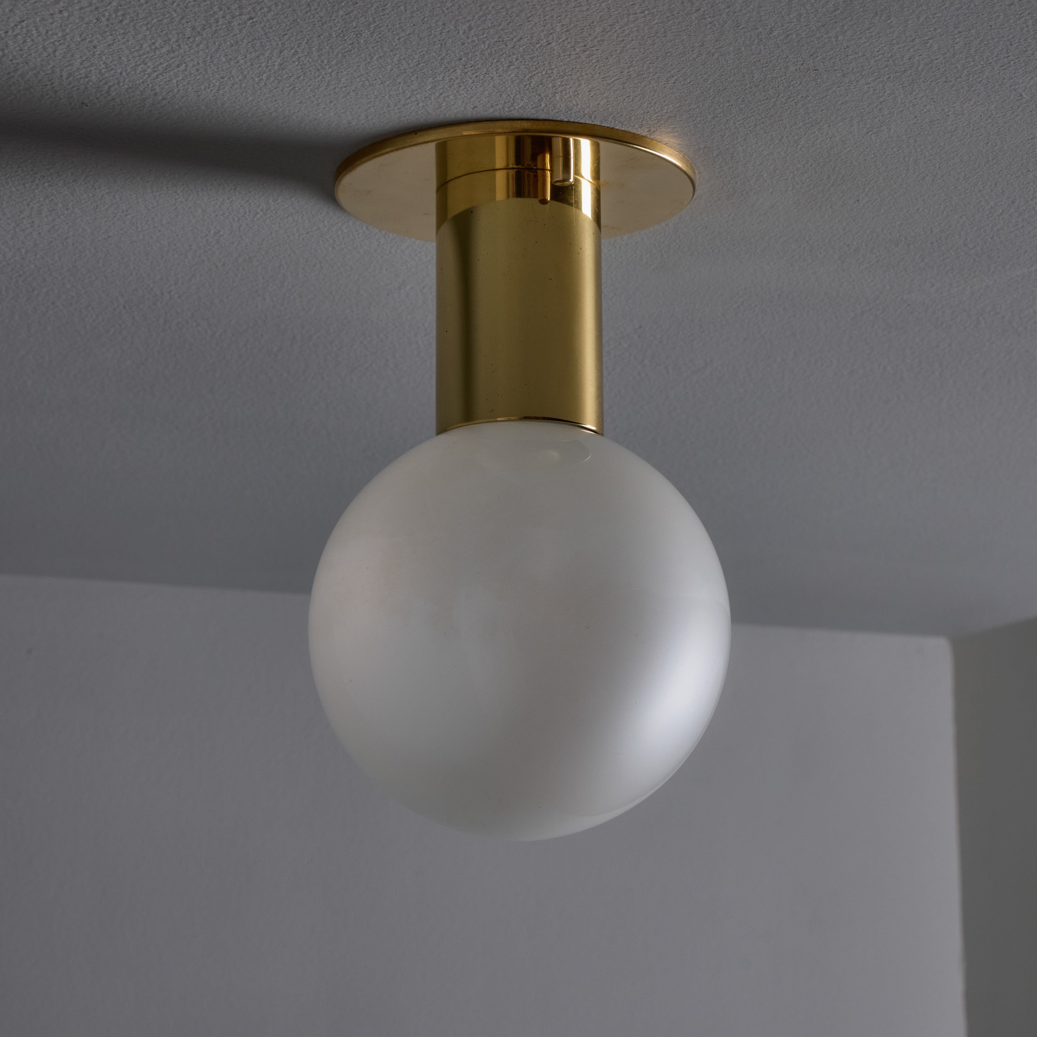 Executed in brass-plated metal and delicate blown opaline glass that reveals a soft pearlescent sheen when unlit. Produced in Germany in the 1960s and 1970s and designed by Japanese lighting pioneer Motoko Ishii; this wall light is among her refined mid-century designs produced by German manufacturer Staff Leuchten. The glass casts a pleasant warm glow that is ideal for powder rooms and interiors in need of soft indirect lighting.