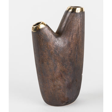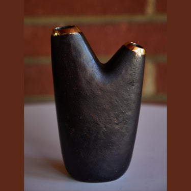 Designed in the 1950s, this incredibly refined and sculptural Viennese vase is executed in polished and darkly patinated brass by Werkstätte Carl Auböck, Austria. Each piece bears the "Auböck" stamp on the bottom of the base. A beautiful housewarming gift for the design lover in your life.