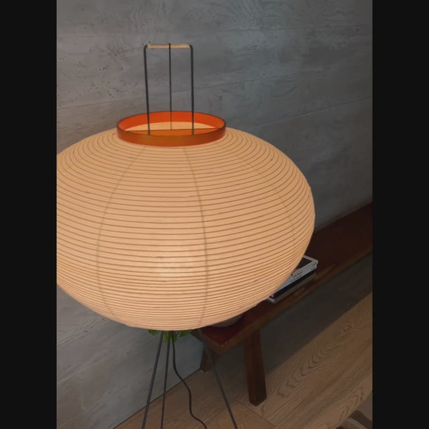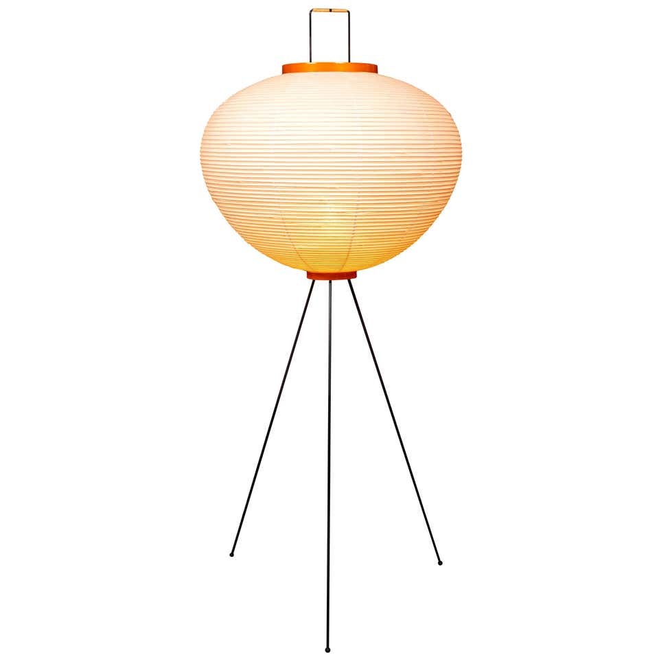 The shade is made from handmade washi paper and bamboo ribs with Noguchi Akari manufacturer's stamp. Highly collectible, Akari light sculptures by Isamu Noguchi are now considered icons of 1950s modern design. Designed by Noguchi in the 1950s, this vintage example is from a later production run that was still largely handmade by Ozeki, the original manufacturer in Gifu, Japan.