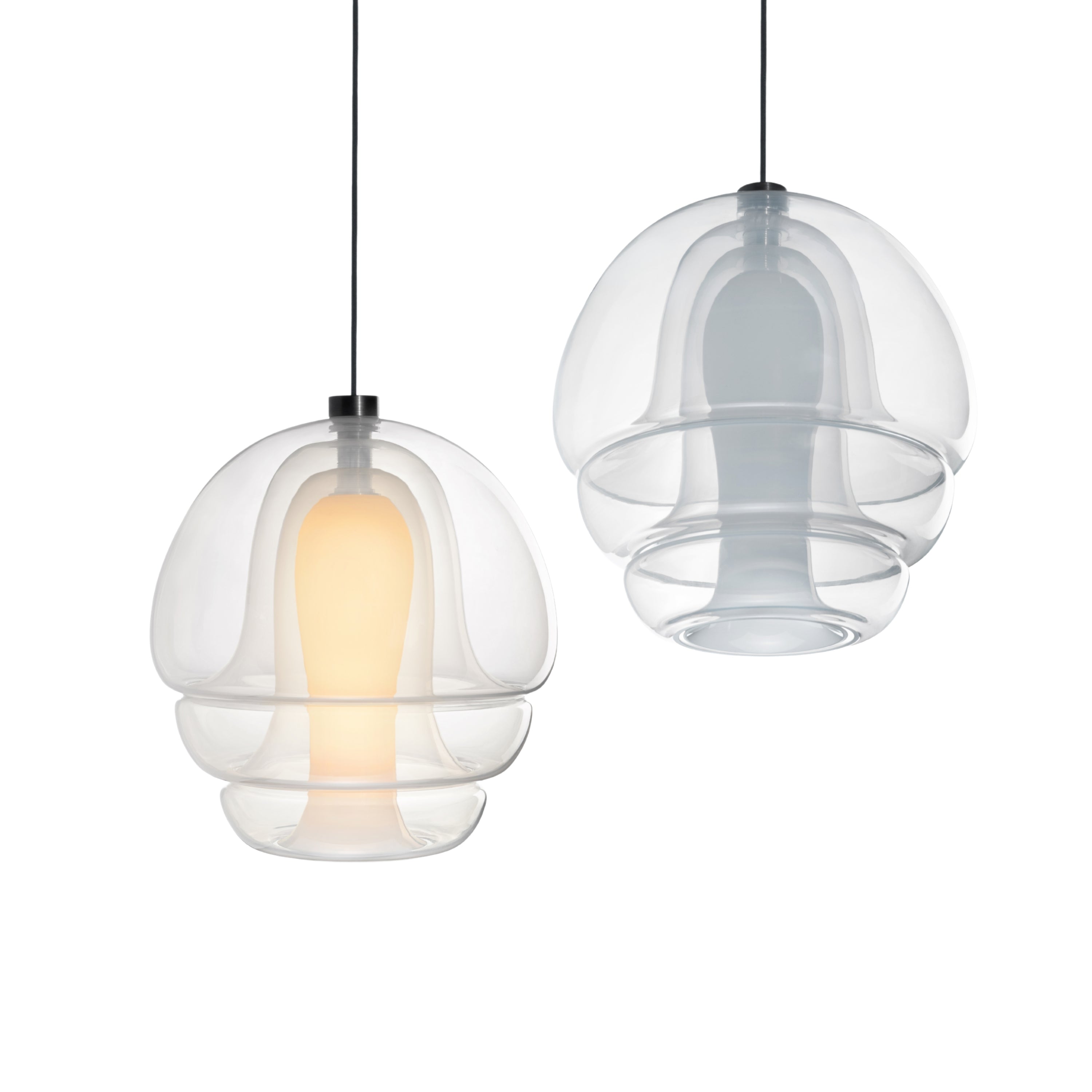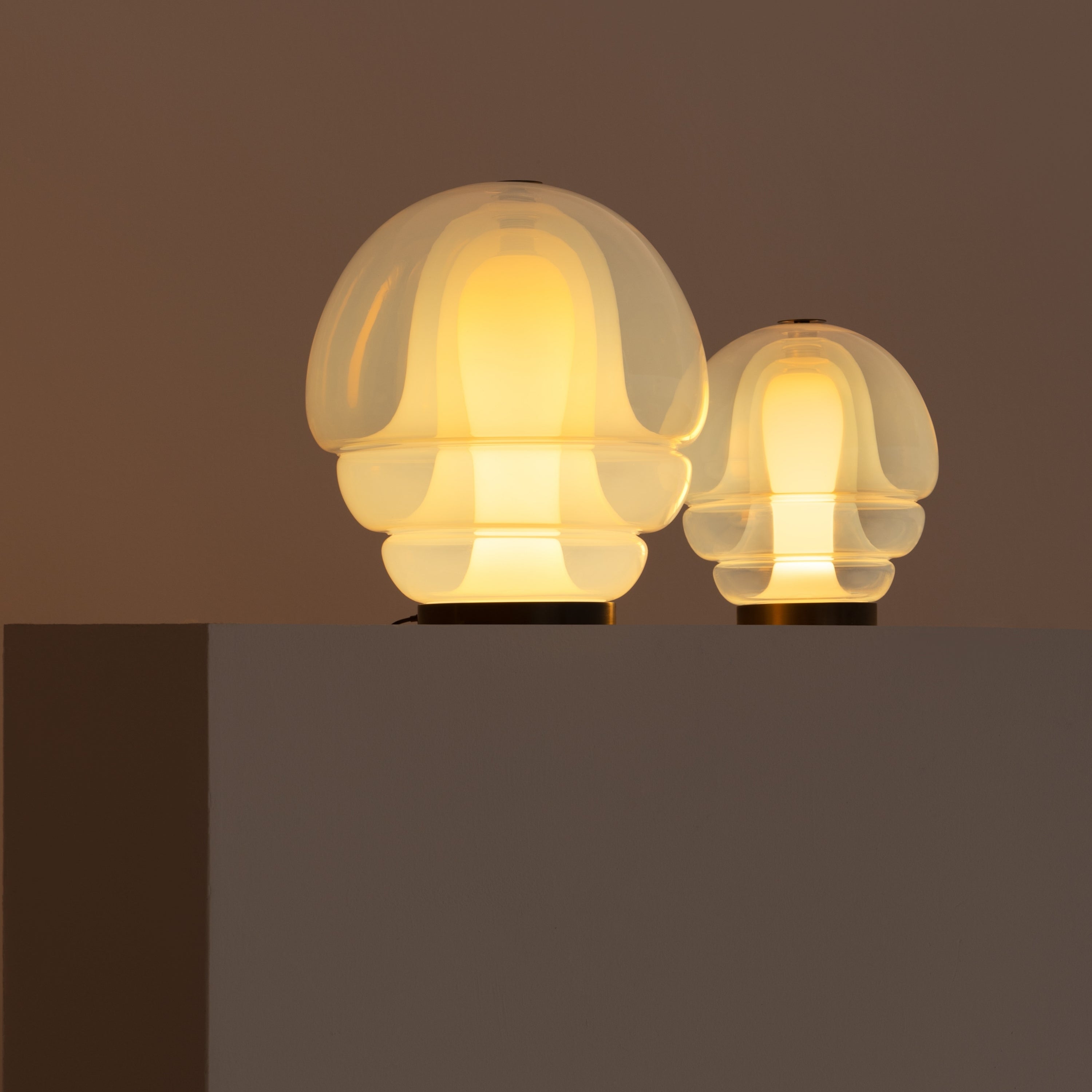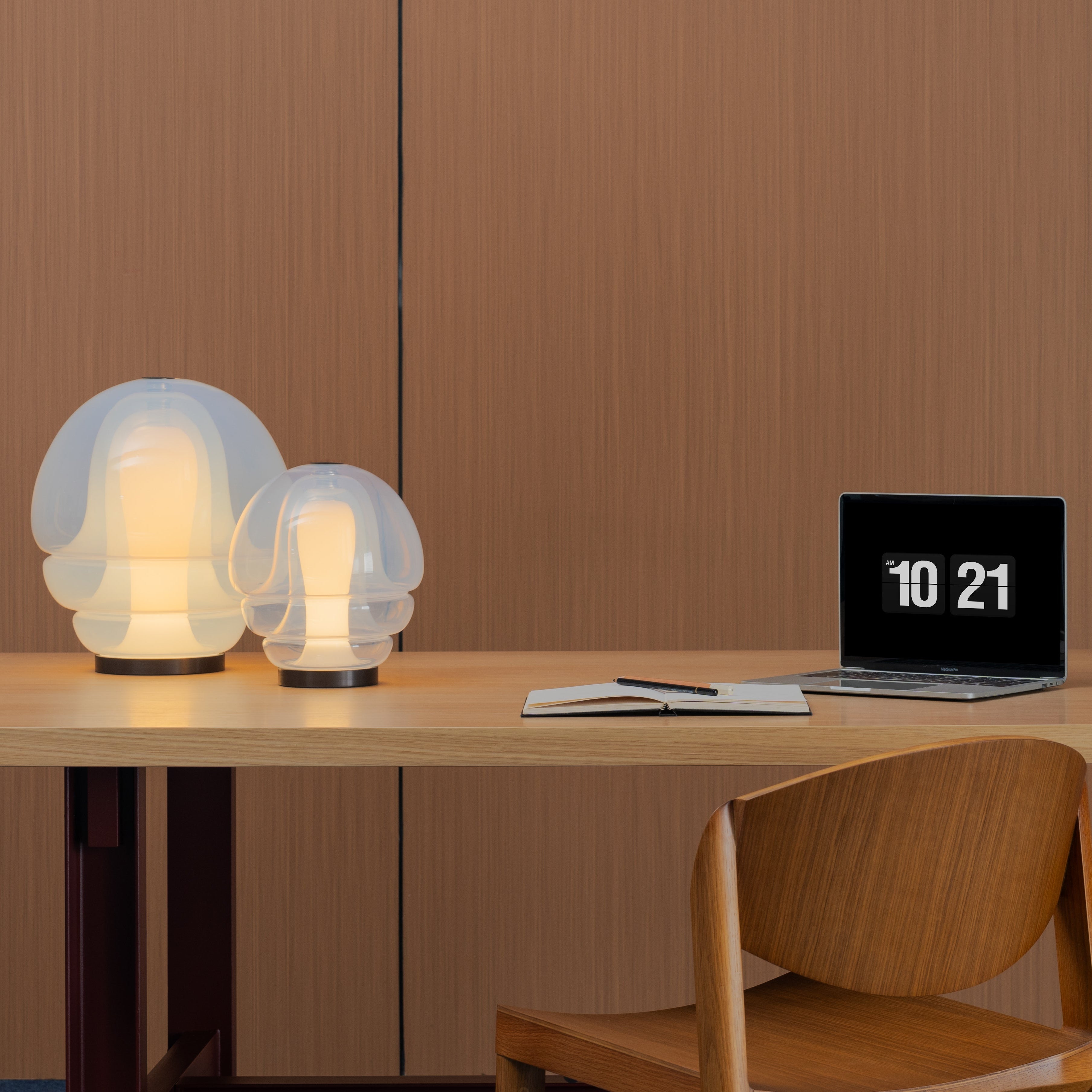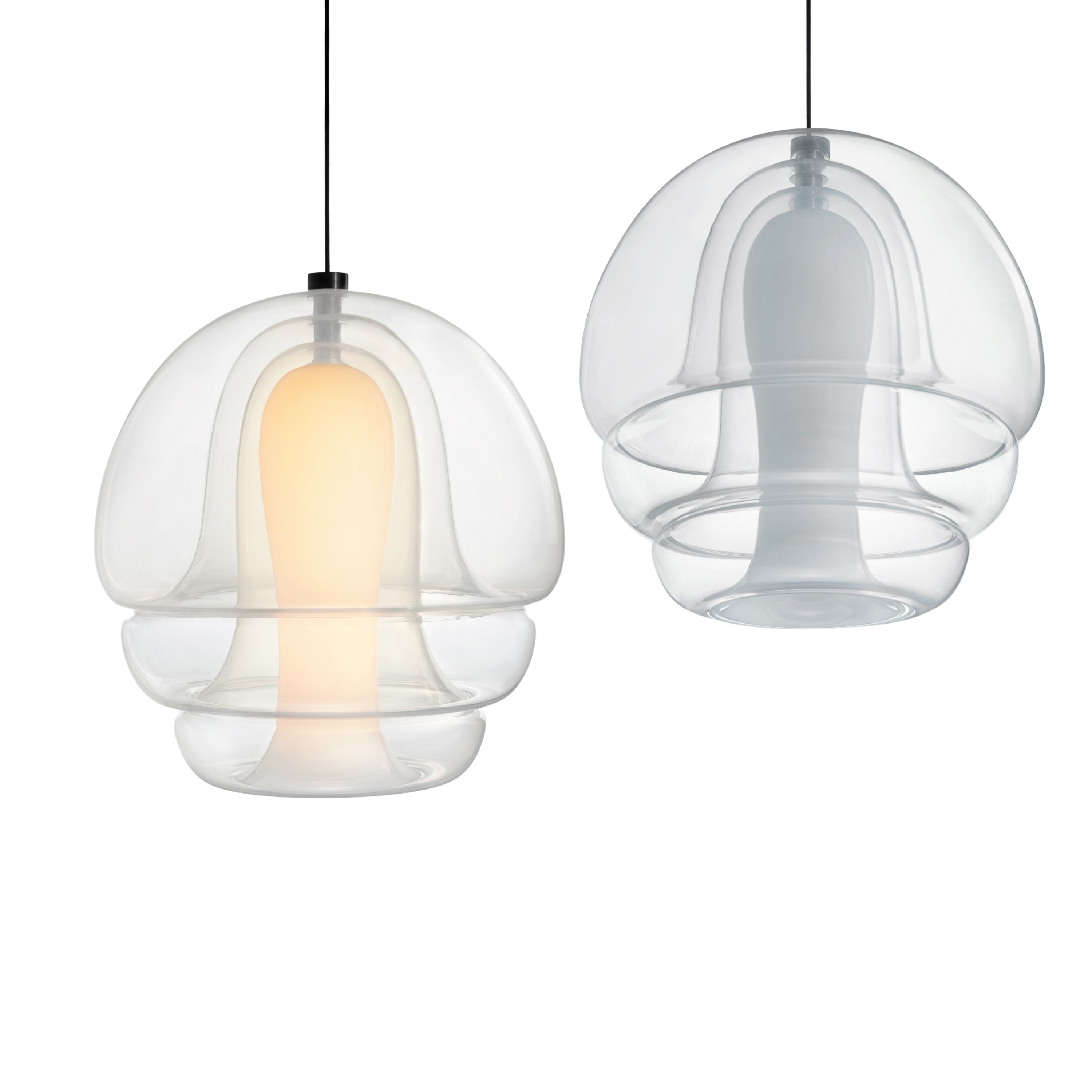 Originally designed in the 1960s by Carlo Nason of Italy, the Medusa has been brought back into production by Established & Sons in table, pendant and wall versions. Executed in multilayered, mouth-blown opaline glass, the lamp takes its name from its resemblance to a jellyfish. Using many of the same techniques as the 1960s original production run, the new Medusa features layers of glass with a white mist finish that merge to create a warm, inviting glow over the proprietary integrated LED. Subtle variations in the layered glass make each piece unique, reflecting the mastery of traditional Murano craftsmanship.