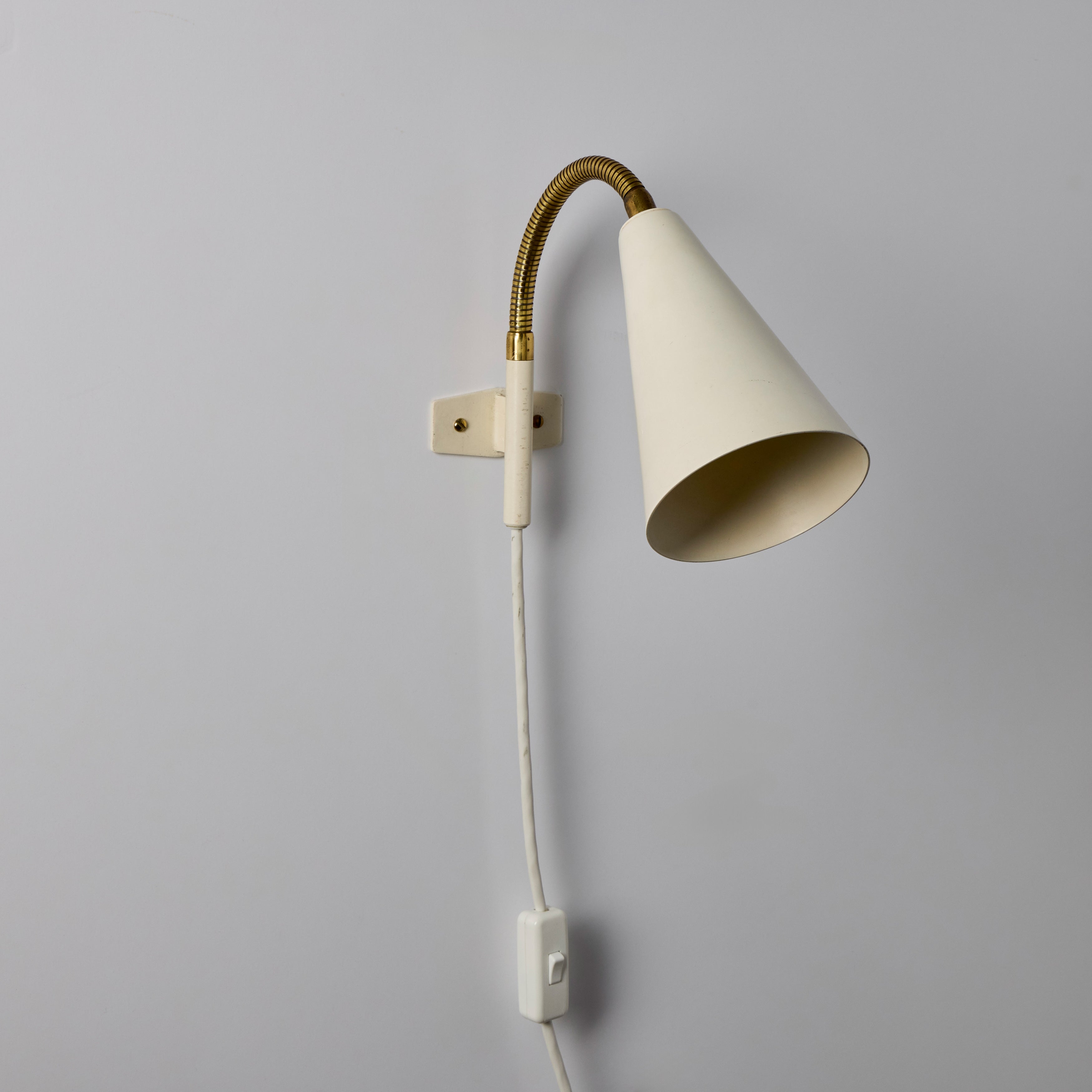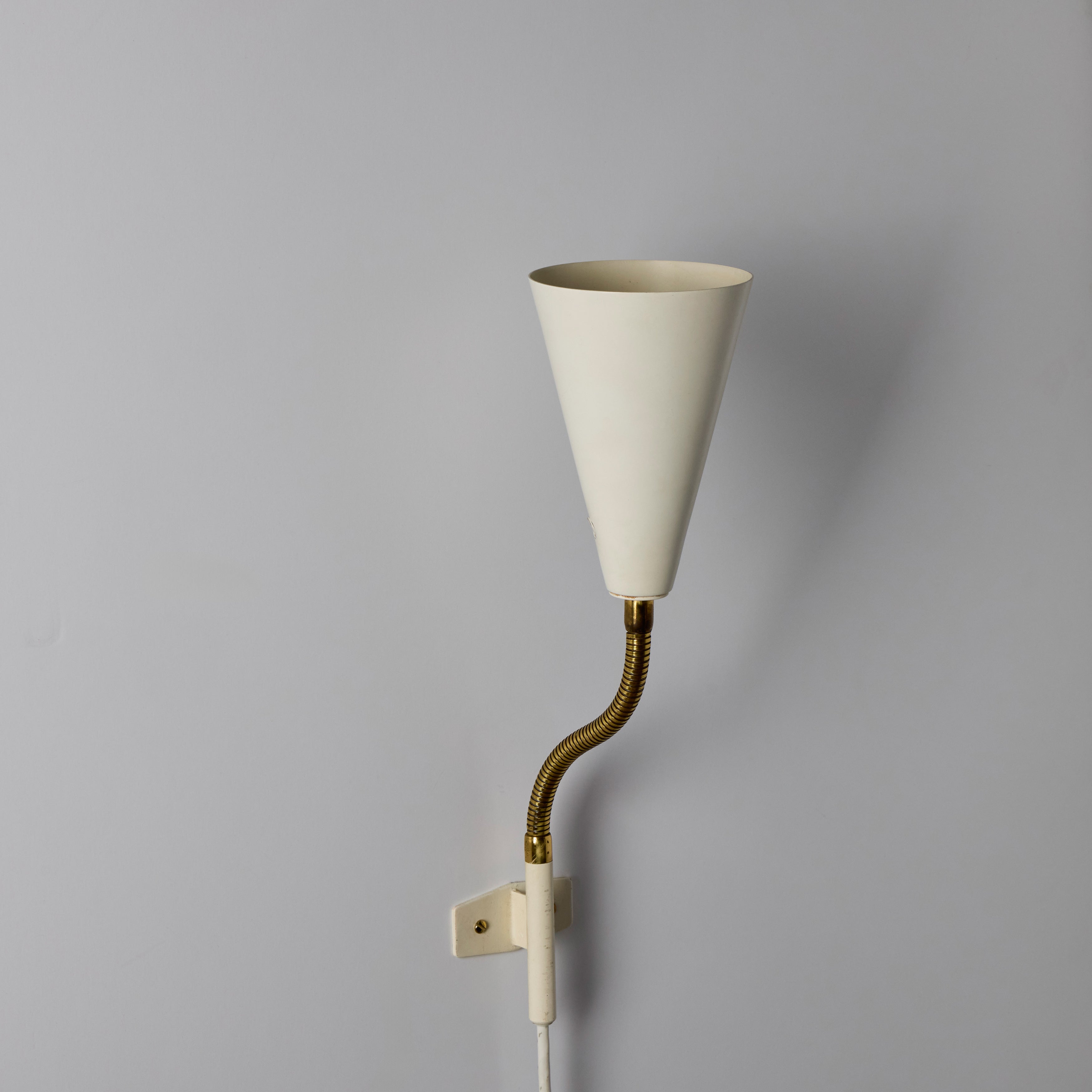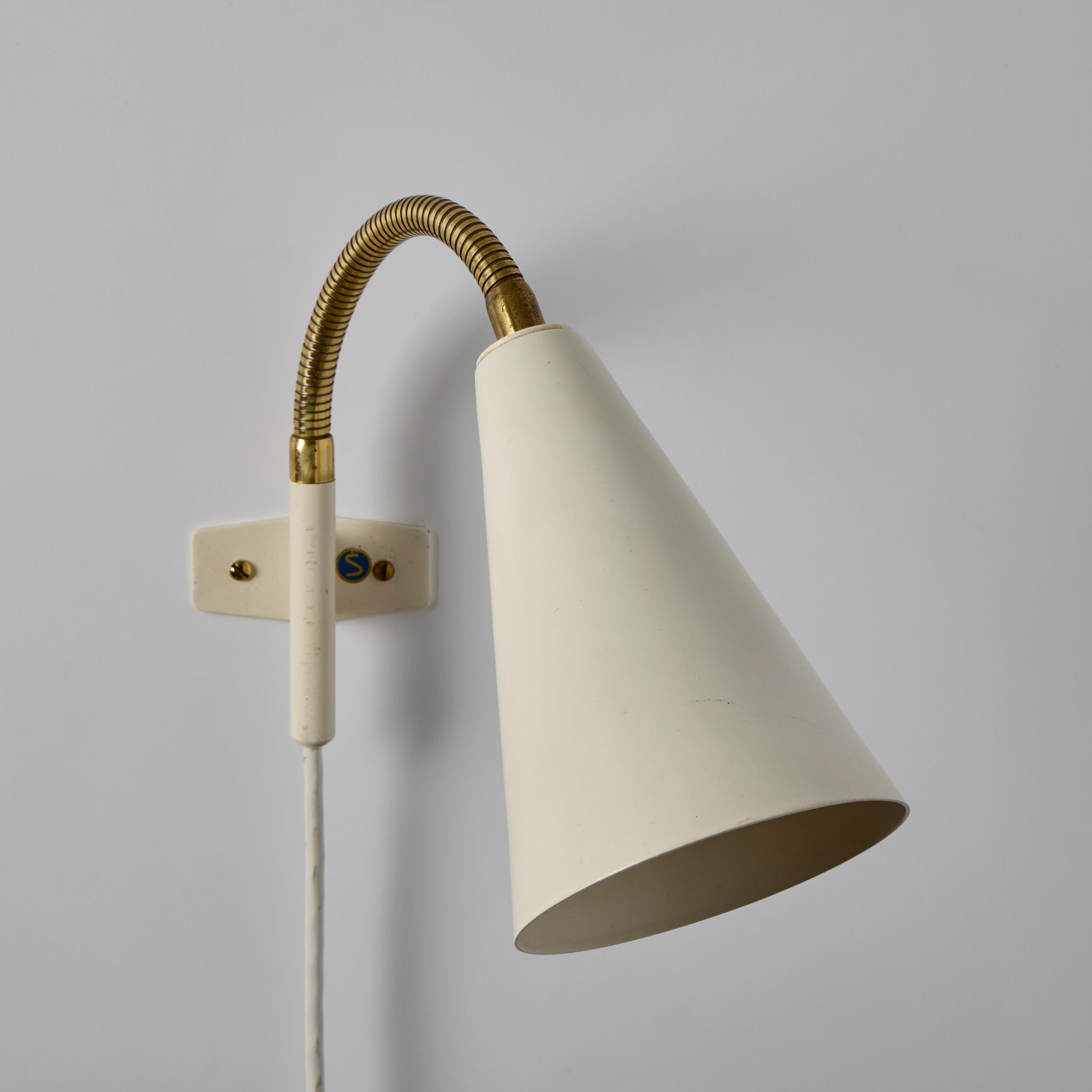 An functional midcentury plug-in wall lamp design executed in a white painted metal shade and wall bracket with a brass gooseneck arm. Shade can be moved on gooseneck arm as needed to create a focused pool of light. Bears all of the characteristic design signatures of Hans Agne Jakobsson including the on/off switch on the shade, and the "S" sticker designating a Swedish-made product. Brass mounting screws included. A highly adjustable piece ideal for bedside lighting. Height when folded down is 8 in. Fully extended upright is 18 in. Shade width 4.5 in. Depth when folded in is 11 in.