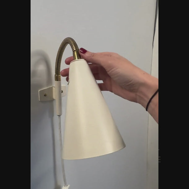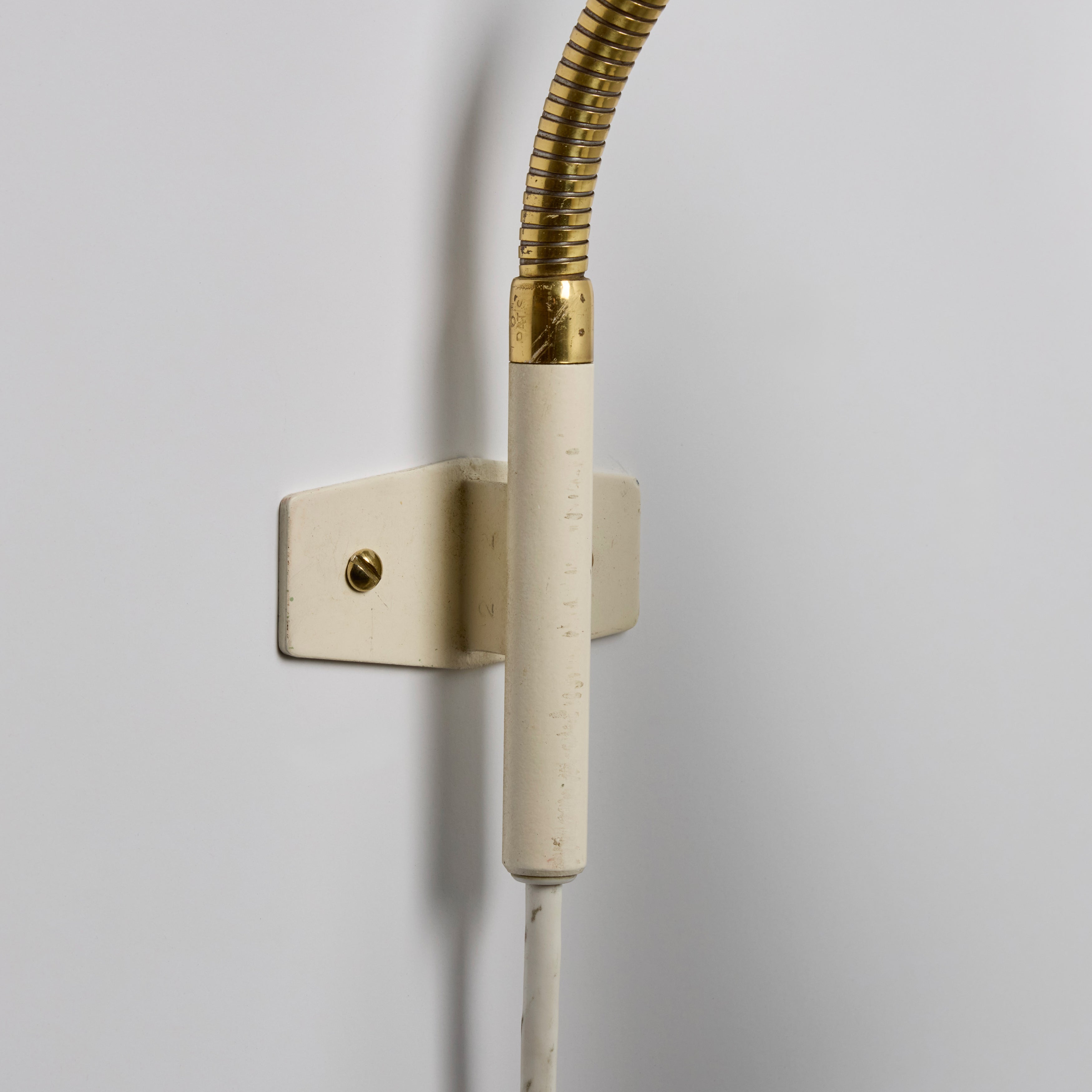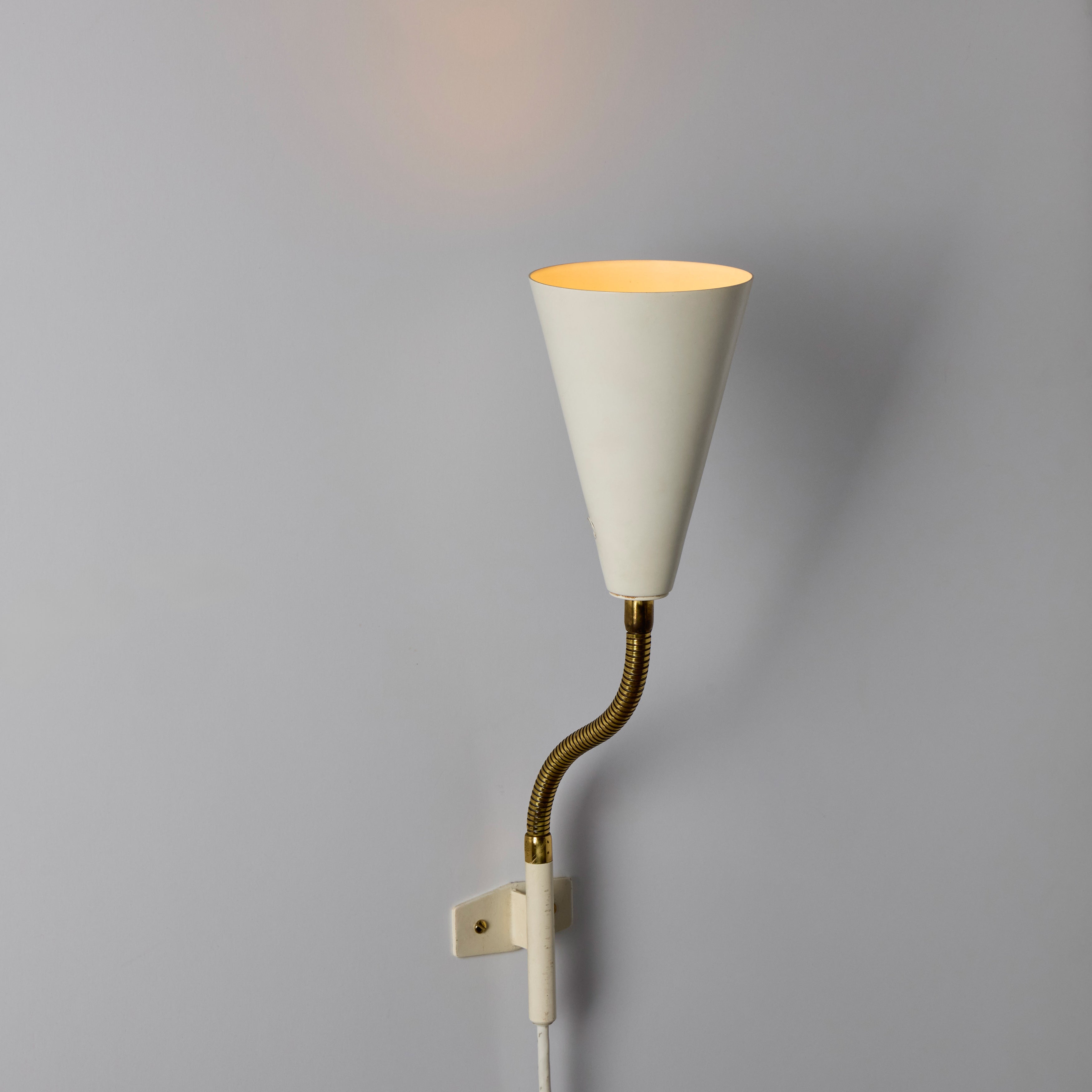 An functional midcentury plug-in wall lamp design executed in a white painted metal shade and wall bracket with a brass gooseneck arm. Shade can be moved on gooseneck arm as needed to create a focused pool of light. Bears all of the characteristic design signatures of Hans Agne Jakobsson including the on/off switch on the shade, and the "S" sticker designating a Swedish-made product. Brass mounting screws included. A highly adjustable piece ideal for bedside lighting. Height when folded down is 8 in. Fully extended upright is 18 in. Shade width 4.5 in. Depth when folded in is 11 in.