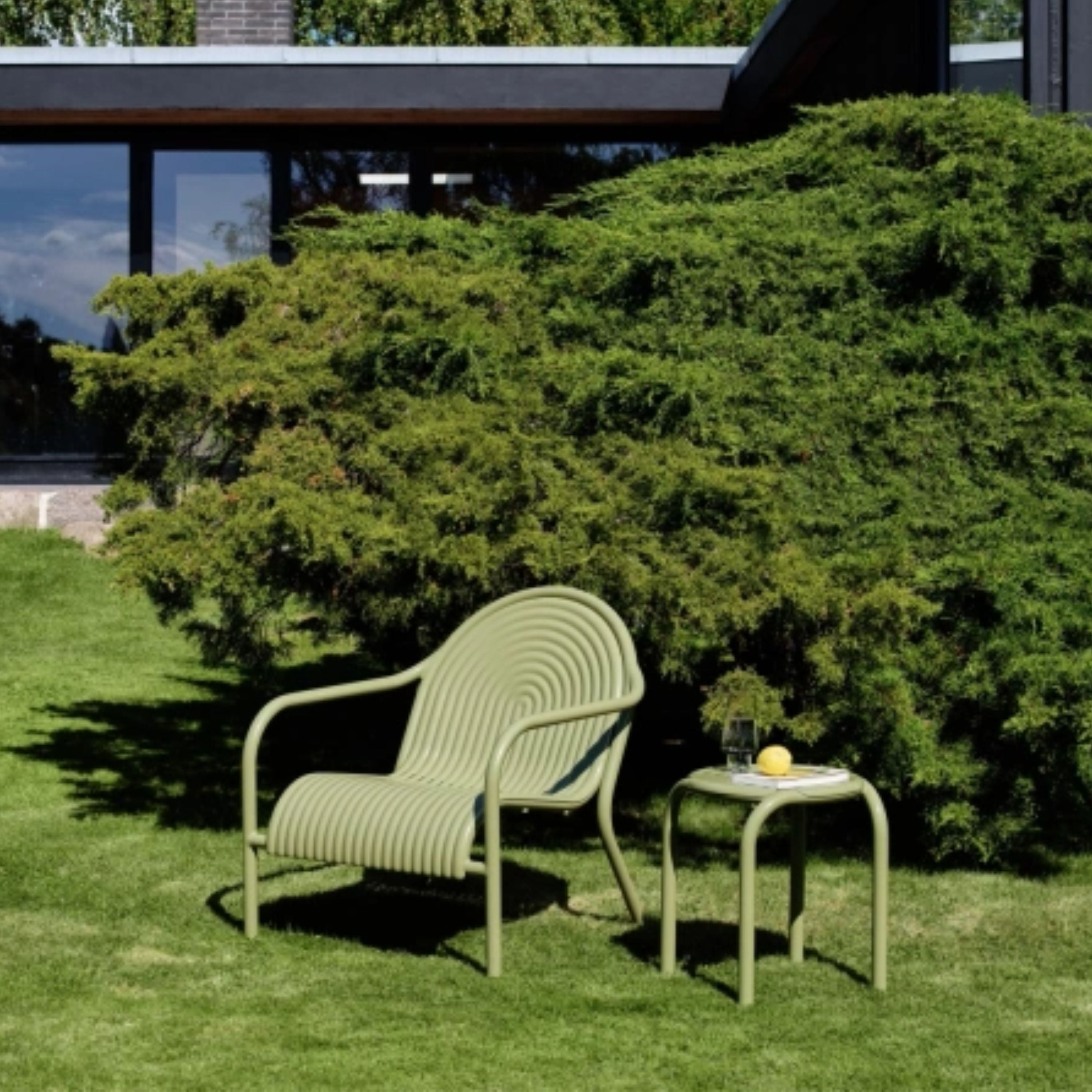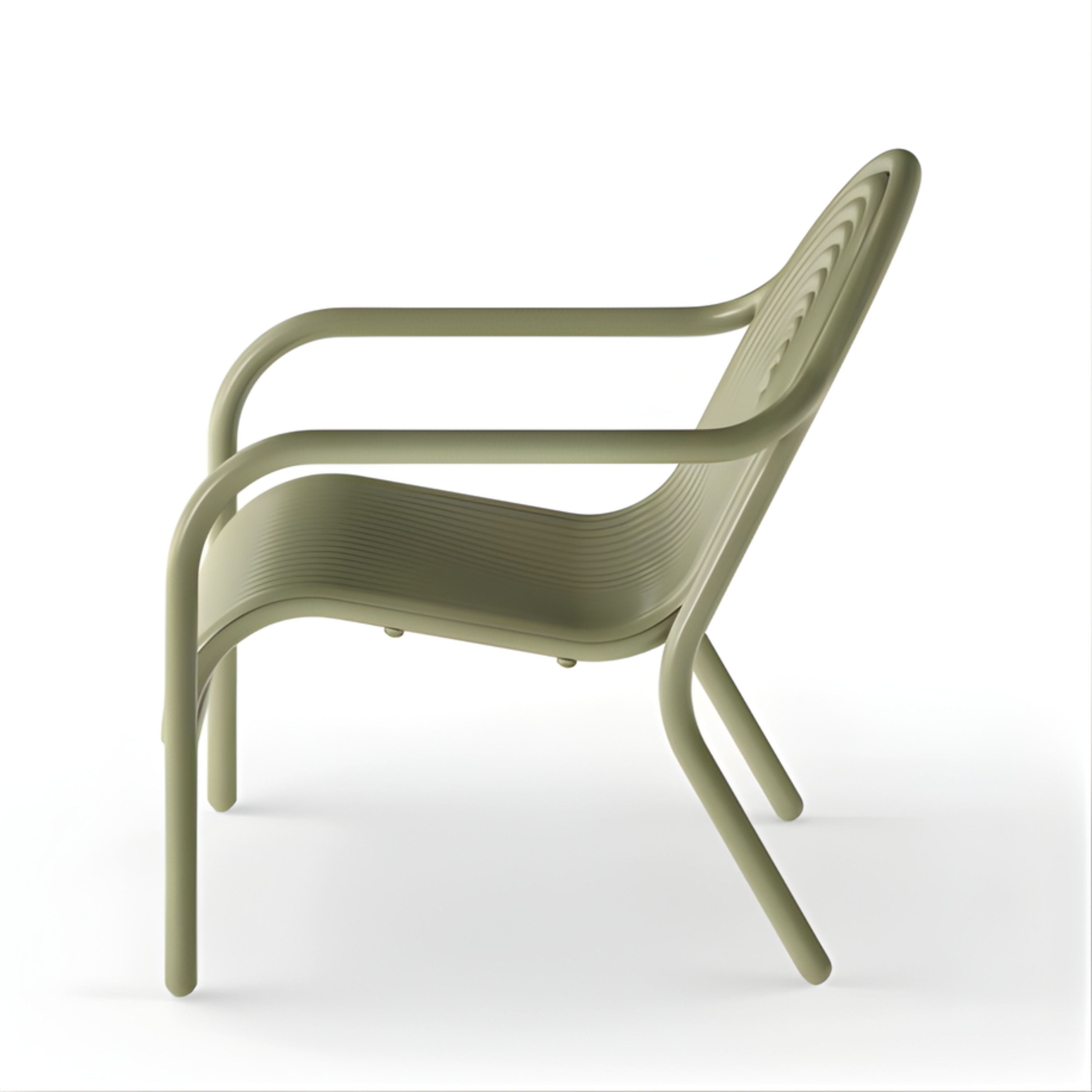 Available in unlimited quantities in two finishes: Putty or Moss. Optional seat cushions can be purchased separately. The Groove collection also includes dining chairs, stool and dining table-- available in separate listings.