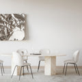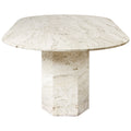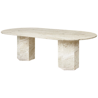 Executed in neutral white travertine from Italy, the hexagonal base and a elliptical top combine to create a striking sculptural piece that carries a subtle reference to the iconic columns of Ancient Greece. With a span of more than two meters, the table works in a wide range of interior gathering spaces.