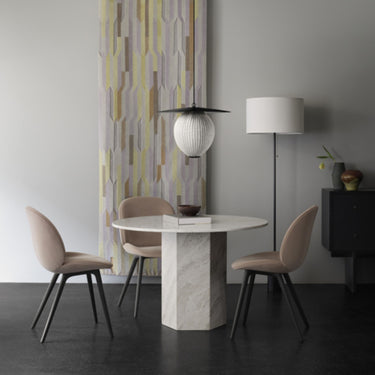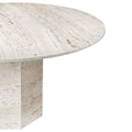 Designed by the Danish-Italian duo GamFratesi for GUBI, the 'Epic' table is a contemporary take on classic architectural elements. Executed in two pieces of solid travertine, the hexagonal base and a circular top combine to create a striking sculptural piece that carries a subtle reference to the iconic columns of Ancient Greece.