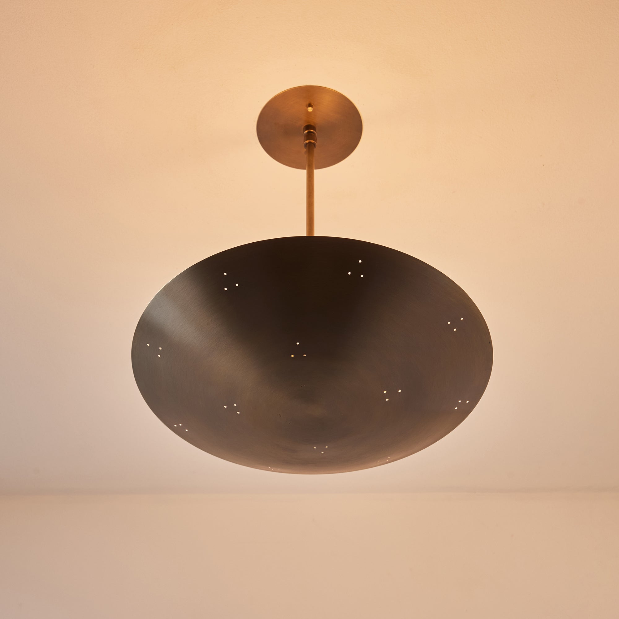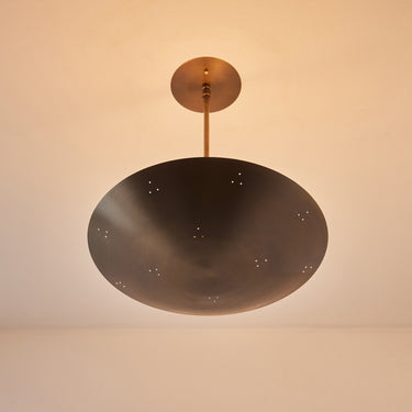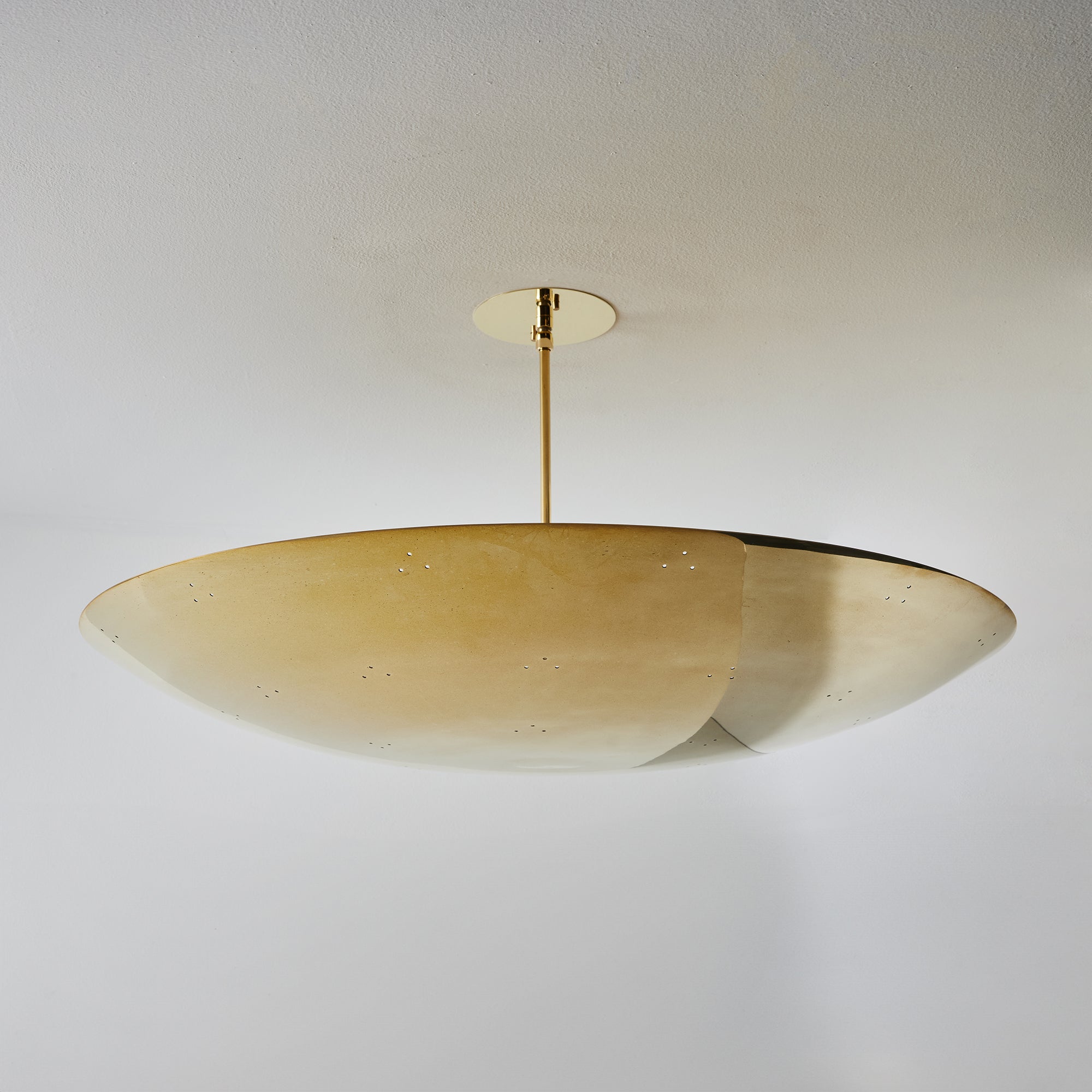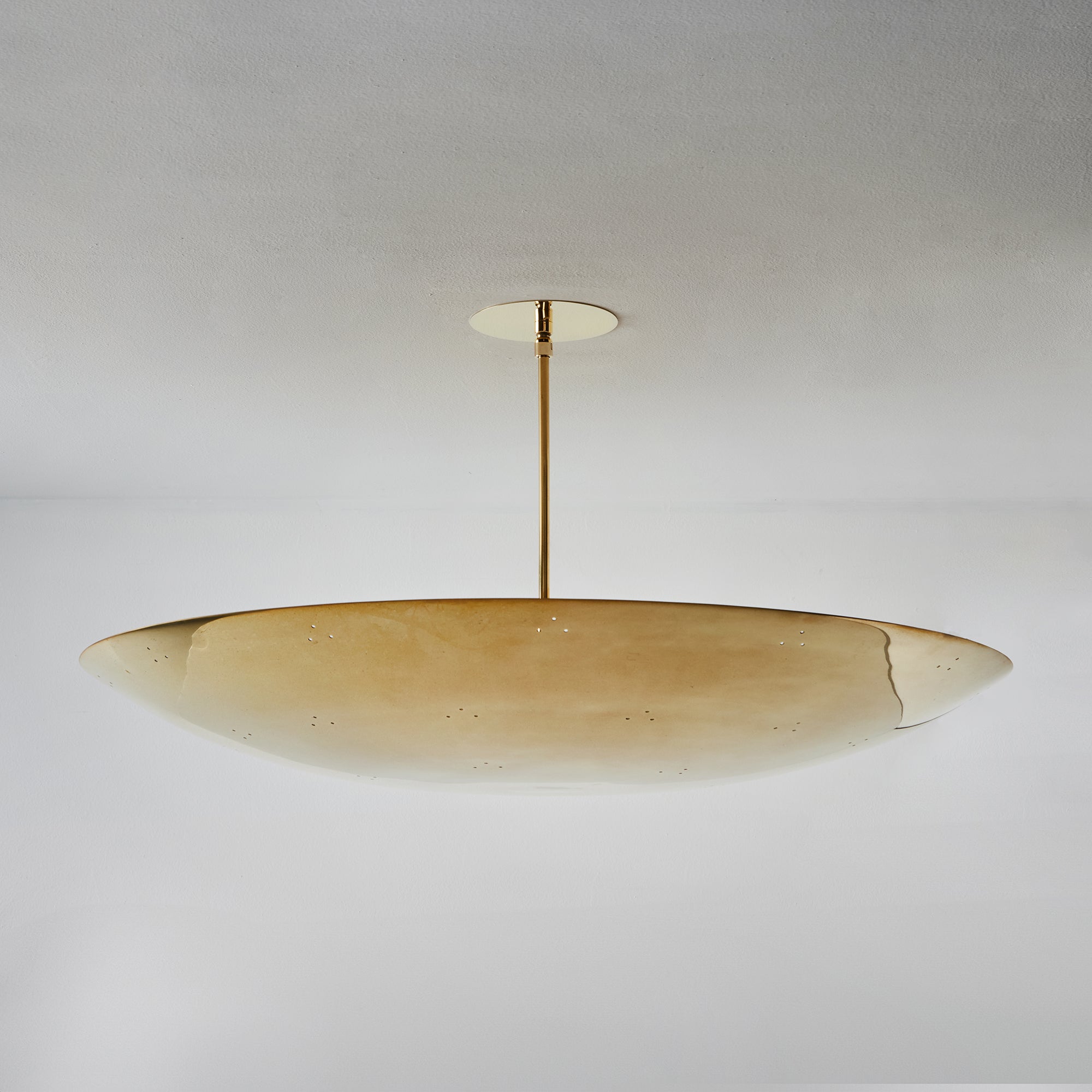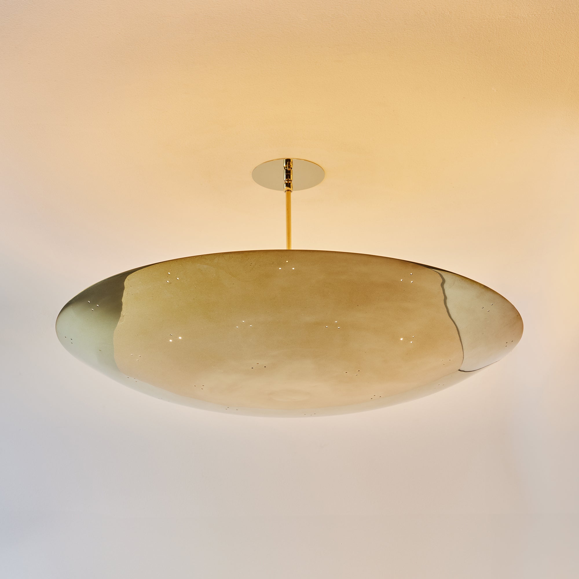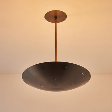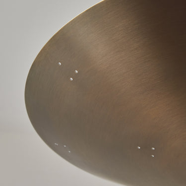 Please note that the chemical process used for the patinated brass finish can result in unique variation from piece to piece including differing hues, streaking, spotting, discoloration, patchiness and other irregularities outside and inside the dome. Patinas can also change over time due to handling, storage, and exposure to the elements, resulting in further variation and irregularities. Patination is a dynamic process which evolves in beautifully unpredictable ways to create a unique look with its own special characteristics. The patinated and polished brass versions of this lamp are executed in raw unlacquered brass; as a result, their patina will change over time with exposure to the elements or to human touch. The handcrafted perforation layout of each lamp can show variation, as the pattern is dependent upon the diameter of the lamp.