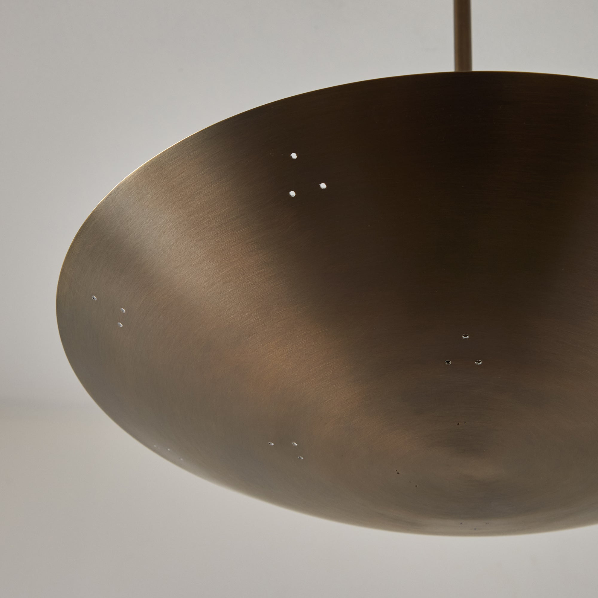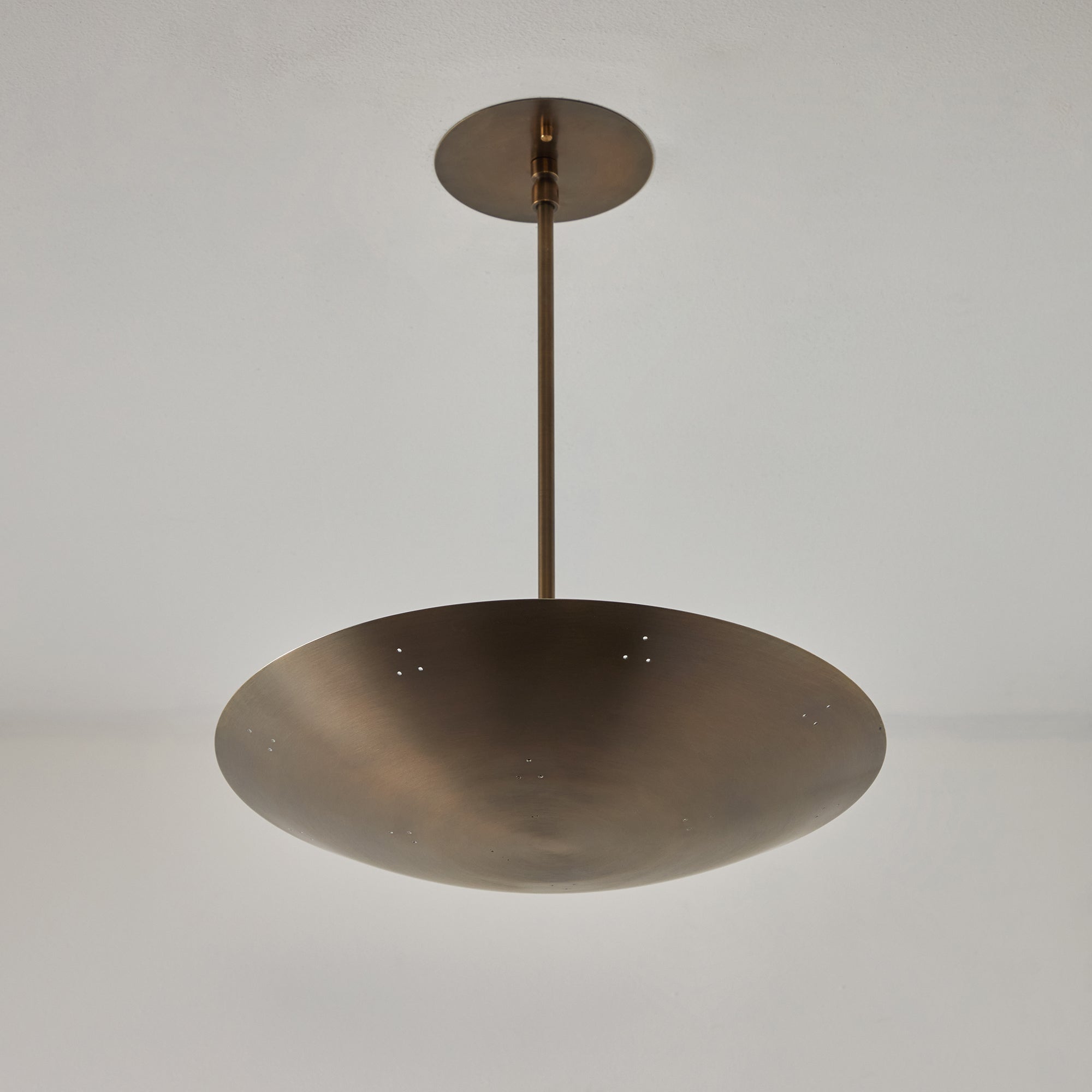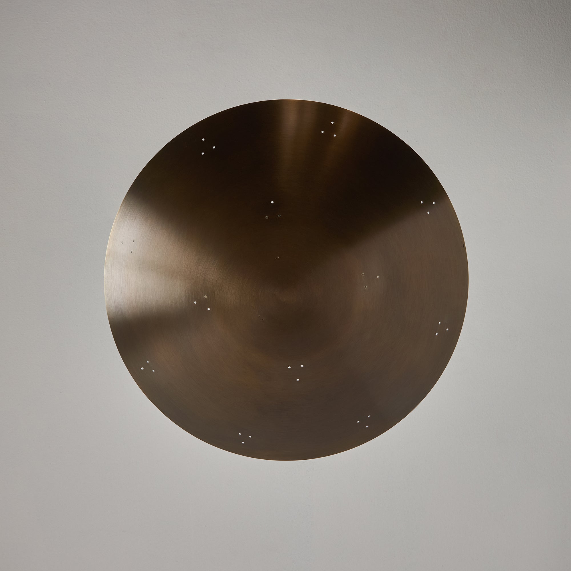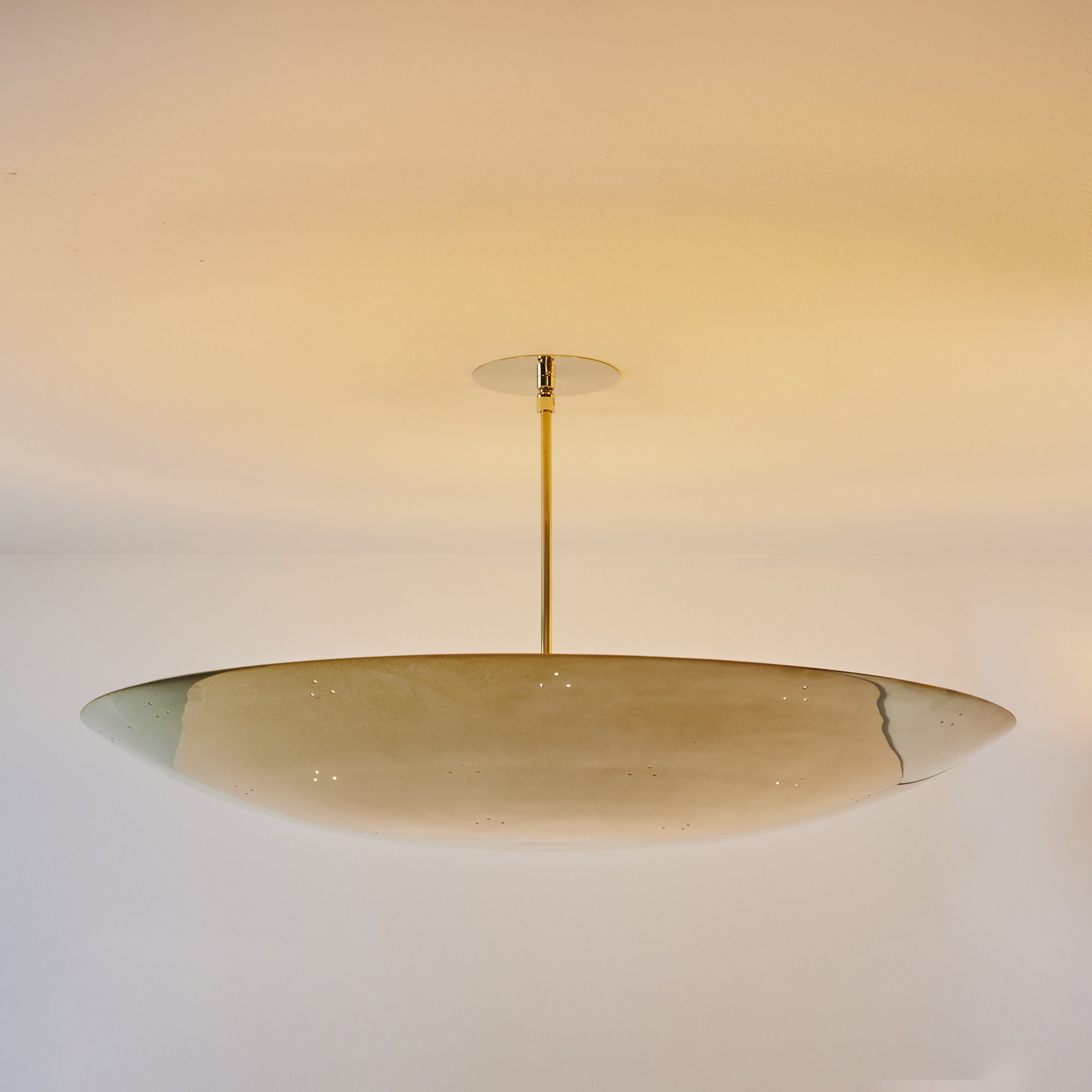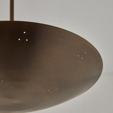 Please note that the chemical process used for the patinated brass finish can result in unique variation from piece to piece including differing hues, streaking, spotting, discoloration, patchiness and other irregularities outside and inside the dome. Patinas can also change over time due to handling, storage, and exposure to the elements, resulting in further variation and irregularities. Patination is a dynamic process which evolves in beautifully unpredictable ways to create a unique look with its own special characteristics. The patinated and polished brass versions of this lamp are executed in raw unlacquered brass; as a result, their patina will change over time with exposure to the elements or to human touch. The handcrafted perforation layout of each lamp can show variation, as the pattern is dependent upon the diameter of the lamp.