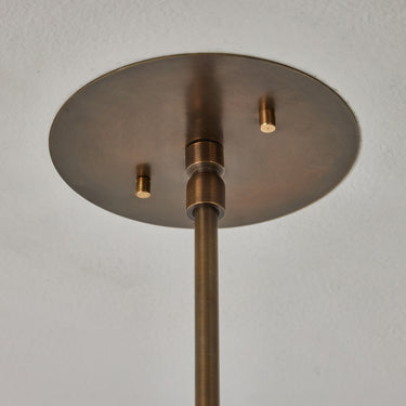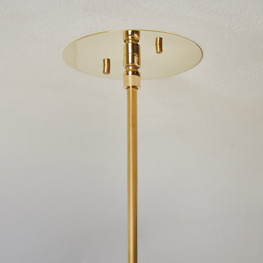 Hand-fabricated in Los Angeles, these highly refined chandeliers are reminiscent of the iconic Mid-Century Finnish designs of Paavo Tynell and Lisa Johansson Pape. Executed in perforated brass with a finish in choice of polished brass, patinated brass, painted white, or painted black. Polished and painted variants ship with a polished brass canopy and stem; patinated brass variant ships with matching patinated canopy and stem.