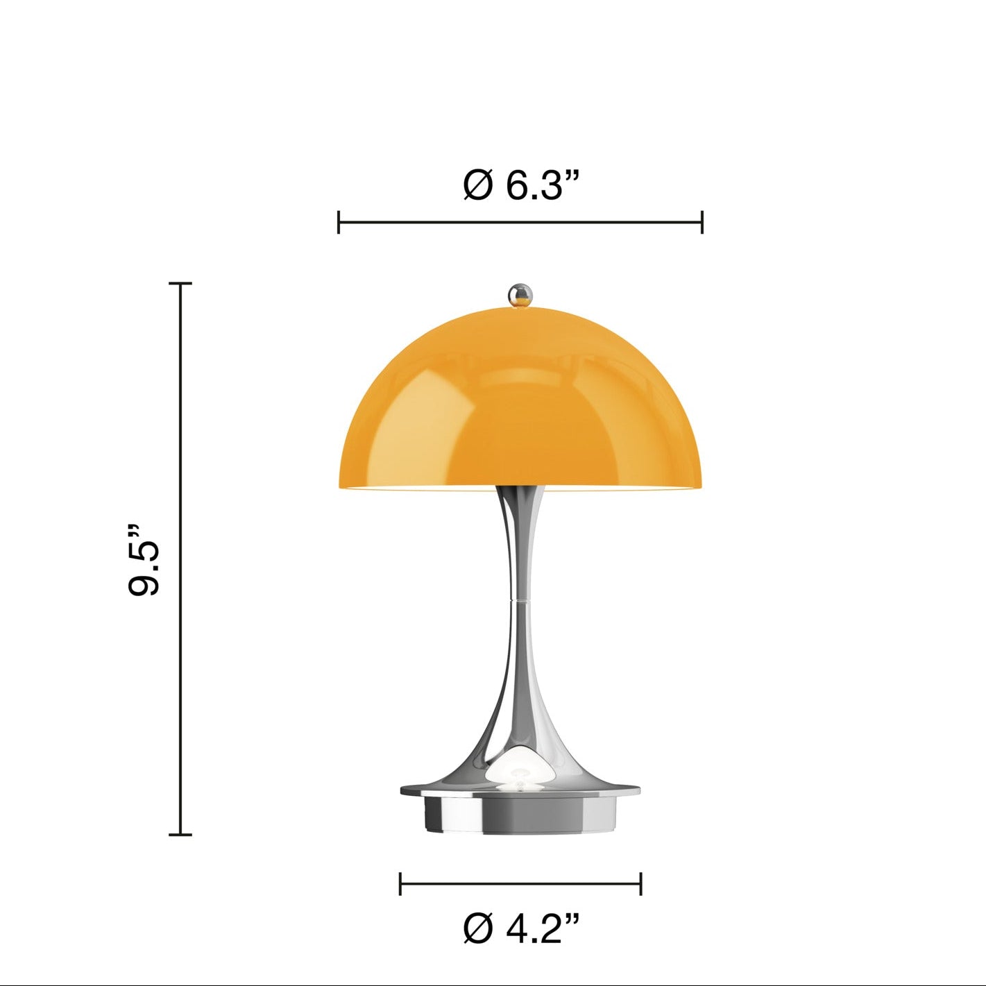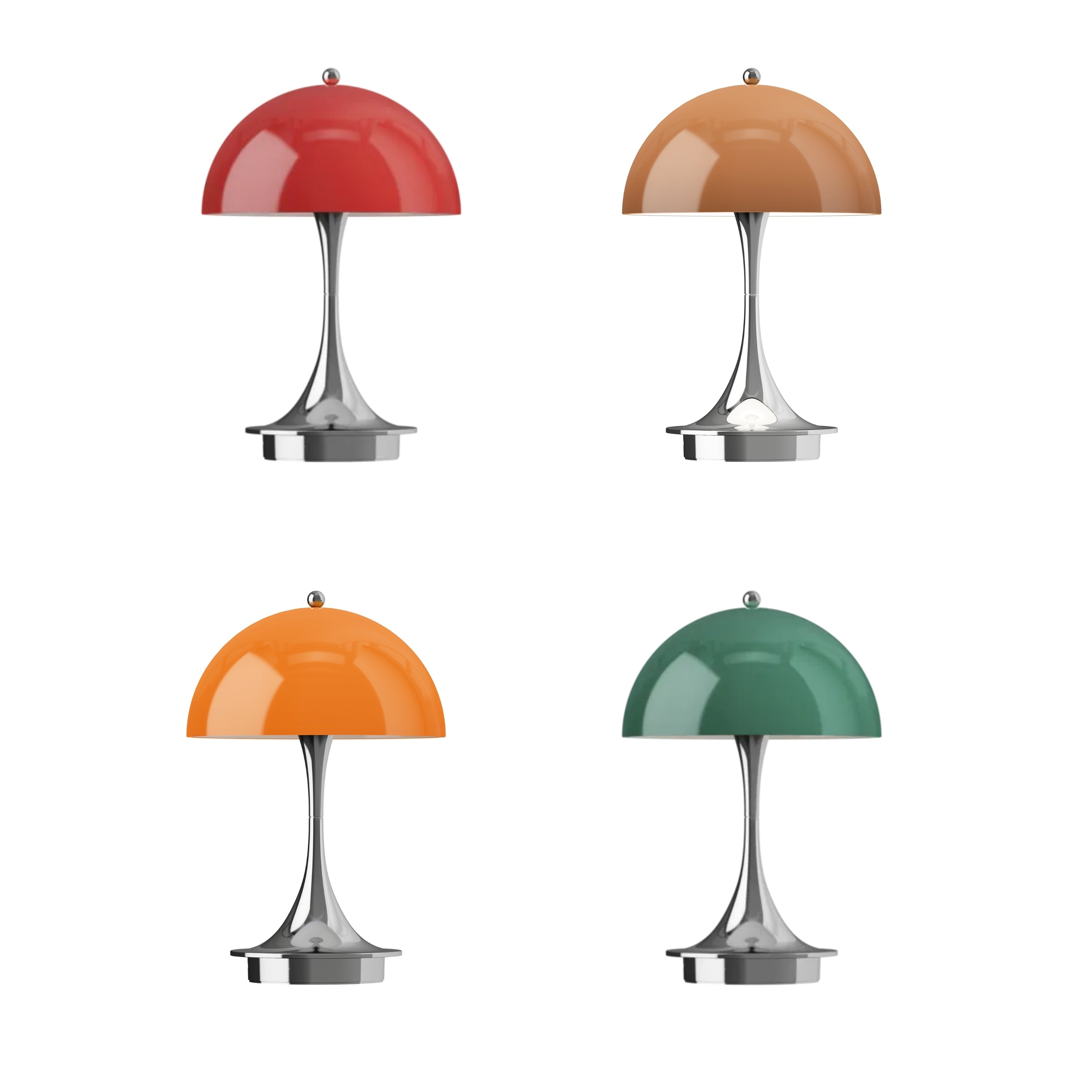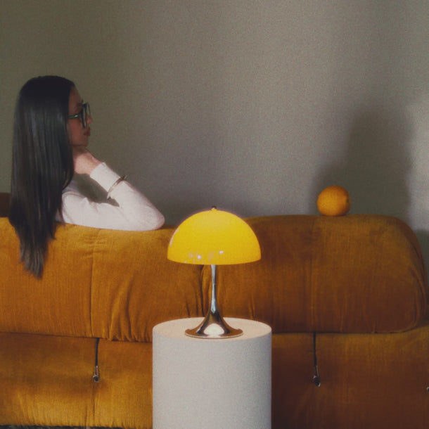 Executed in a durable injection molded polymer in the original 1970s colorway, the heritage edition casts a delicate glow. The 'Panthella 160' is a unique battery-powered table lamp lights up any space without glare. Now in its third version with new colors and a robust rechargeable via USB-C battery, this scaled-down version of the original Panthella table lamp can be used indoors and out.