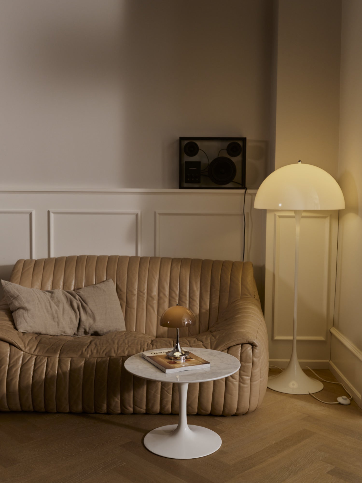 The 'Panthella 160' lamp was designed in 1971 by Danish designer Verner Panton and remains one of his most iconic designs. Panton is known for his larger-than-life personality and sought to create an organic shaped lamp that provides glare-free light, with both the stand and shade serving as light reflectors.